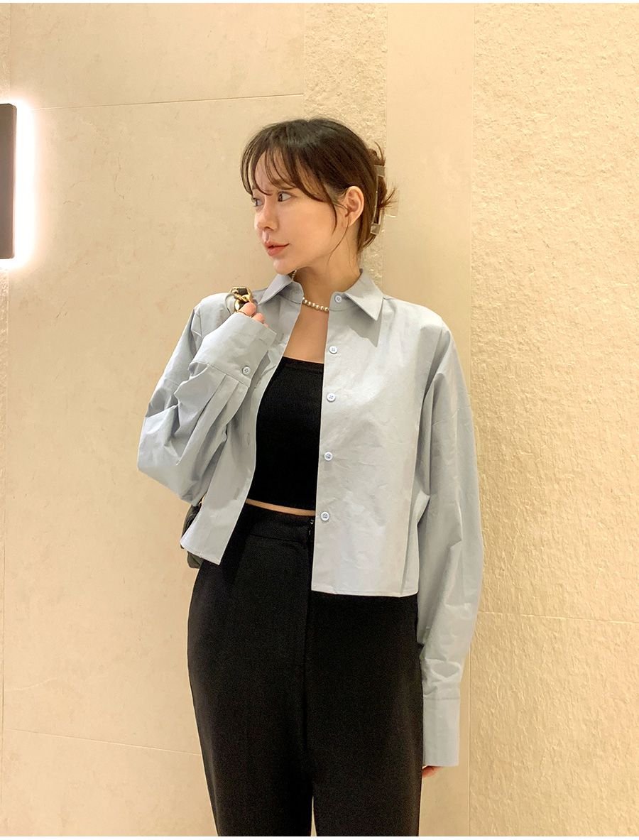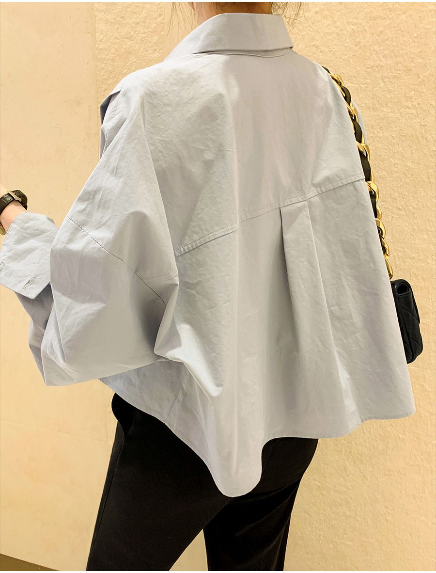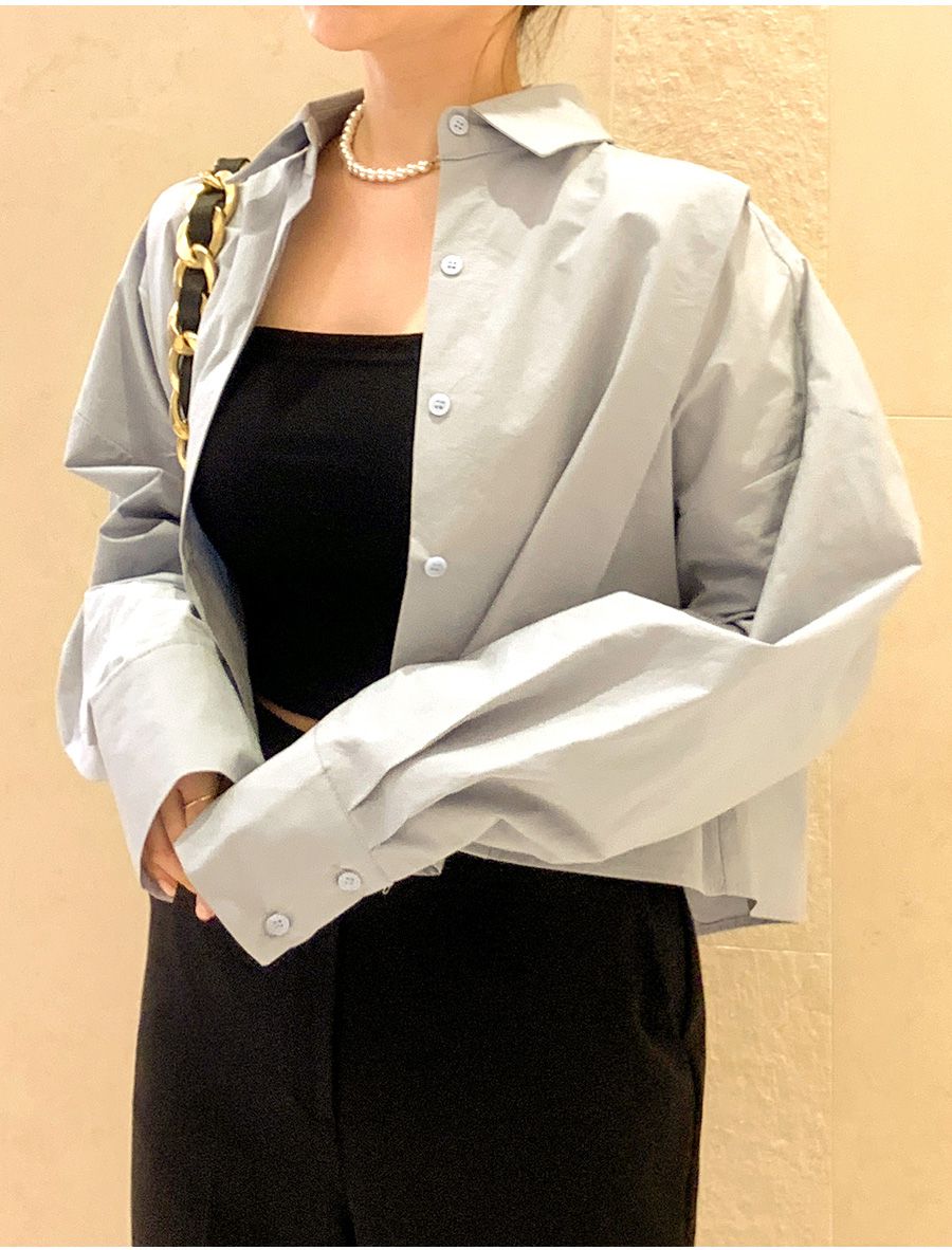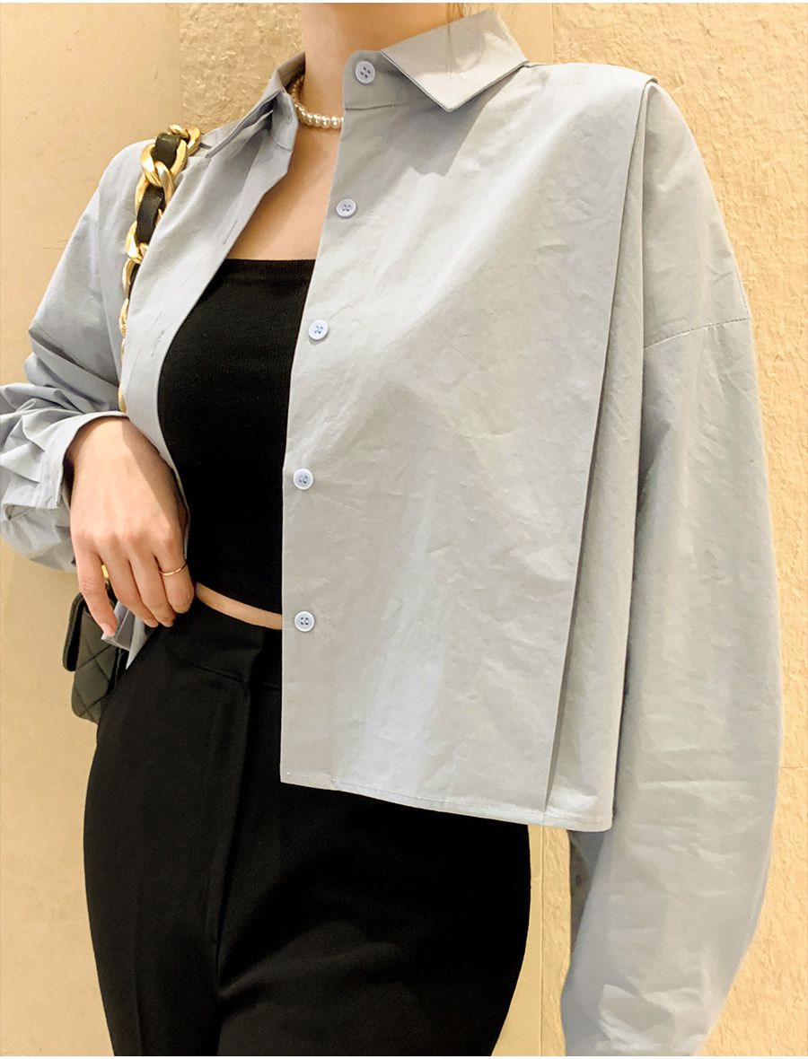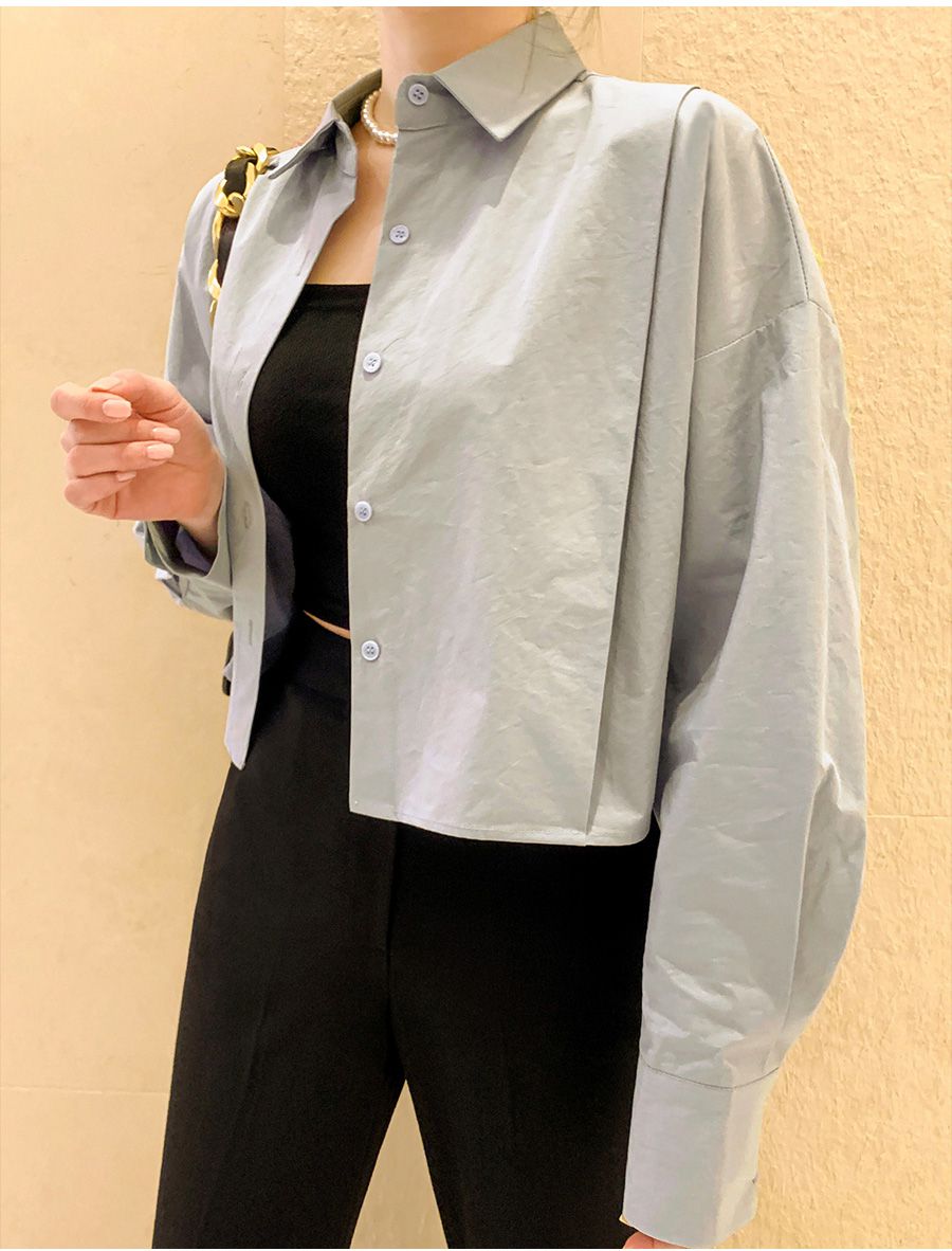 【C56103】韓國SPB 立體褶襯衫上衣-素面寬鬆短版開襟排釦長袖外套