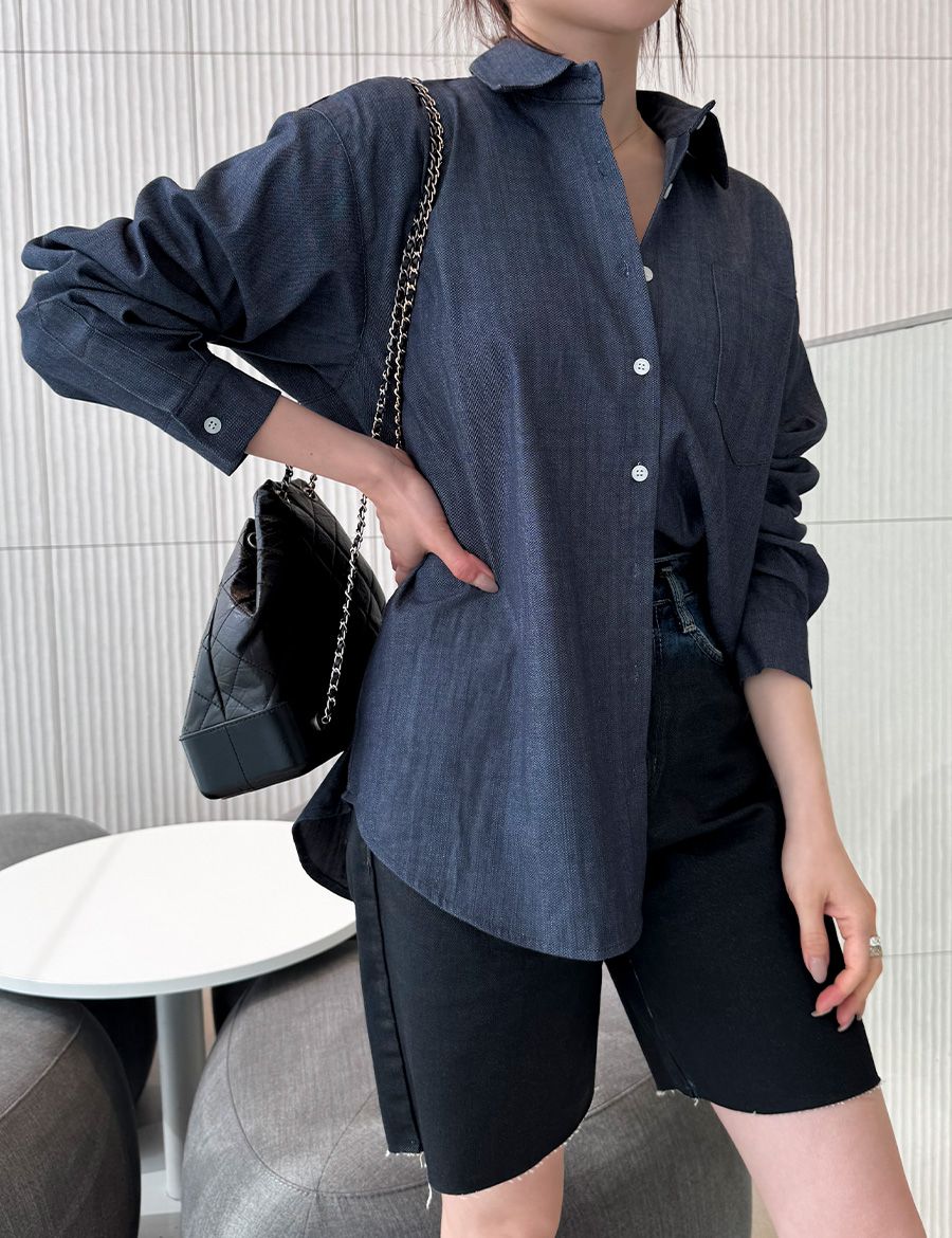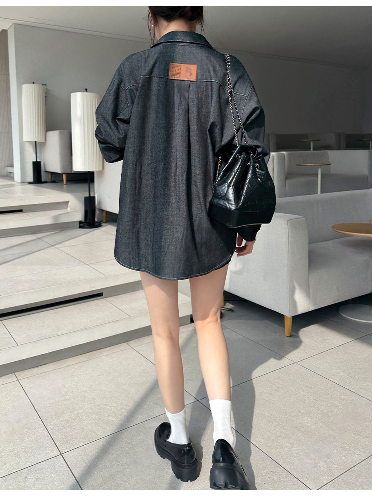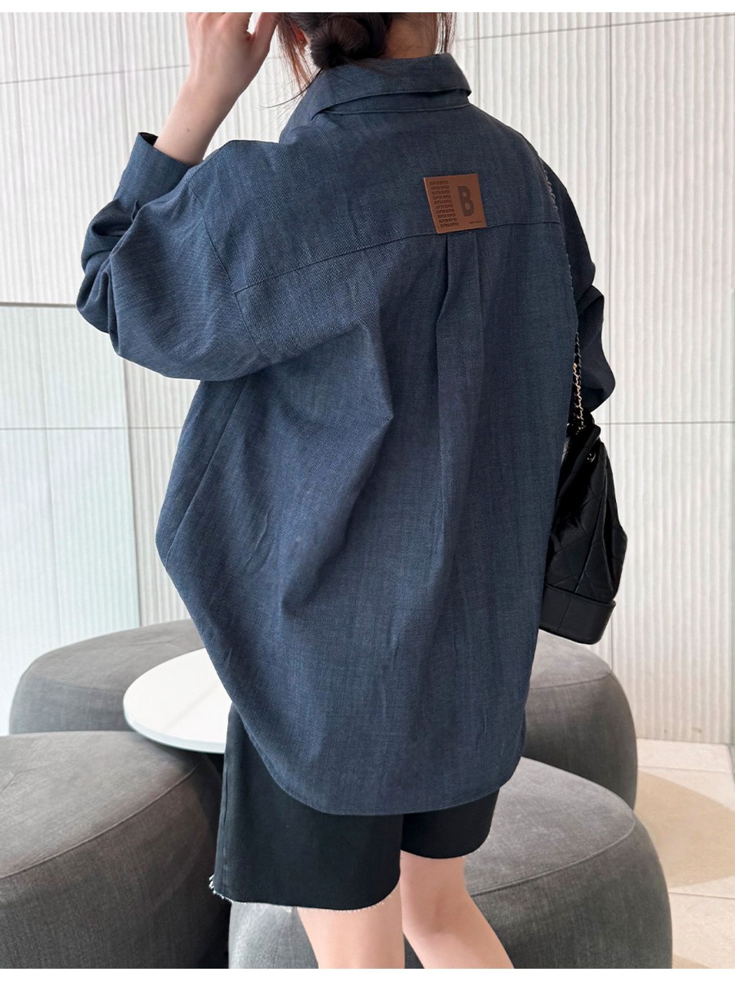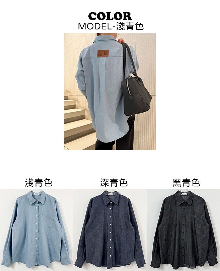 字母皮革標籤/前短後長/弧形下襬/胸前口袋/開襟排釦/寬鬆大尺碼上衣/長版上衣 - 休閒居家OL上班族牛仔襯衫外套皮革標牛仔襯衫長袖上衣長袖外套