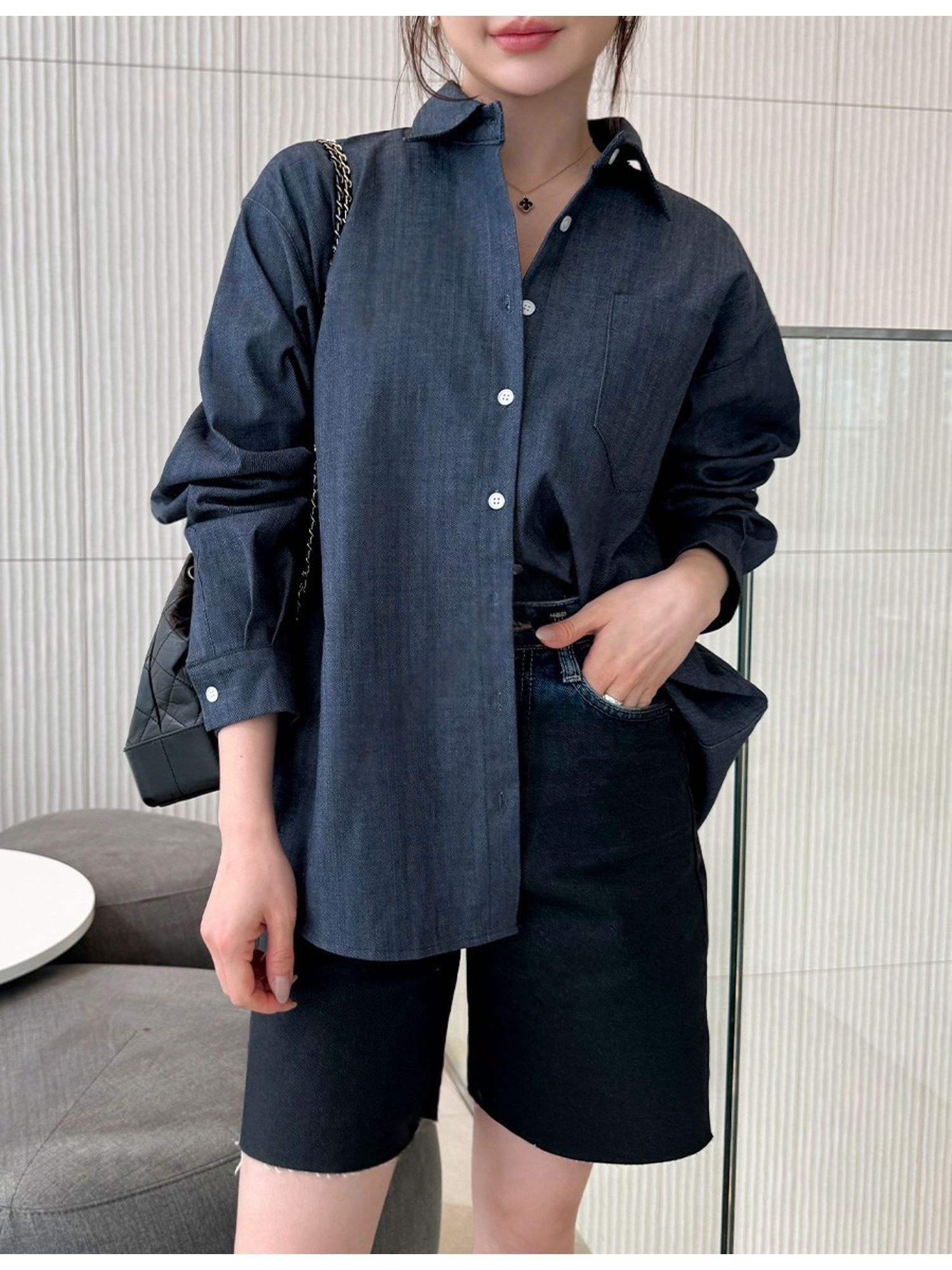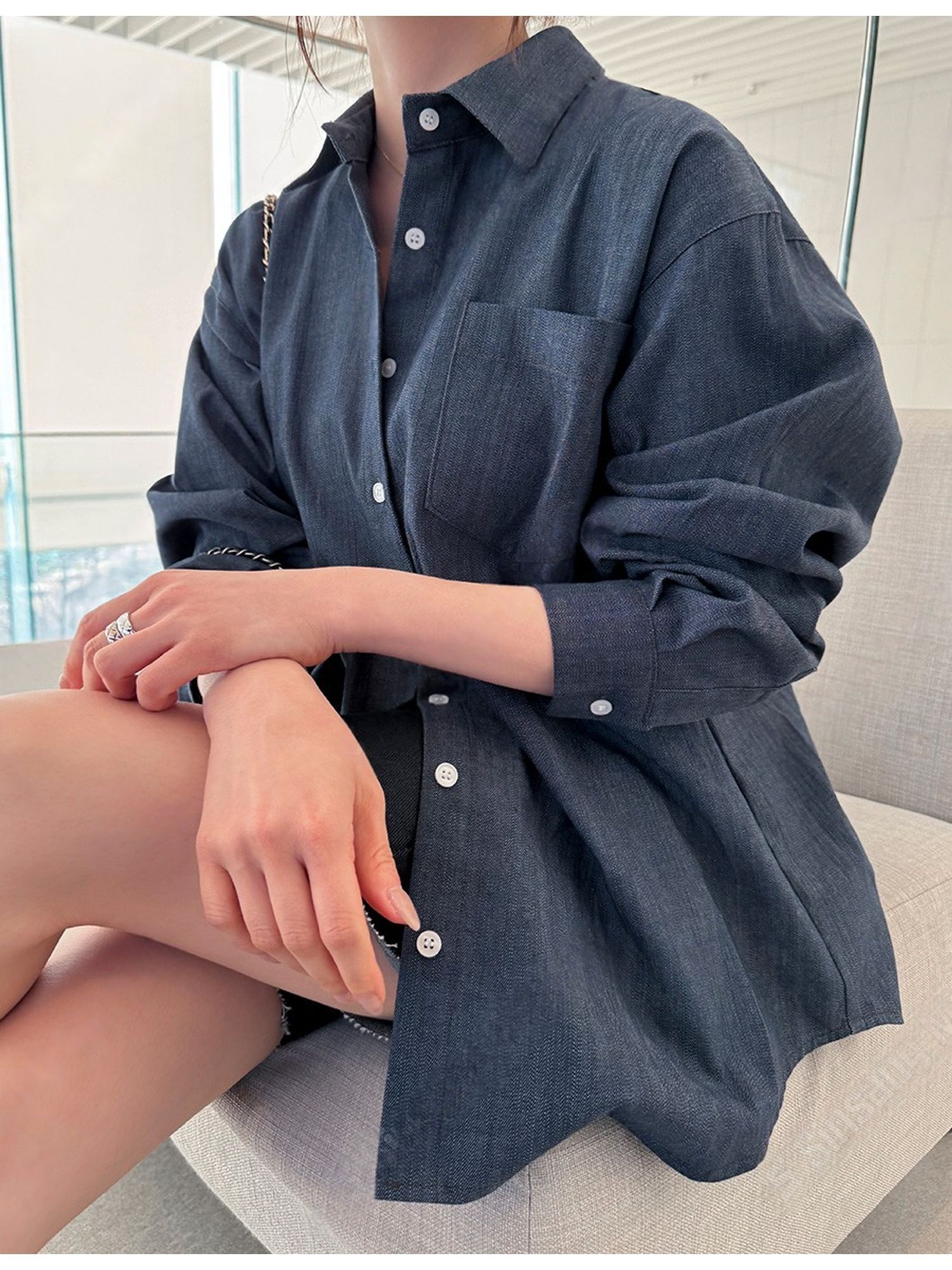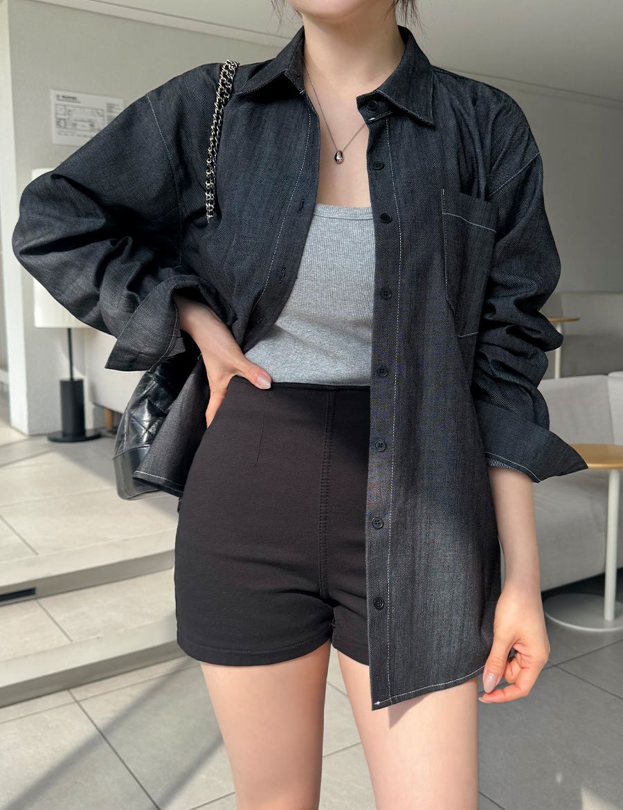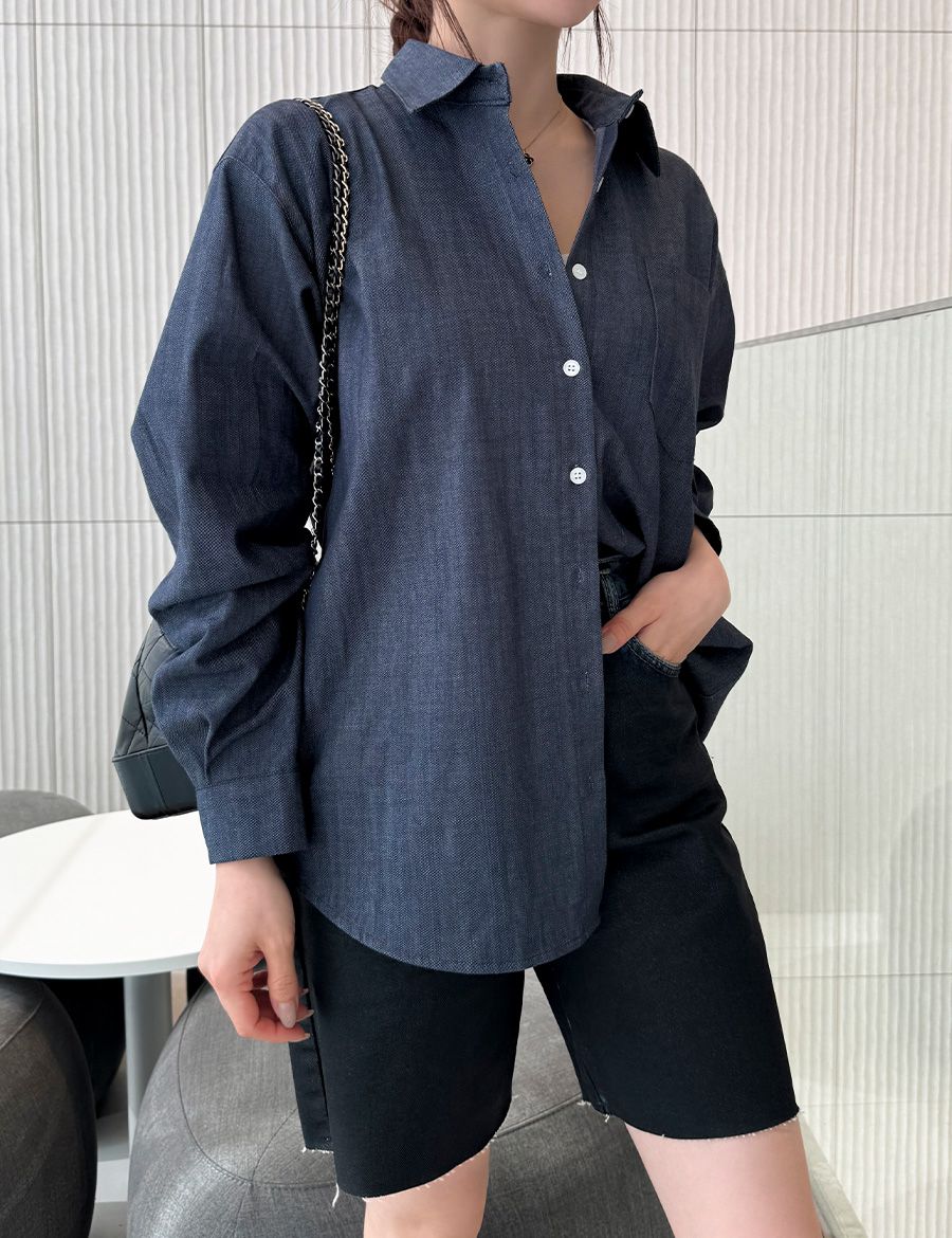 字母皮革標籤/前短後長/弧形下襬/胸前口袋/開襟排釦/寬鬆大尺碼上衣/長版上衣 - 休閒居家OL上班族牛仔襯衫外套皮革標牛仔襯衫長袖上衣長袖外套