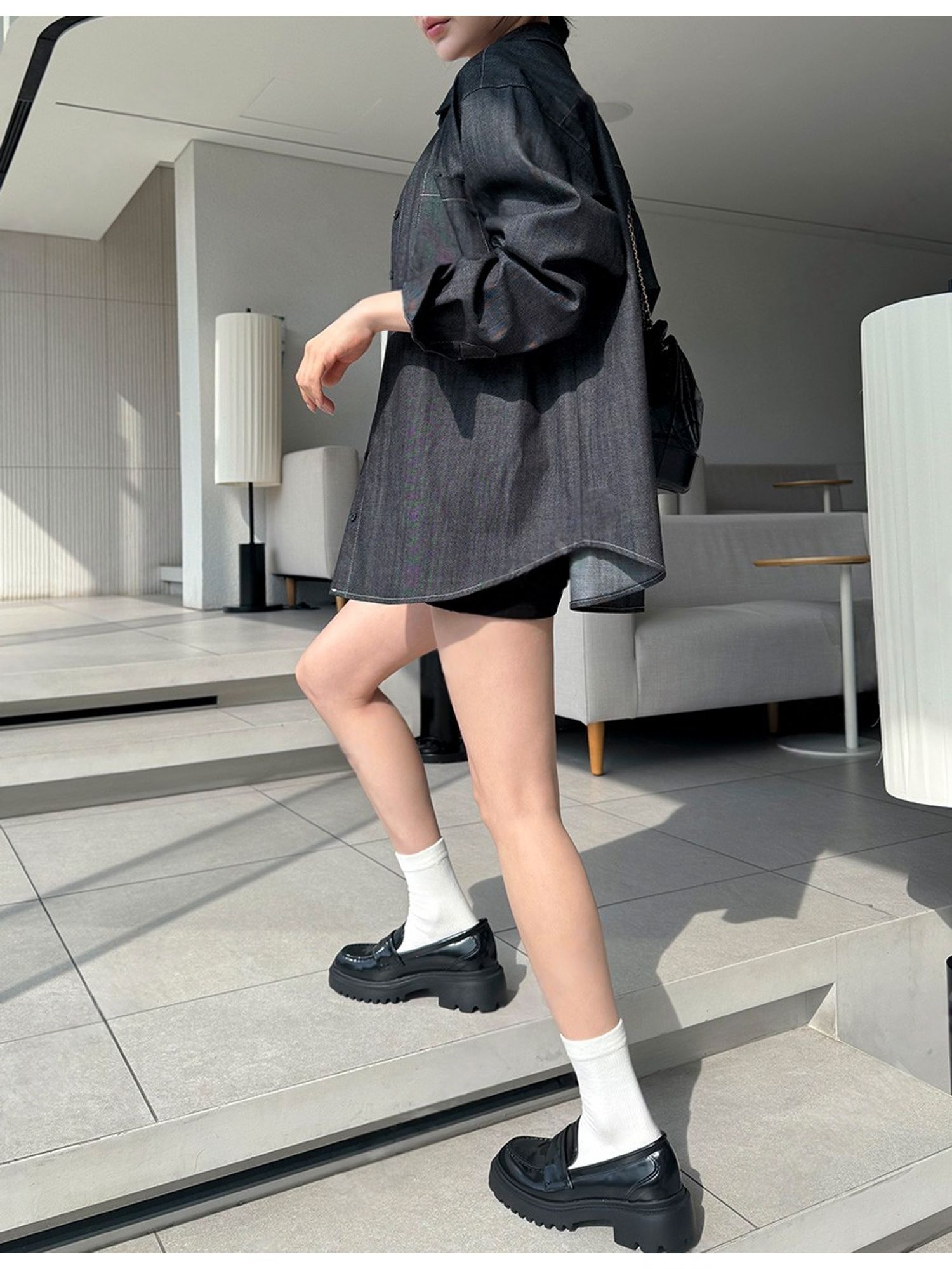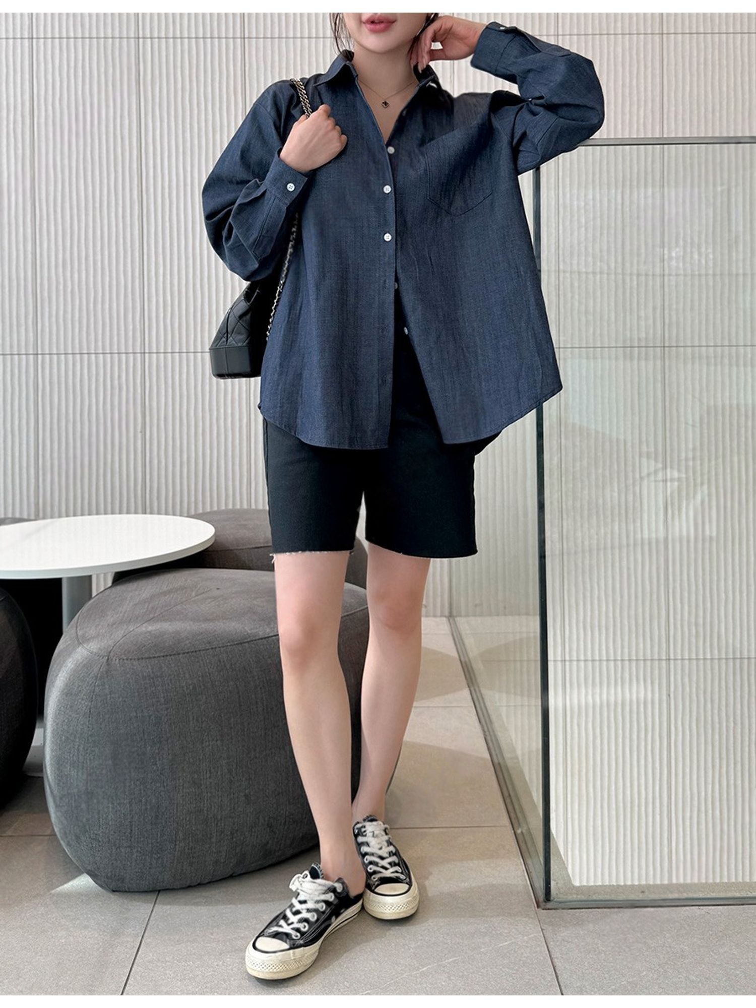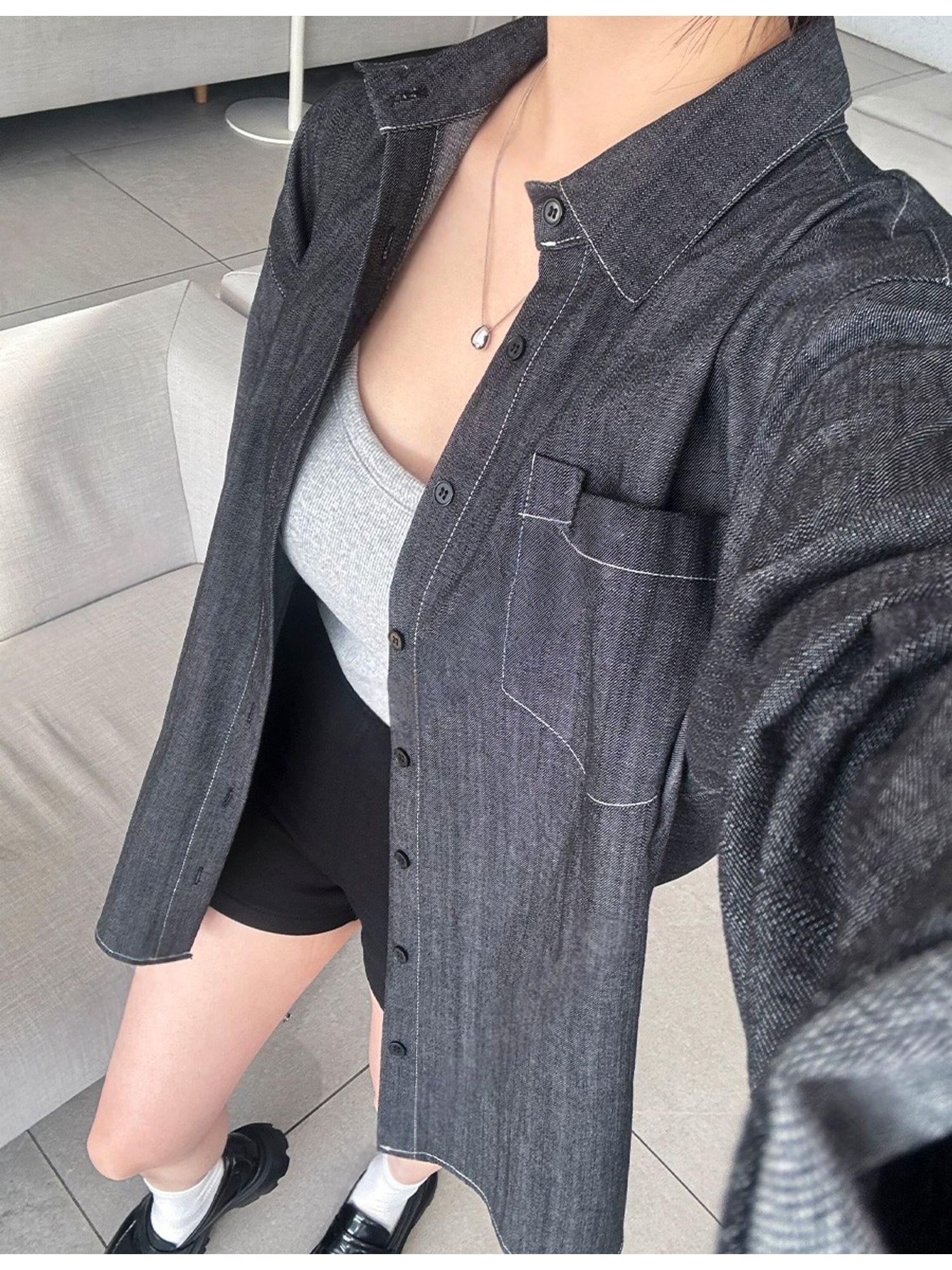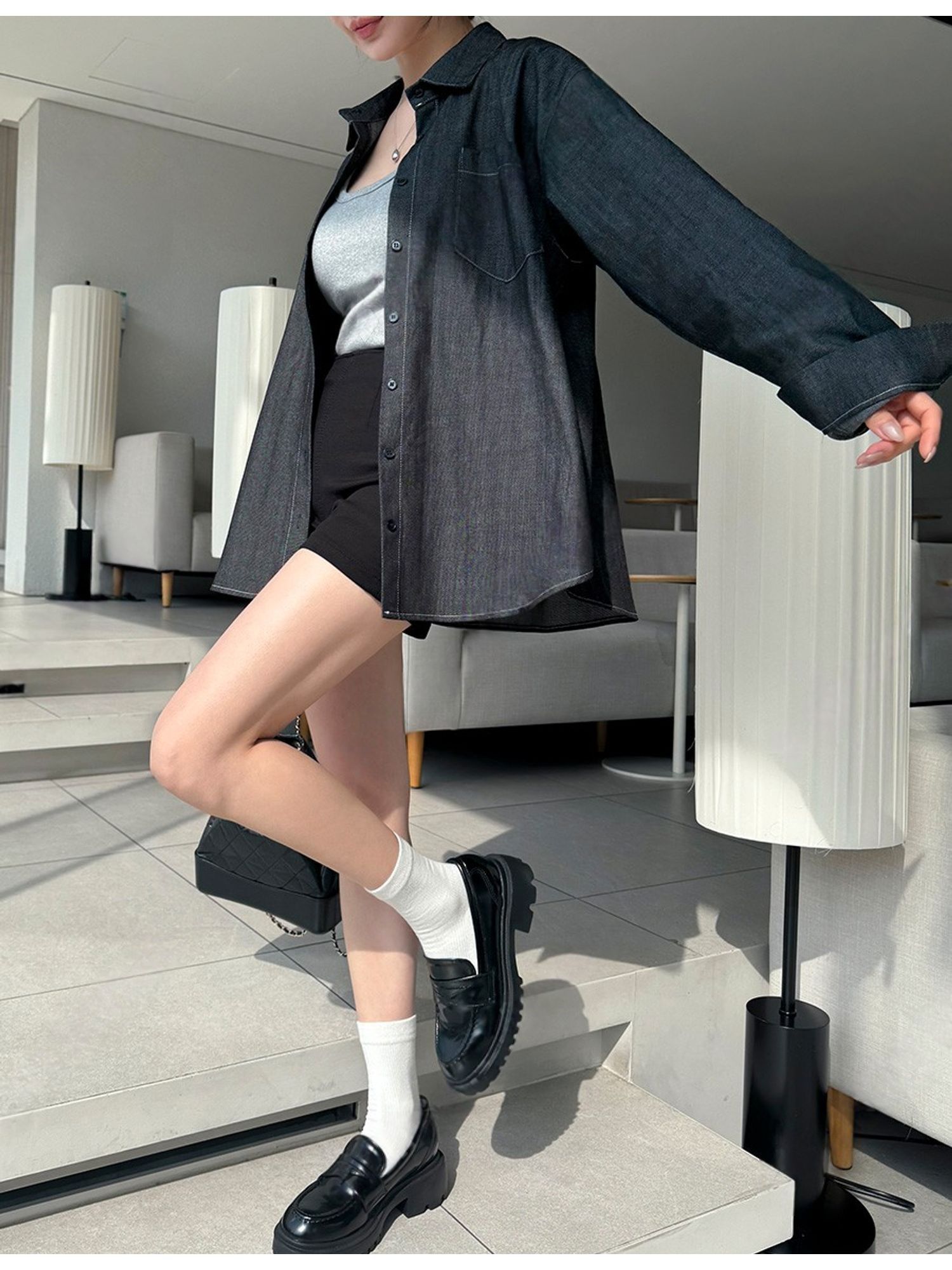 字母皮革標籤/前短後長/弧形下襬/胸前口袋/開襟排釦/寬鬆大尺碼上衣/長版上衣 - 休閒居家OL上班族牛仔襯衫外套皮革標牛仔襯衫長袖上衣長袖外套