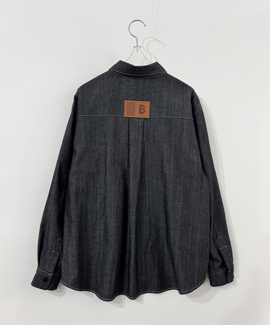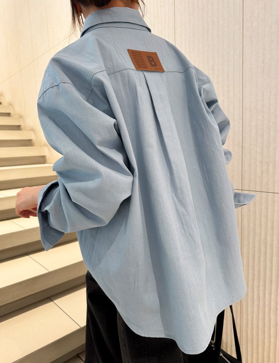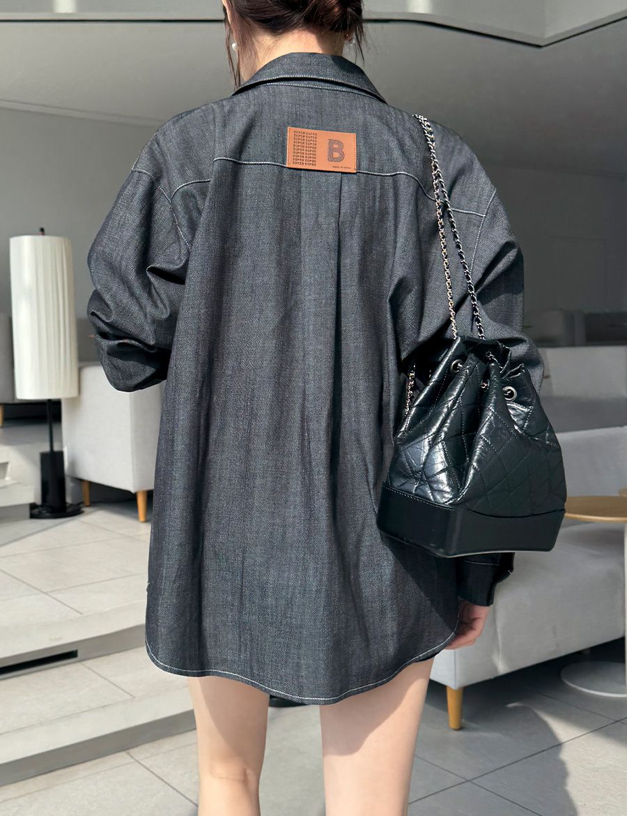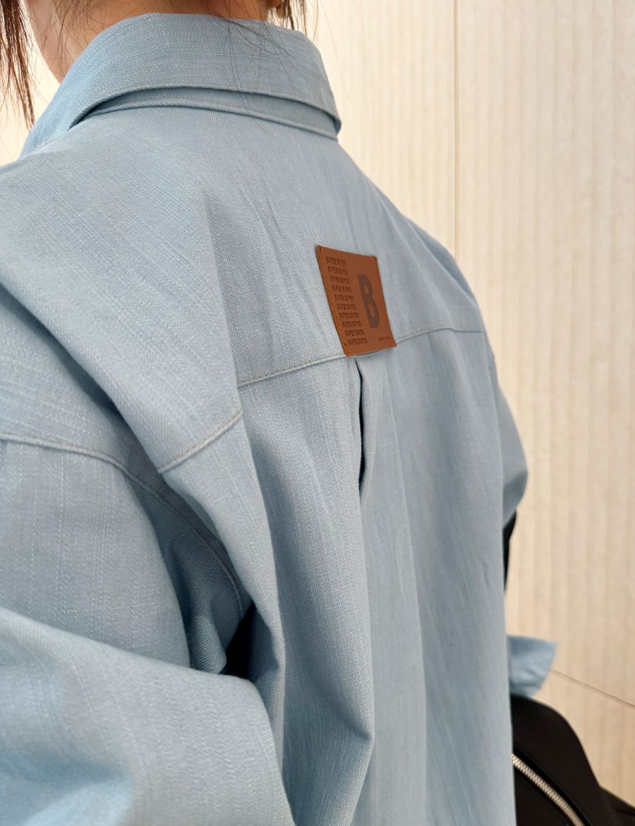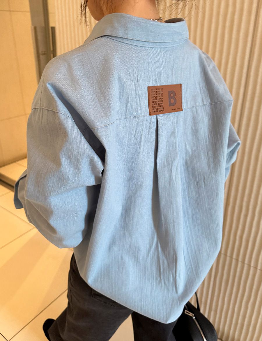 【C56104】韓國SPB 皮革標牛仔襯衫-字母標寬鬆長版口袋長袖上衣外套