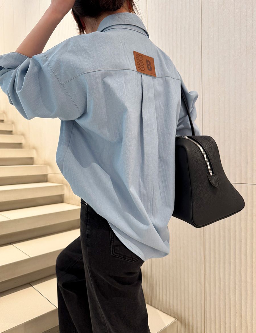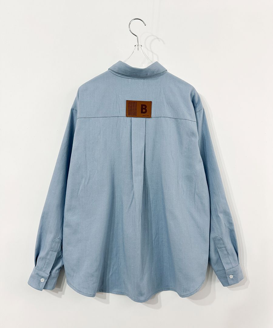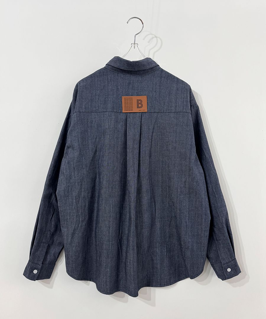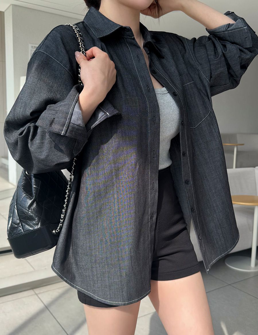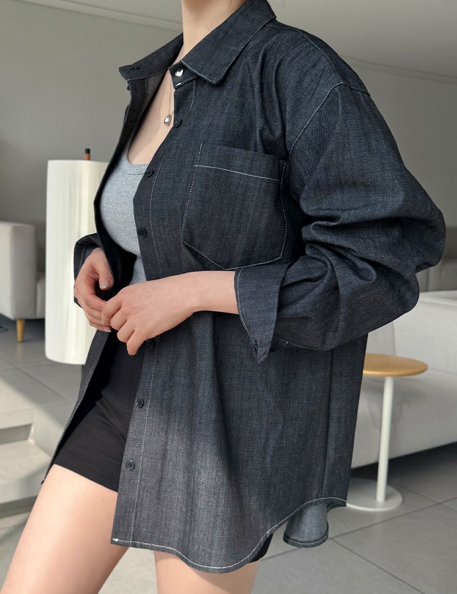 【C56104】韓國SPB 皮革標牛仔襯衫-字母標寬鬆長版口袋長袖上衣外套
