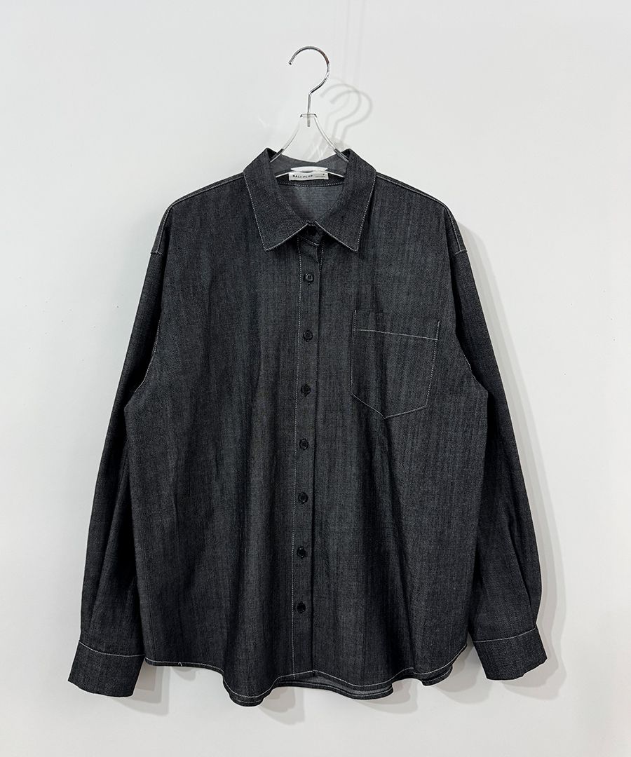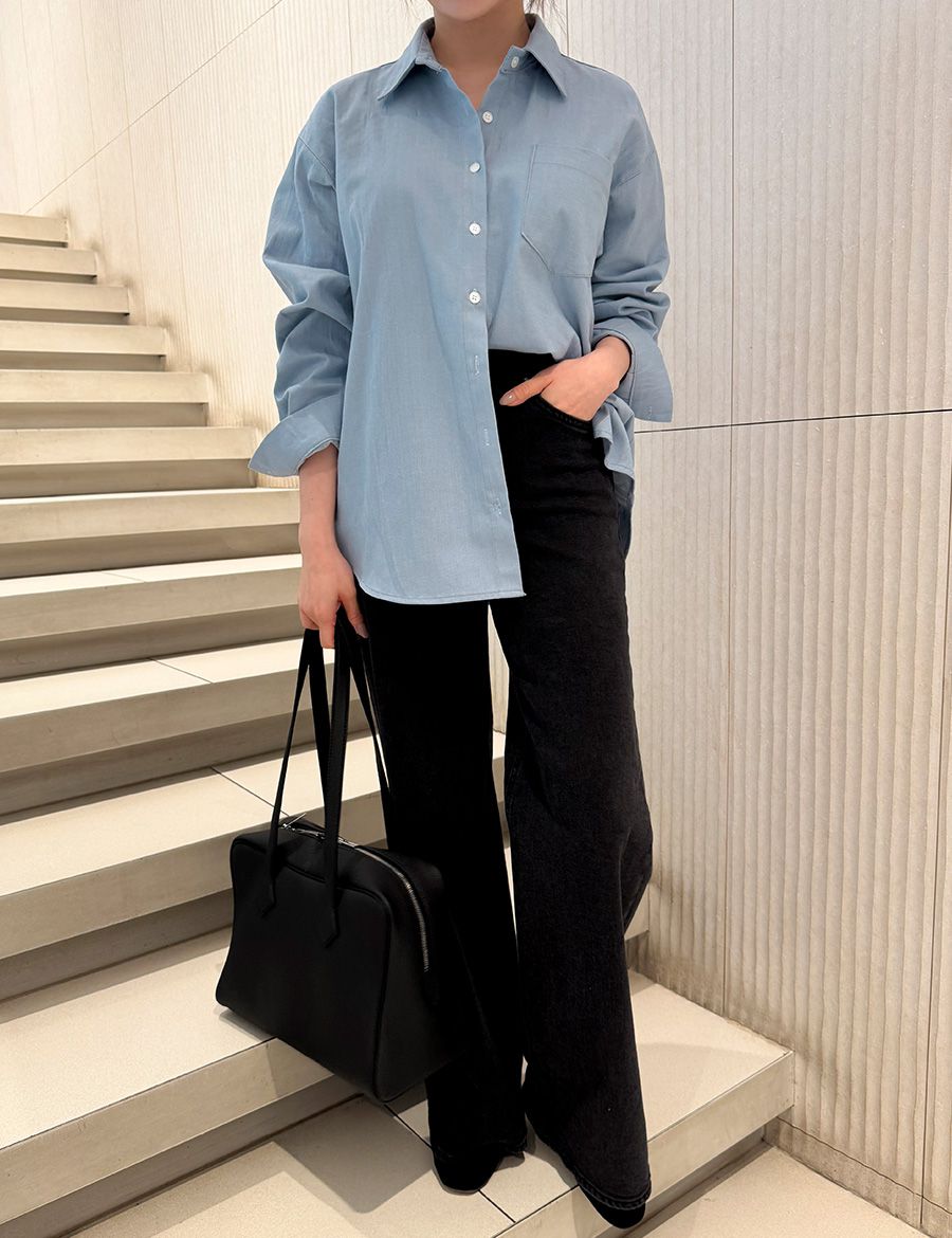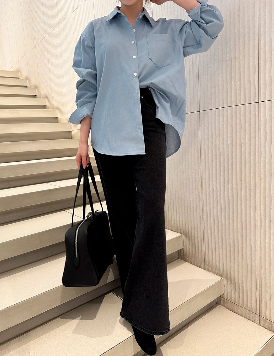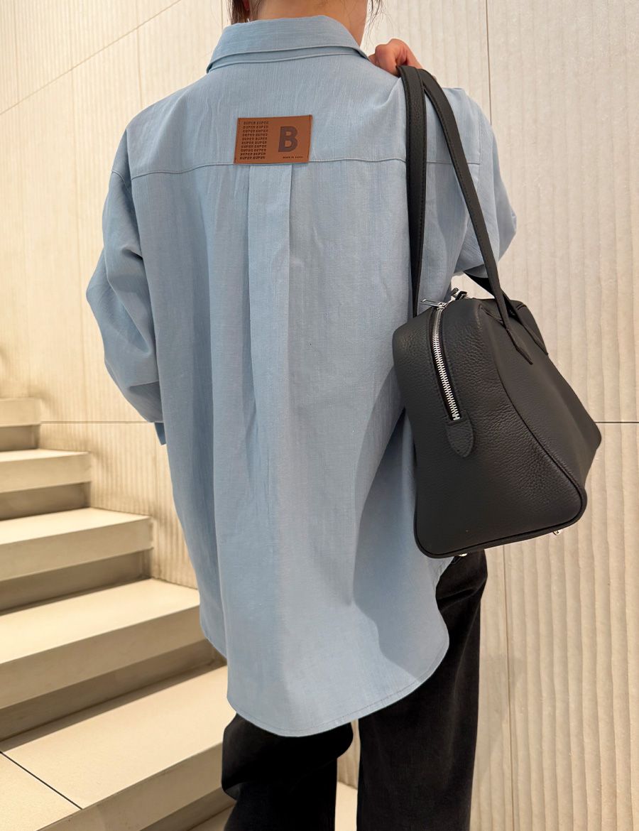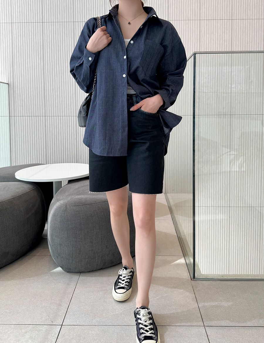 【C56104】韓國SPB 皮革標牛仔襯衫-字母標寬鬆長版口袋長袖上衣外套