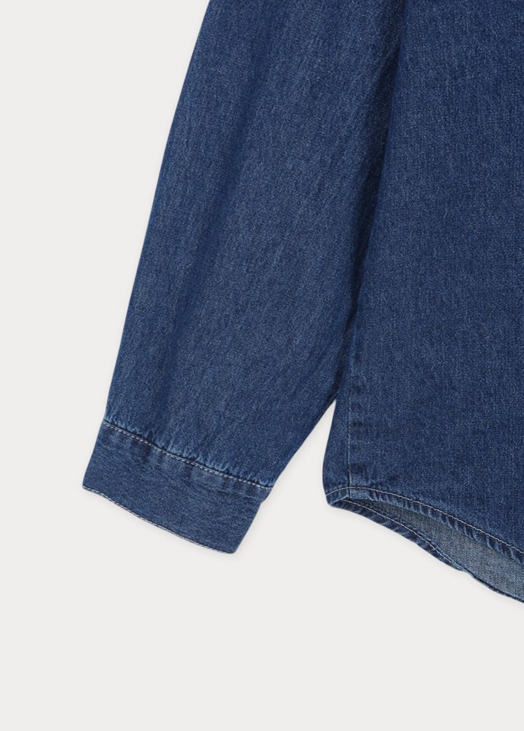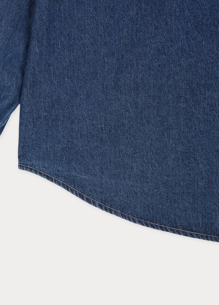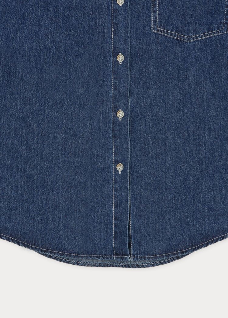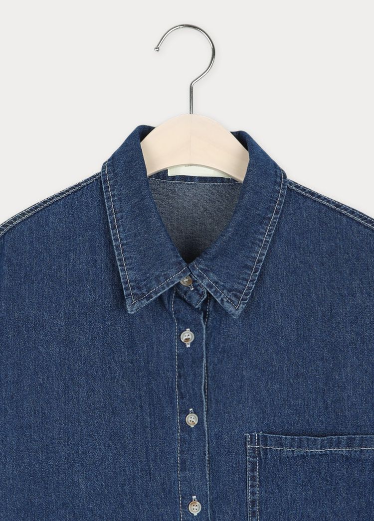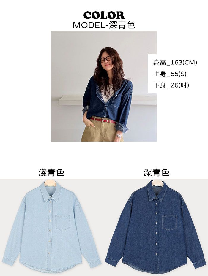 牛仔外套/胸前口袋/弧形下襬/開襟排釦/長版上衣/棉質 - 休閒居家簡約百搭素面棉質牛仔襯衫上衣牛仔外套長袖上衣襯衫外套淺青色深青色
