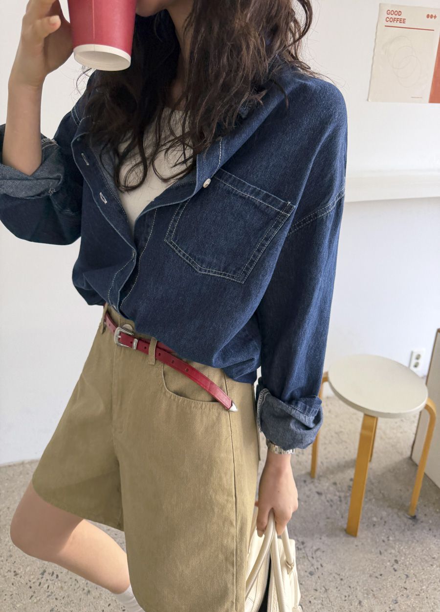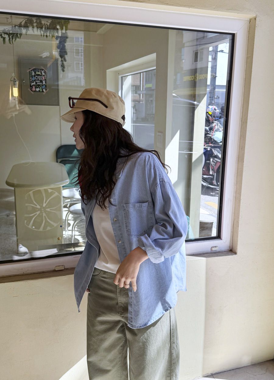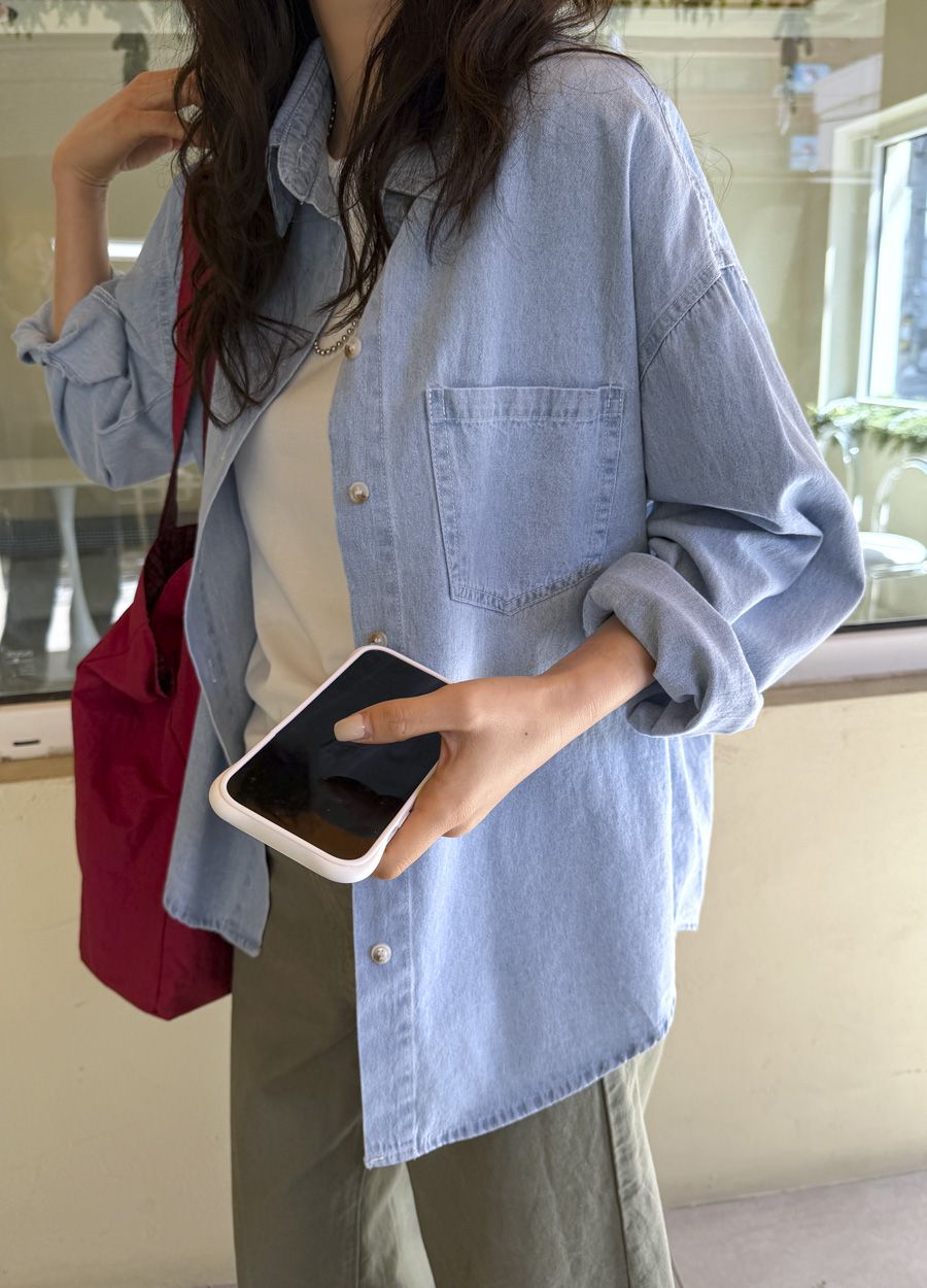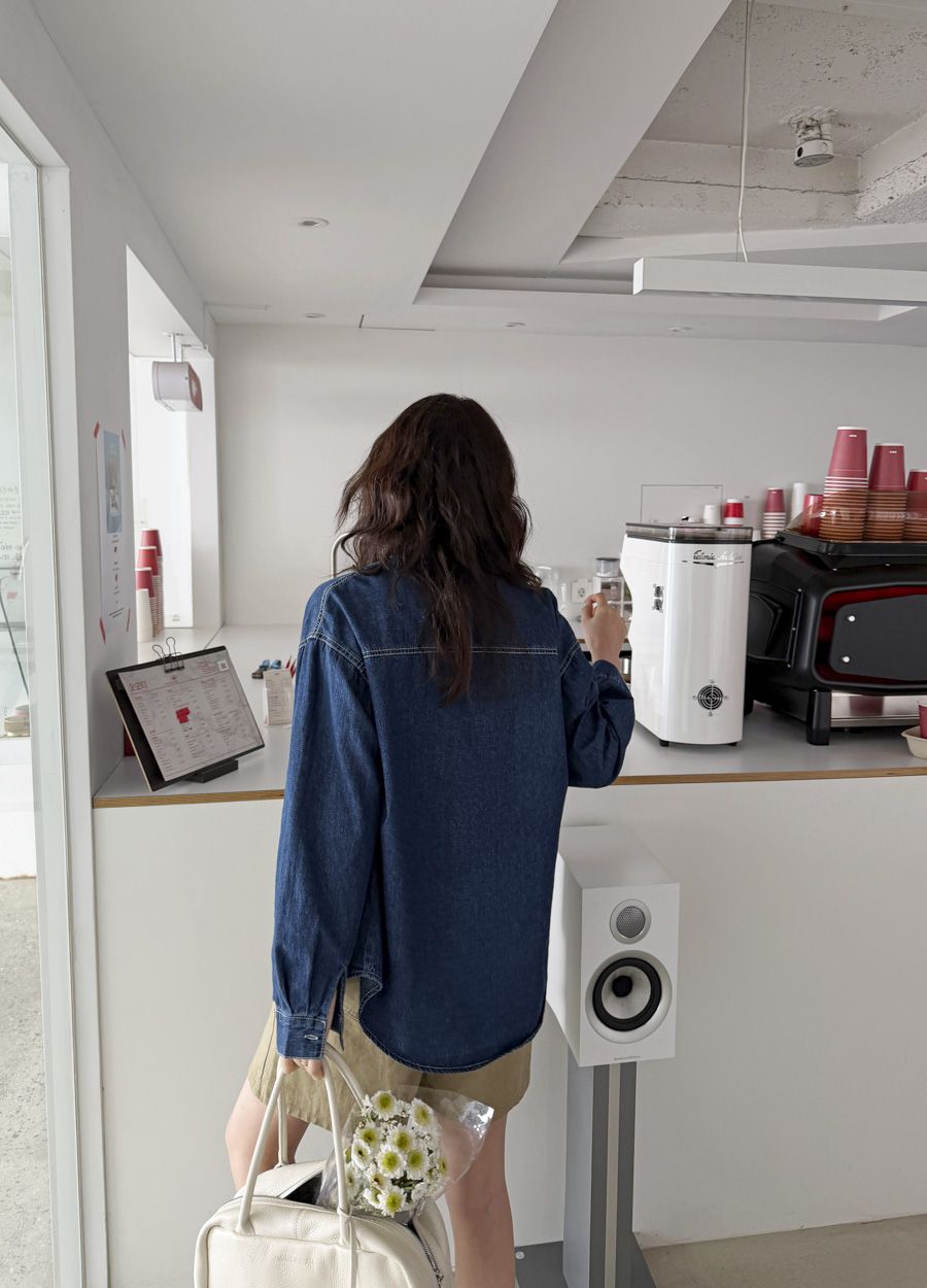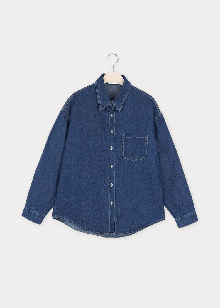 【C56109】韓國MBL 棉質牛仔襯衫-素面弧形下襬長版口袋長袖上衣外套