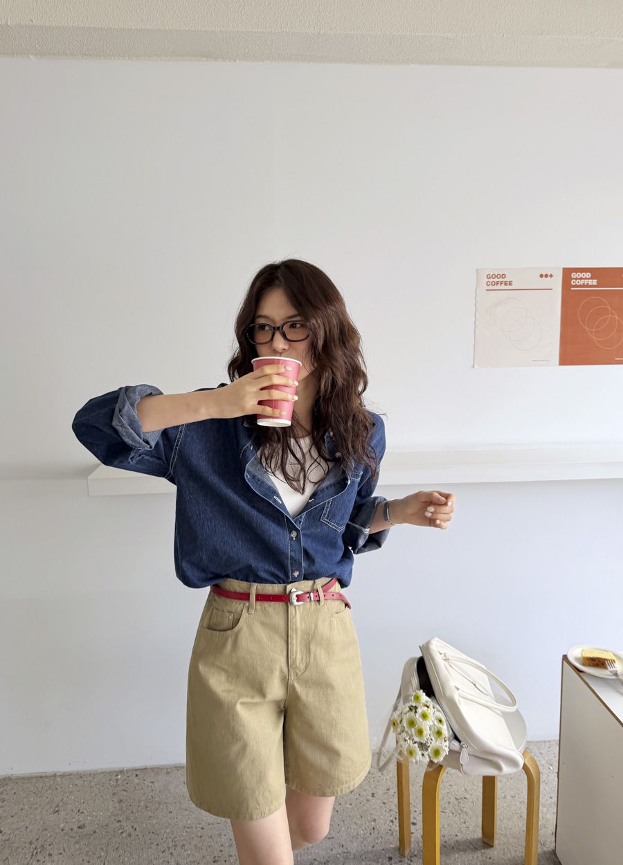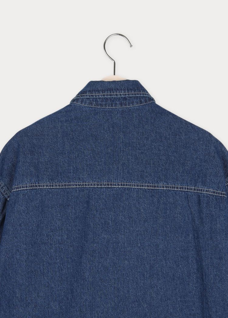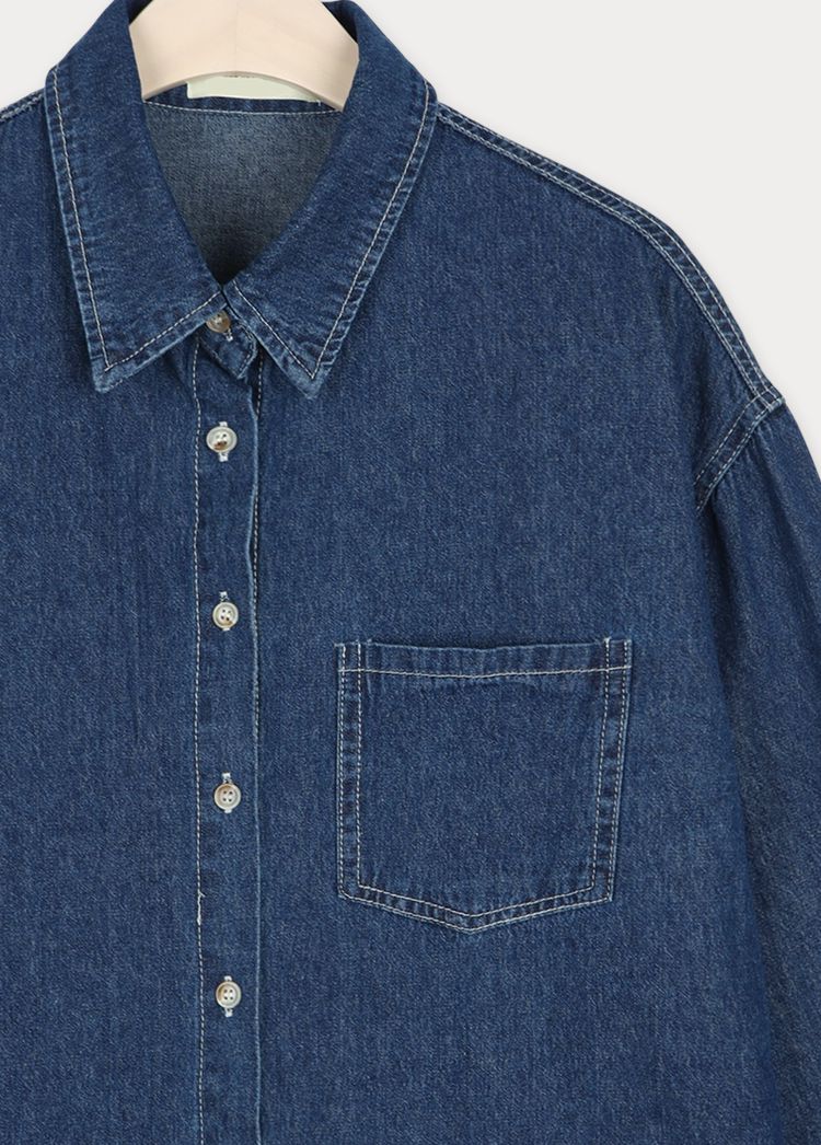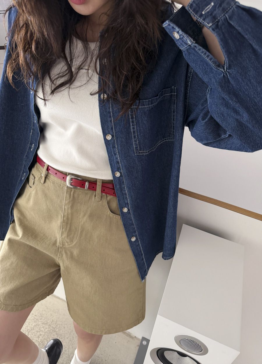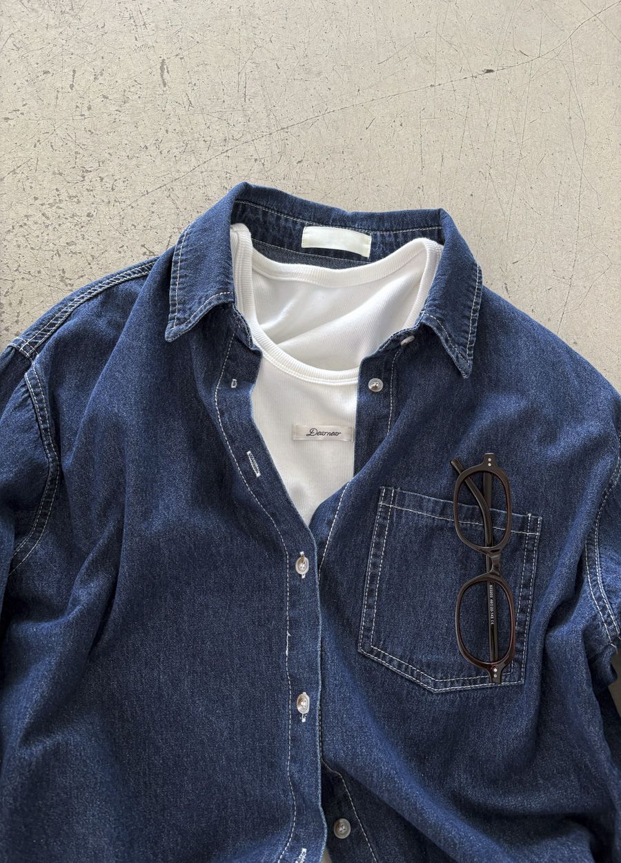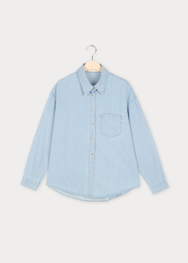 【C56109】韓國MBL 棉質牛仔襯衫-素面弧形下襬長版口袋長袖上衣外套