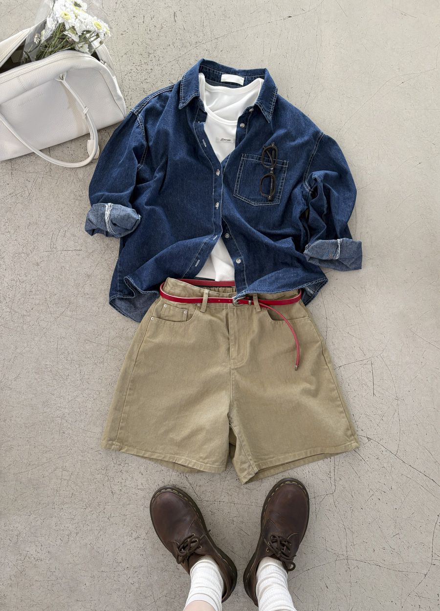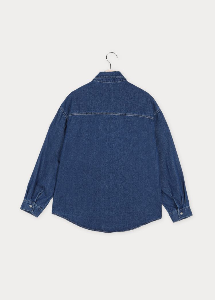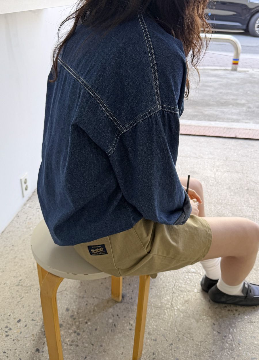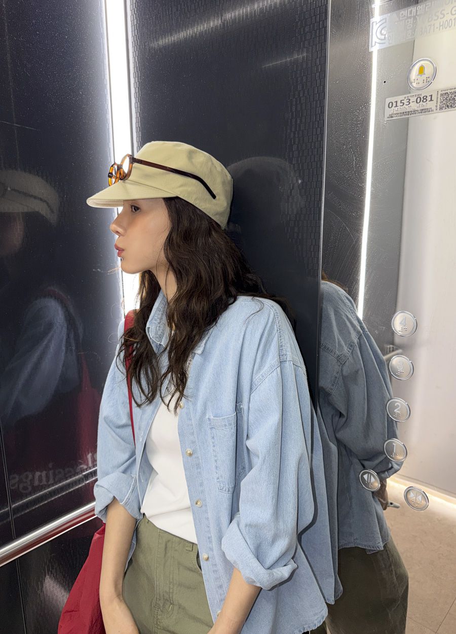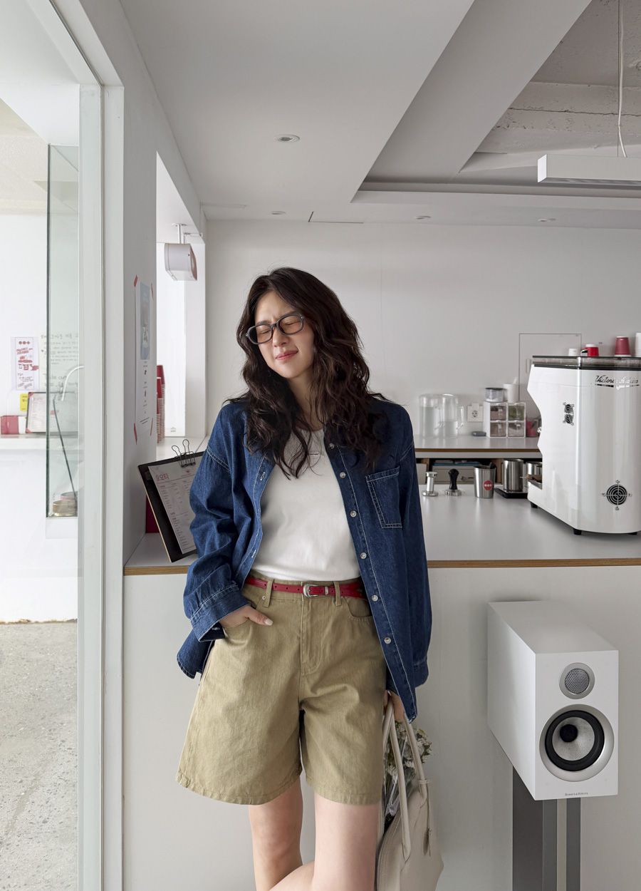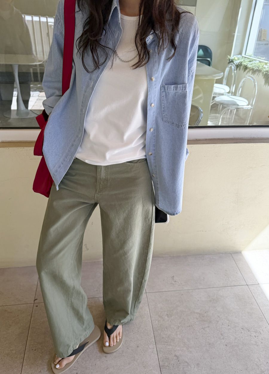 【C56109】韓國MBL 棉質牛仔襯衫-素面弧形下襬長版口袋長袖上衣外套
