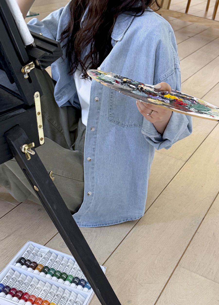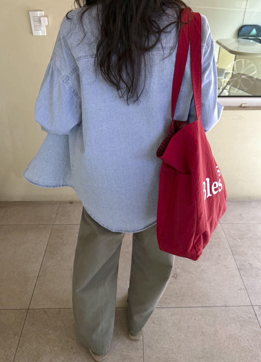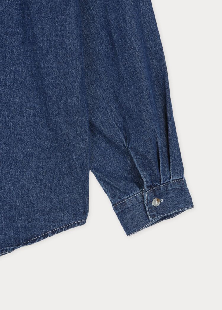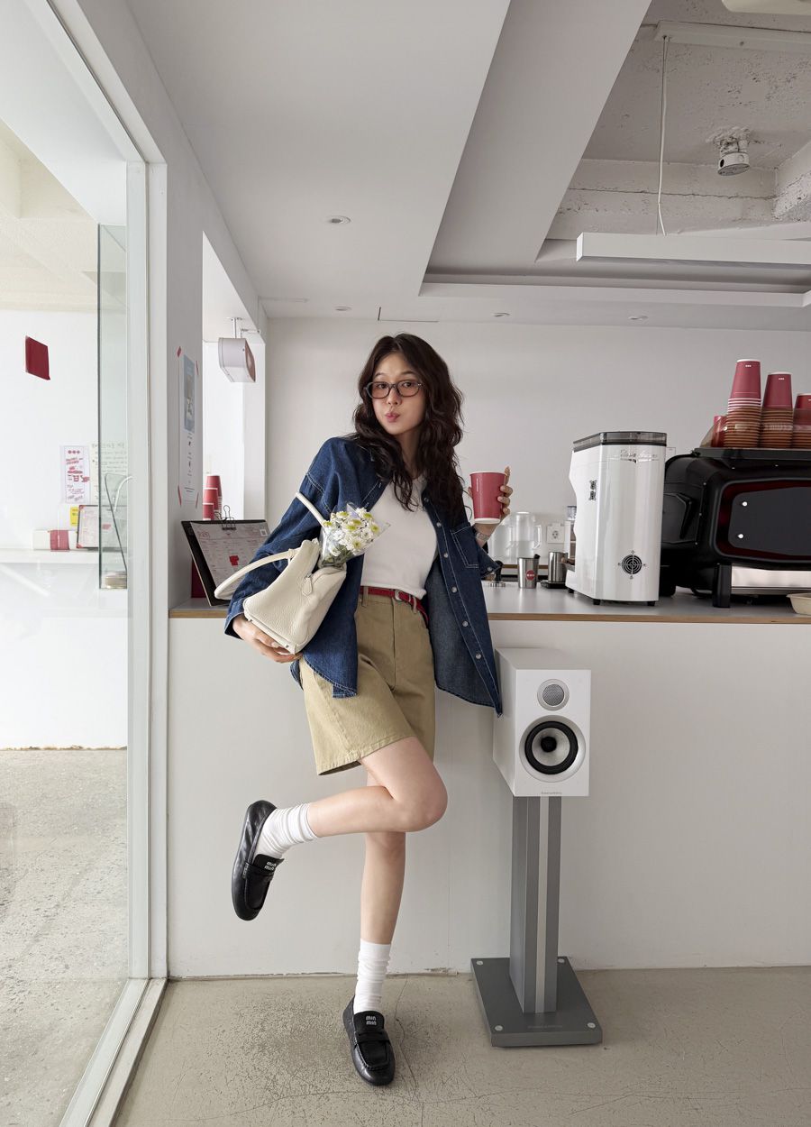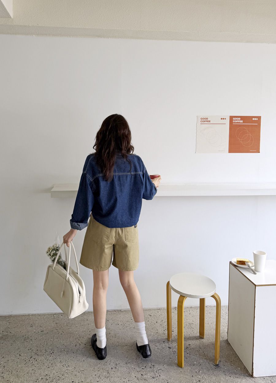 【C56109】韓國MBL 棉質牛仔襯衫-素面弧形下襬長版口袋長袖上衣外套