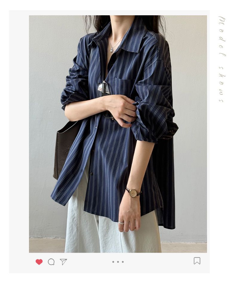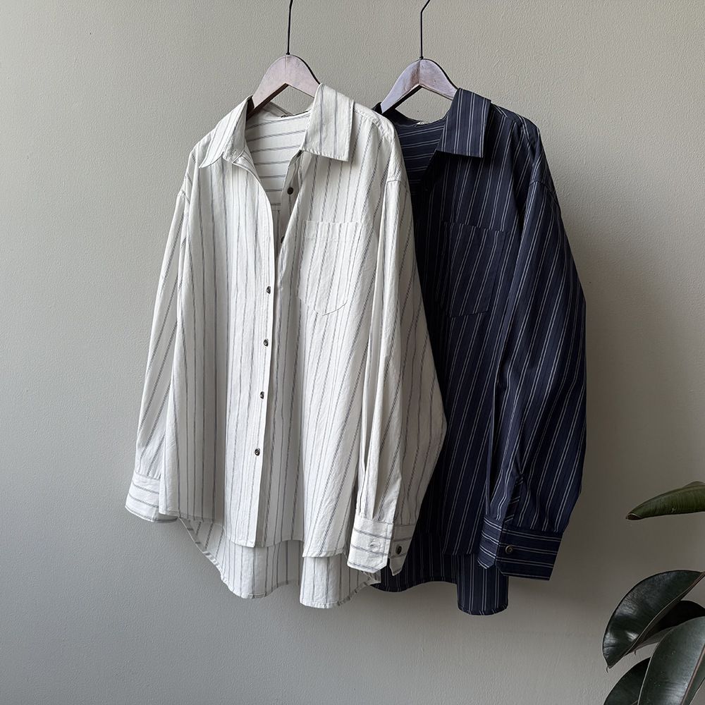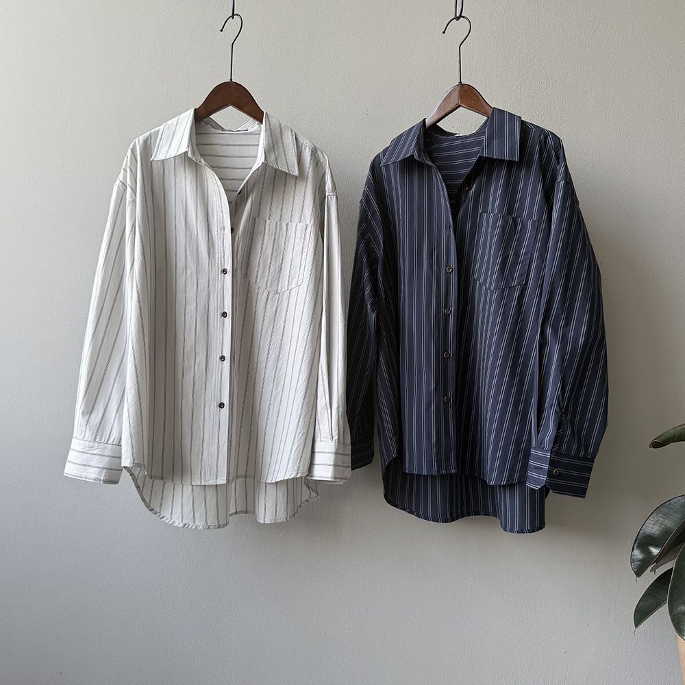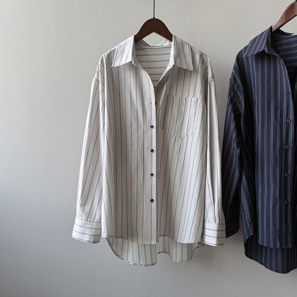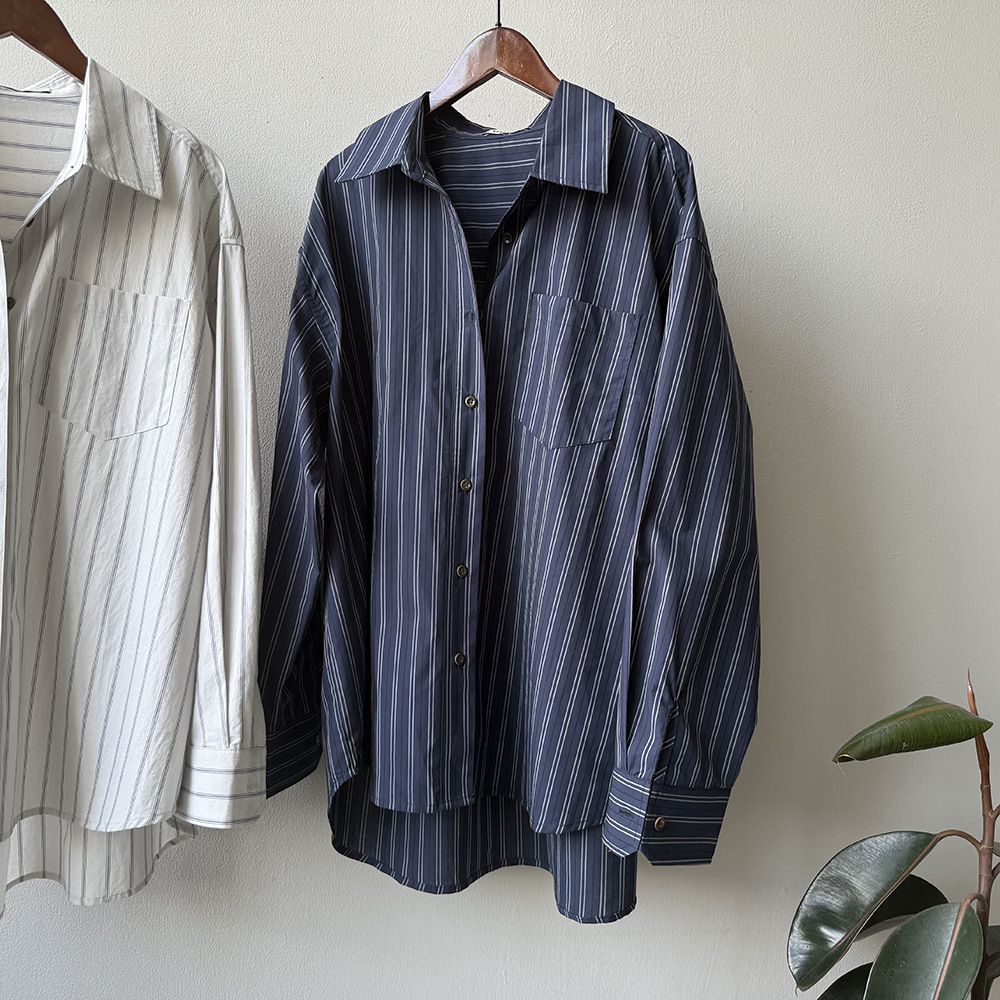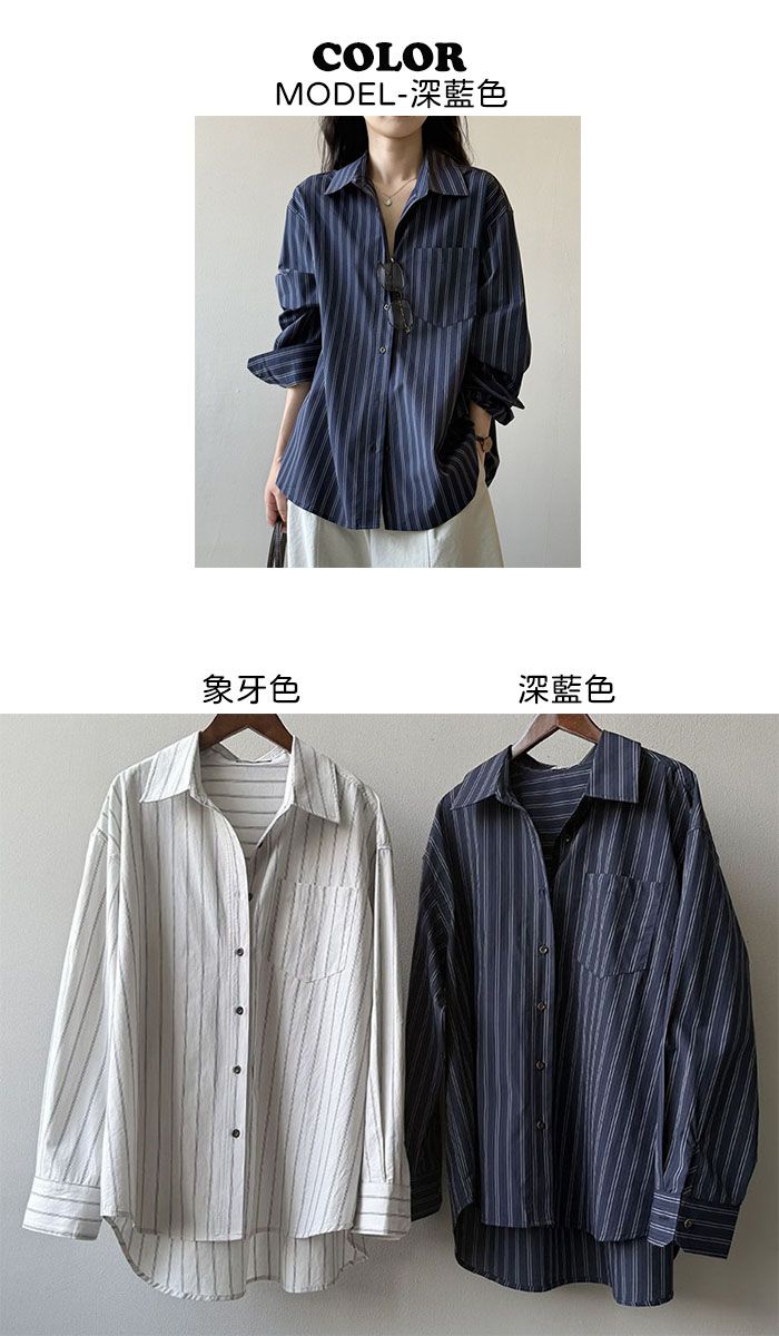 兩種尺寸/經典直條紋/開襟排釦/胸前口袋/長版襯衫/弧形下襬/前短後長 - 休閒渡假OL上班族配色條紋上衣雙線條紋襯衫上衣長袖上衣多尺寸ML深藍色象牙色