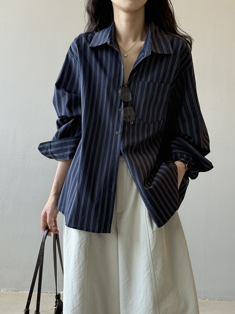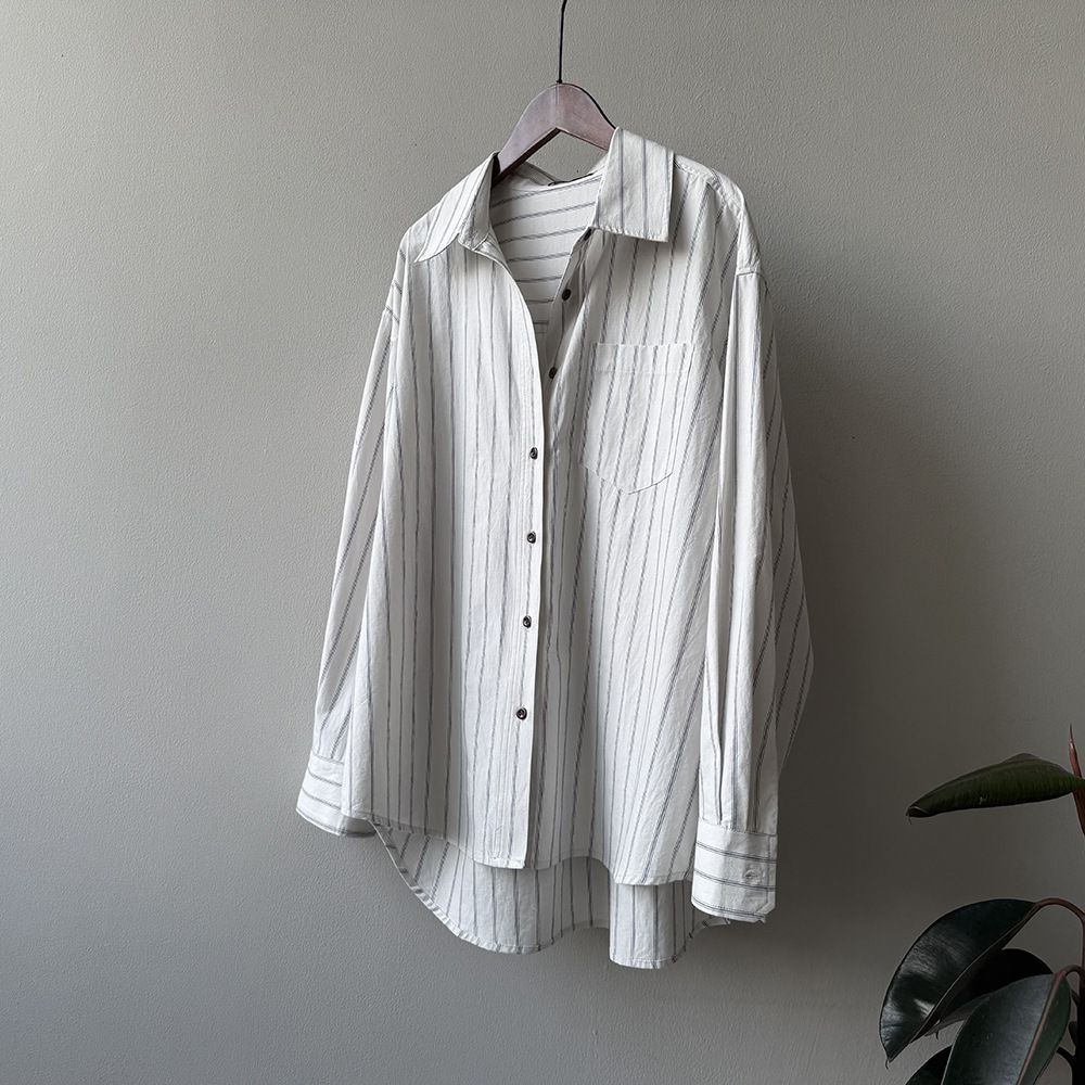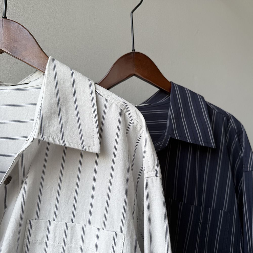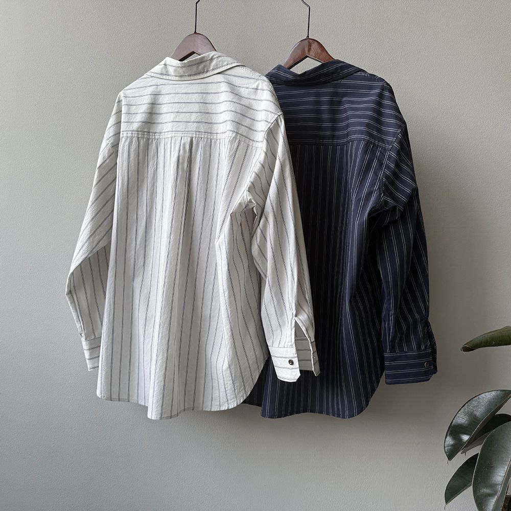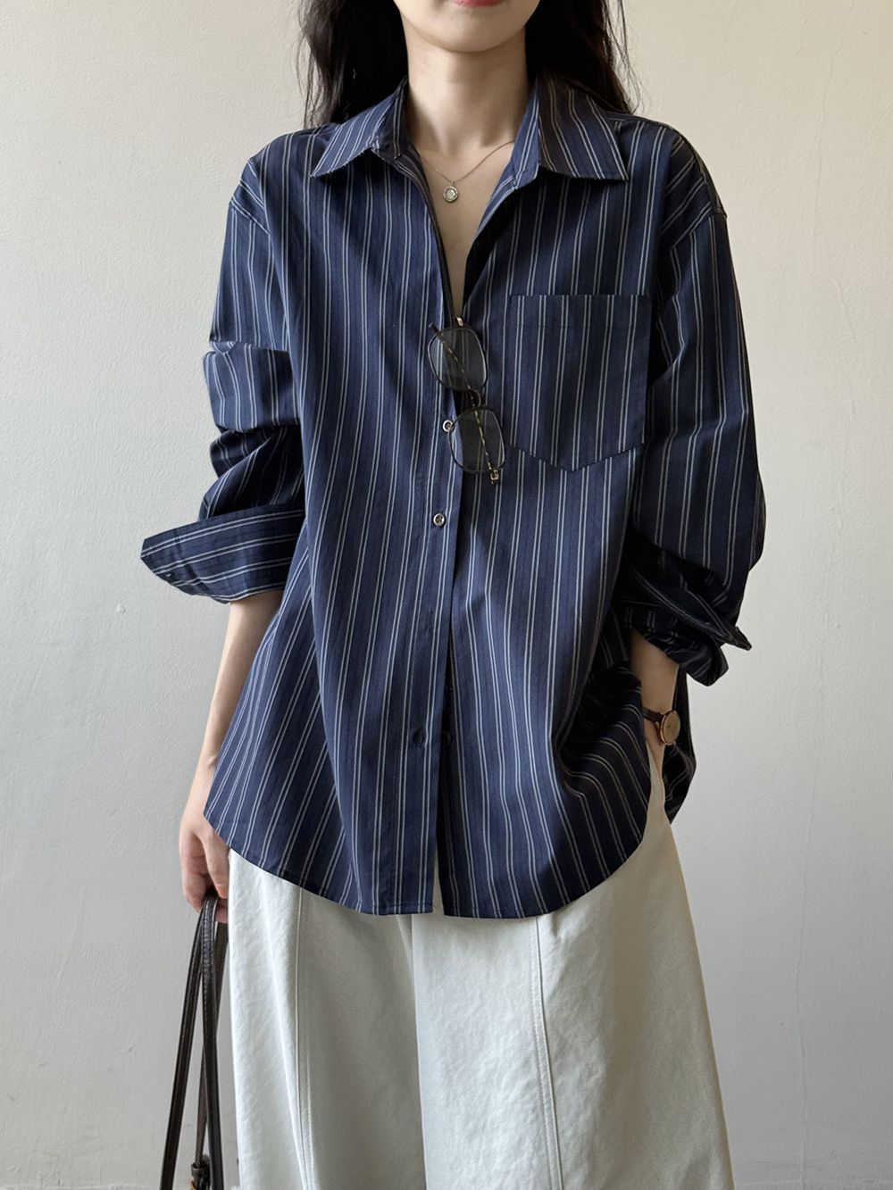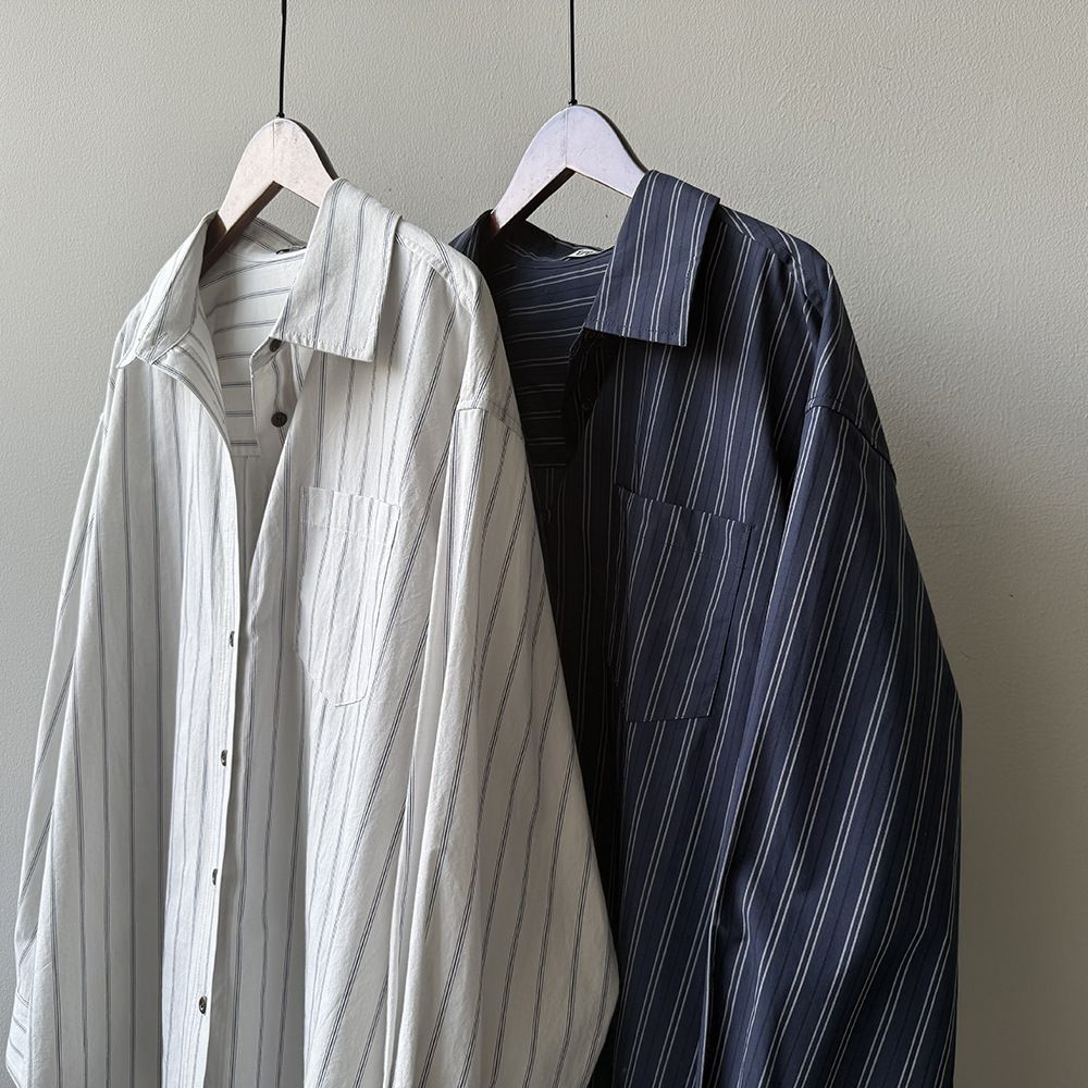 兩種尺寸/經典直條紋/開襟排釦/胸前口袋/長版襯衫/弧形下襬/前短後長 - 休閒渡假OL上班族配色條紋上衣雙線條紋襯衫上衣長袖上衣多尺寸ML深藍色象牙色