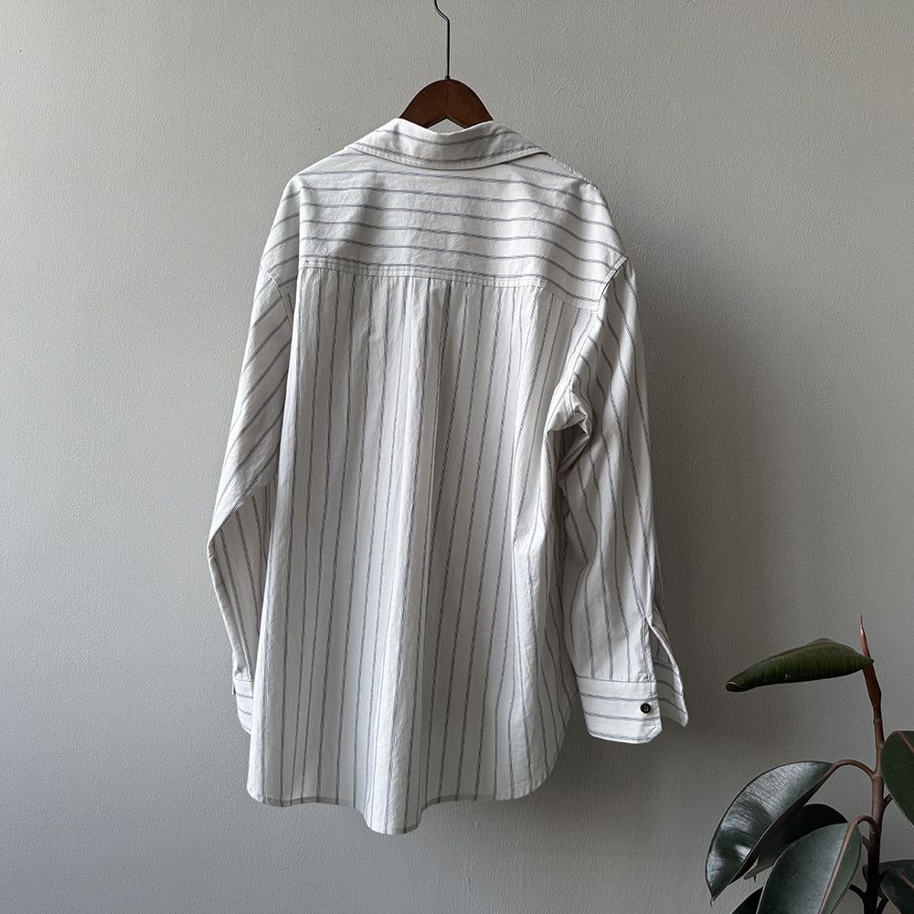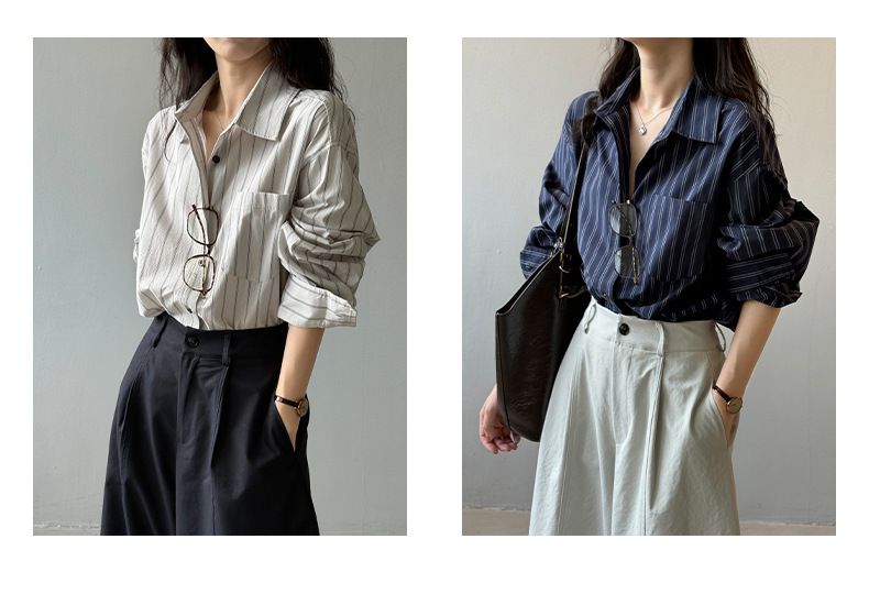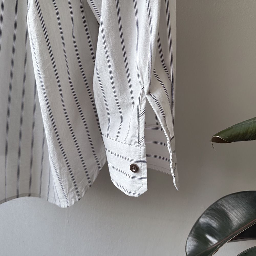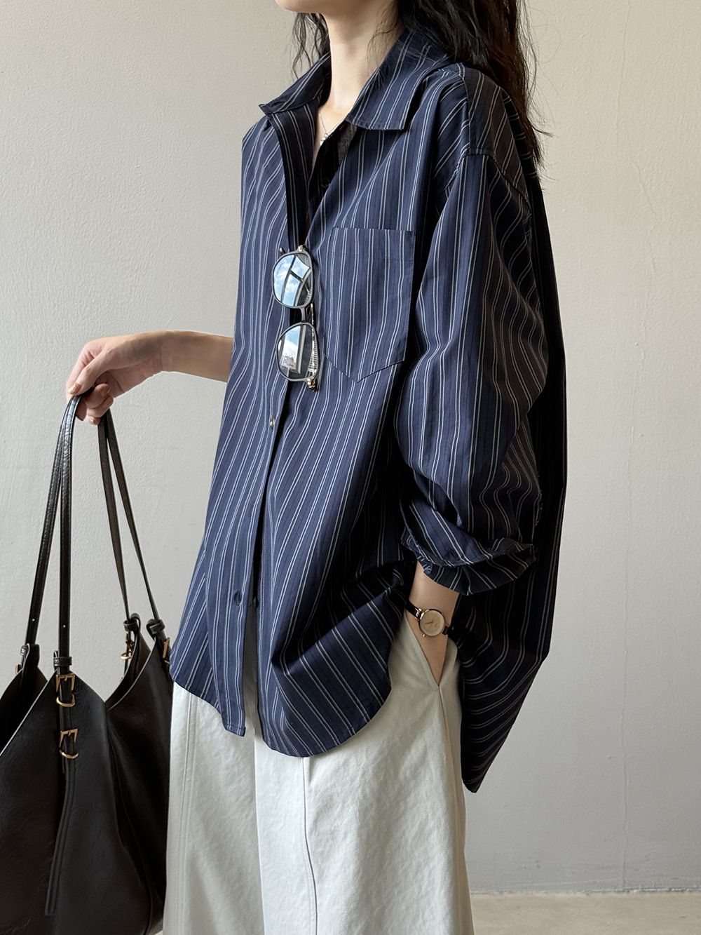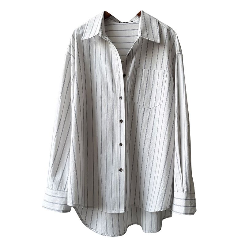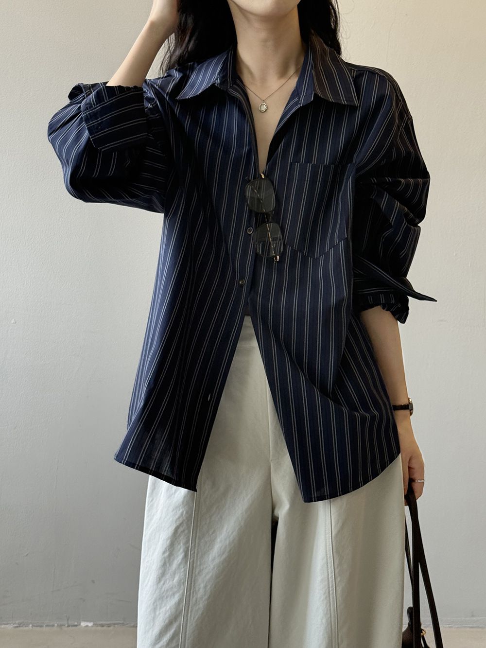 兩種尺寸/經典直條紋/開襟排釦/胸前口袋/長版襯衫/弧形下襬/前短後長 - 休閒渡假OL上班族配色條紋上衣雙線條紋襯衫上衣長袖上衣多尺寸ML深藍色象牙色