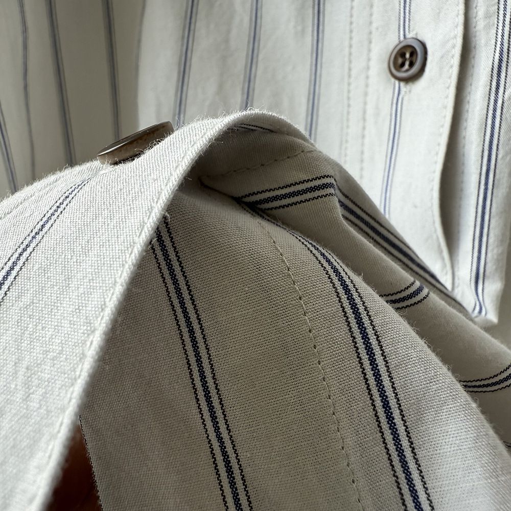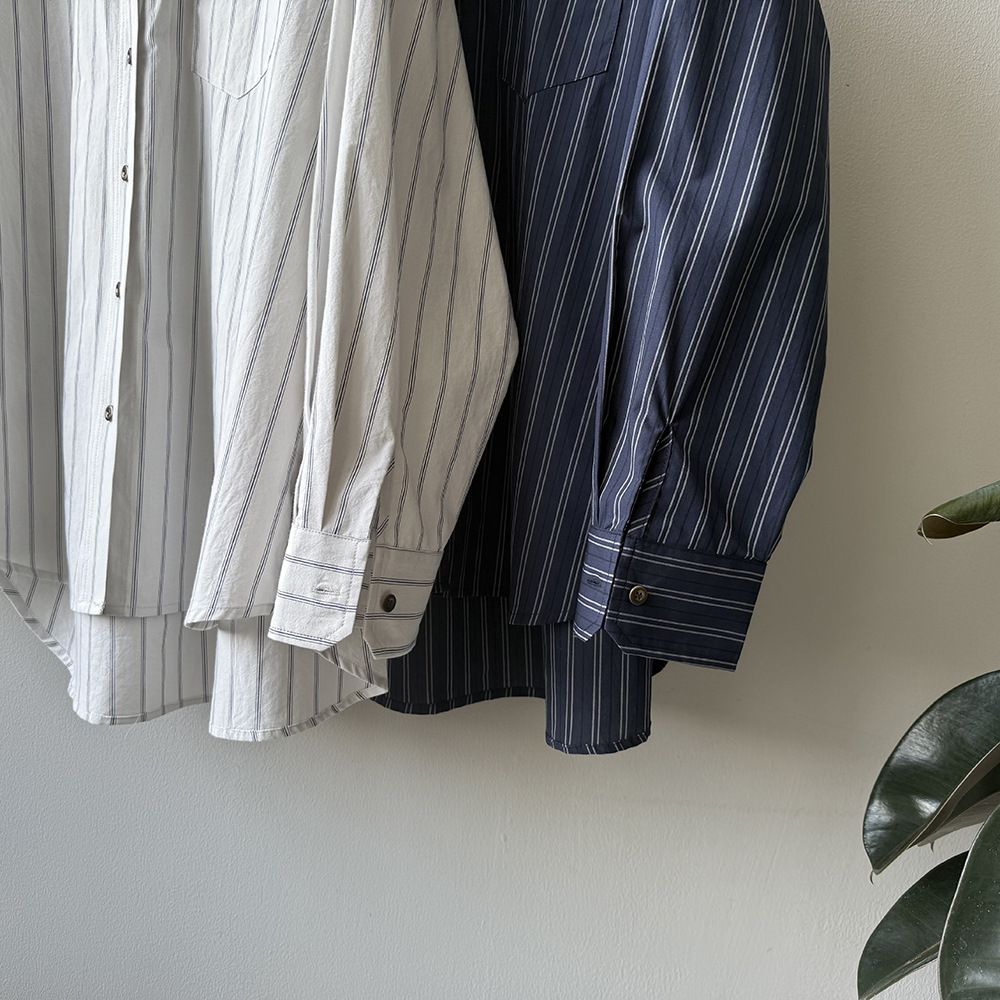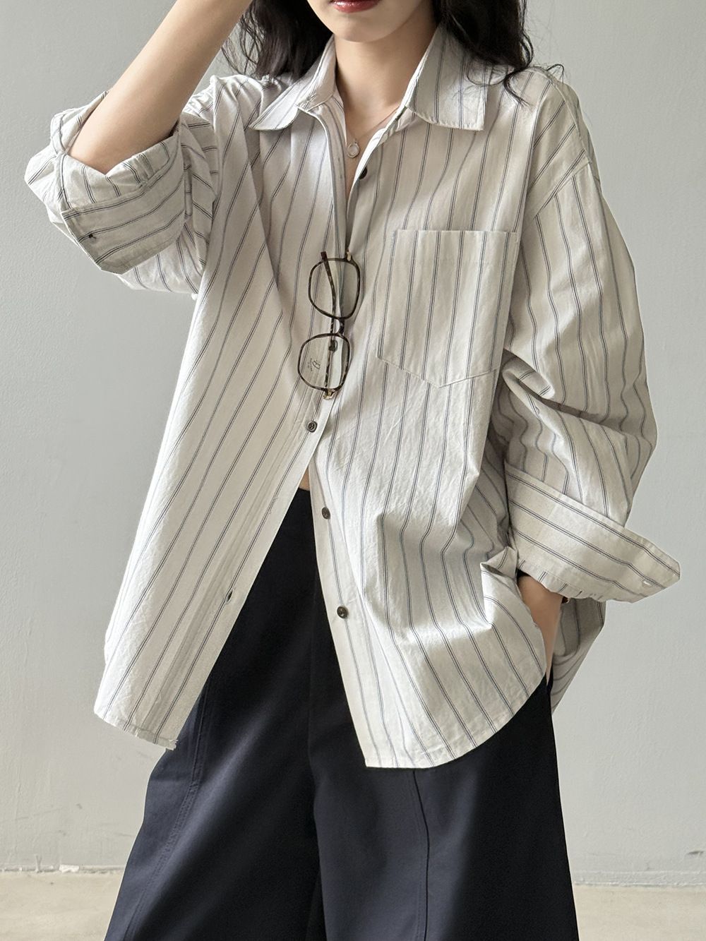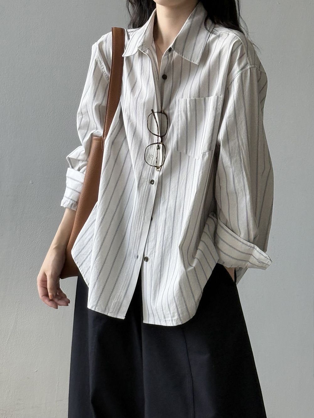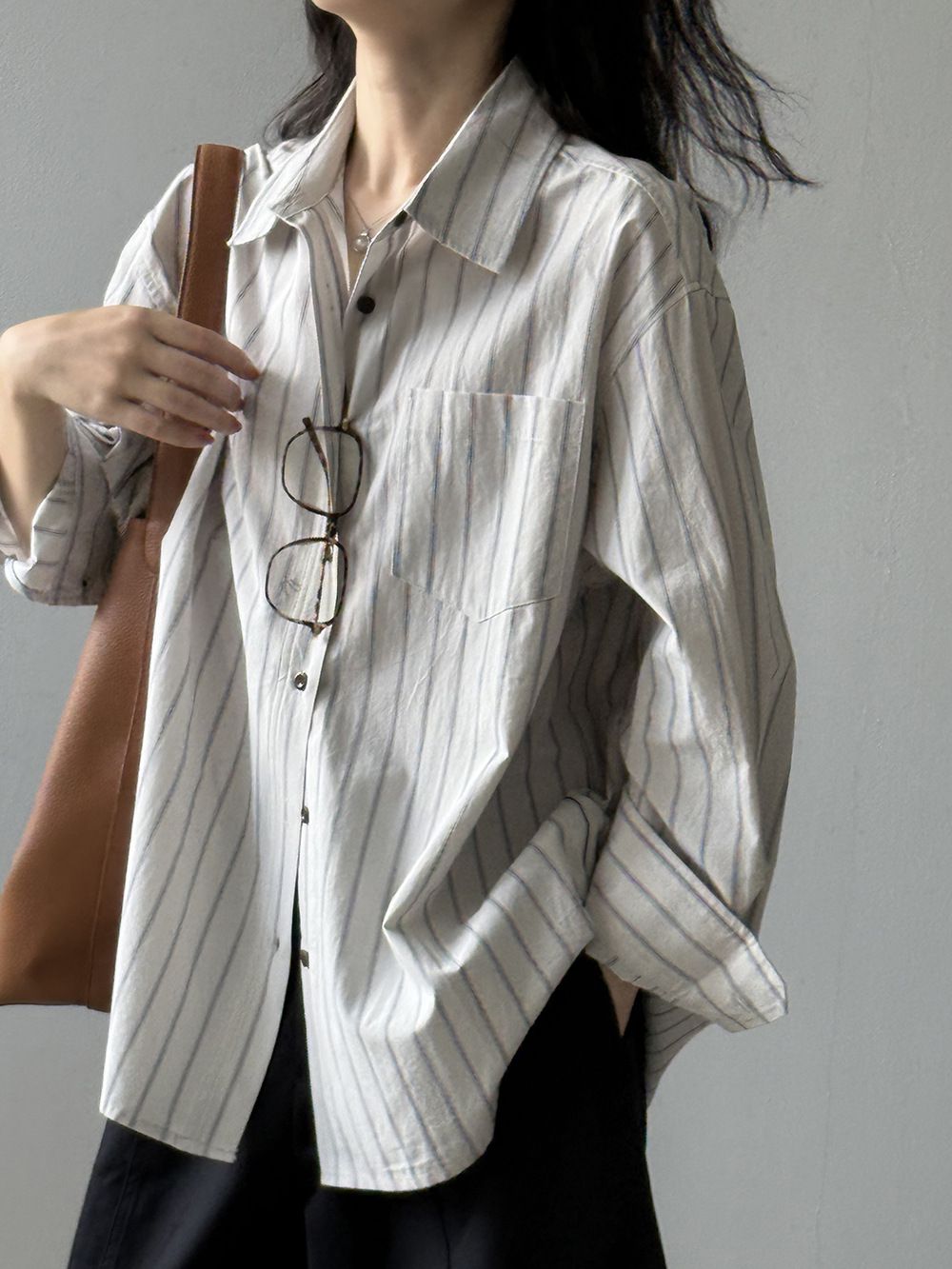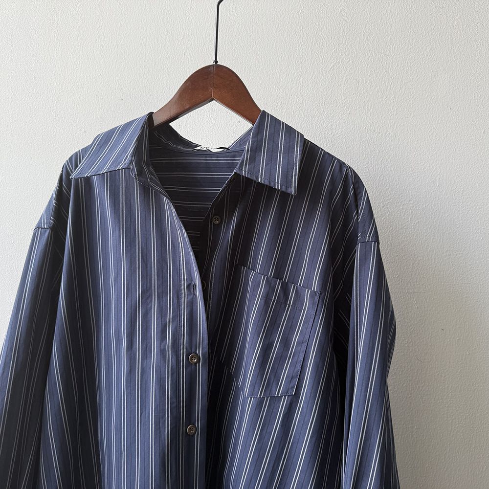 兩種尺寸/經典直條紋/開襟排釦/胸前口袋/長版襯衫/弧形下襬/前短後長 - 休閒渡假OL上班族配色條紋上衣雙線條紋襯衫上衣長袖上衣多尺寸ML深藍色象牙色