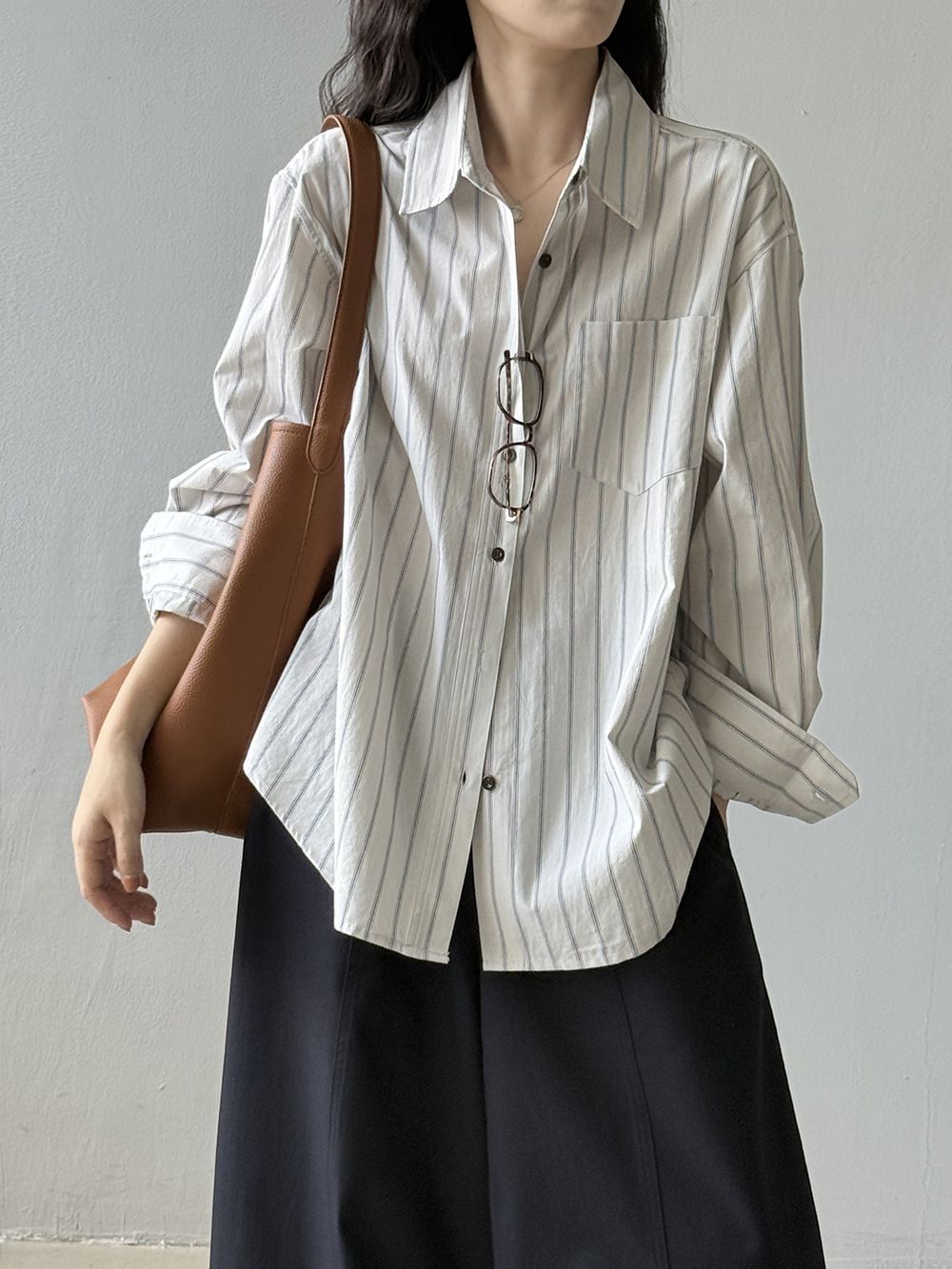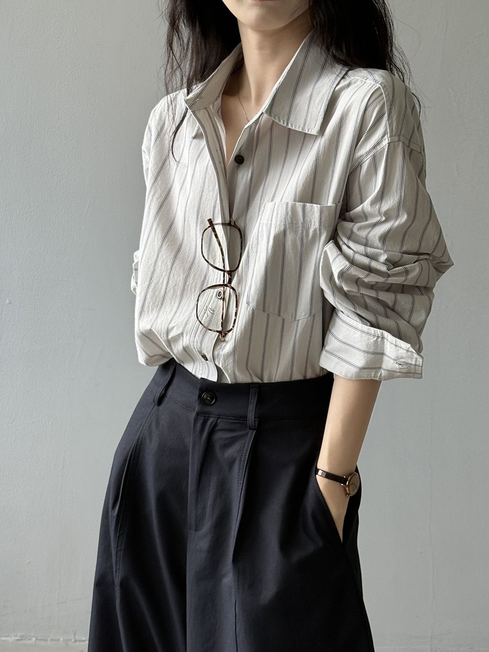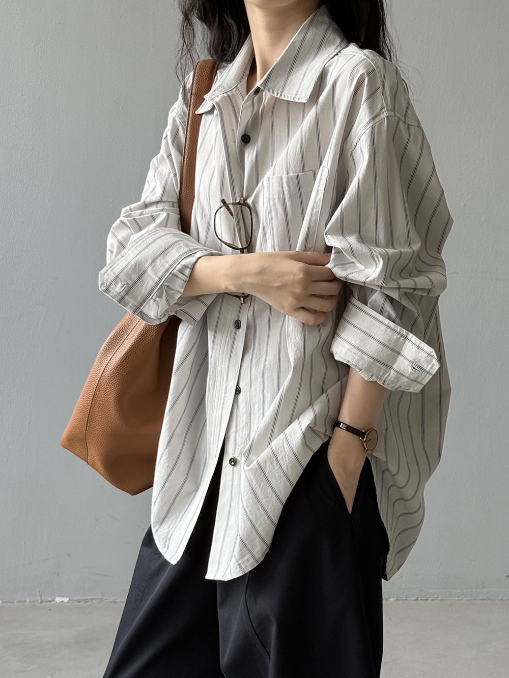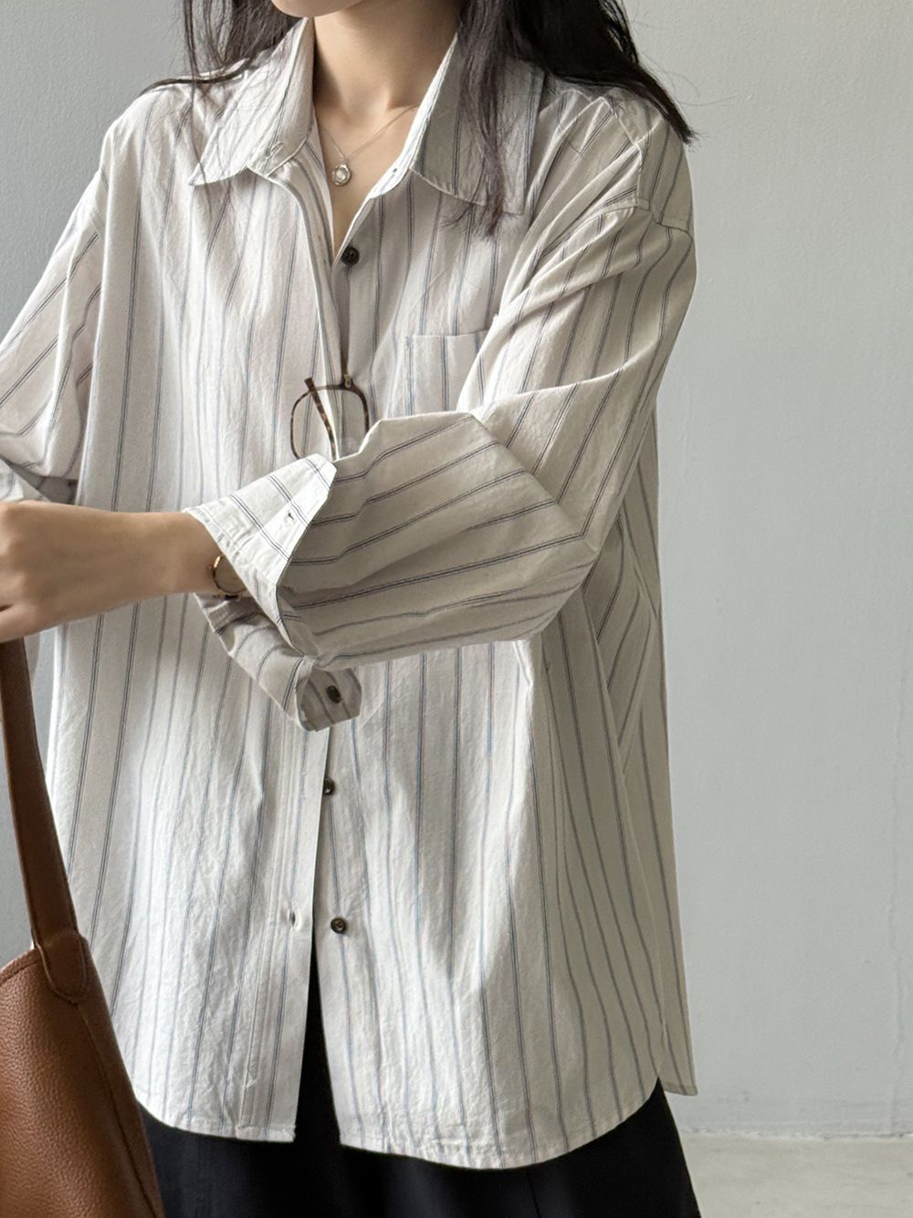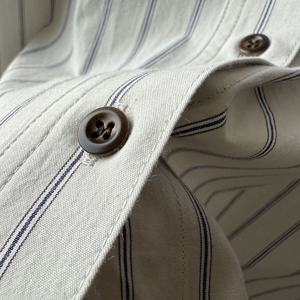 兩種尺寸/經典直條紋/開襟排釦/胸前口袋/長版襯衫/弧形下襬/前短後長 - 休閒渡假OL上班族配色條紋上衣雙線條紋襯衫上衣長袖上衣多尺寸ML深藍色象牙色