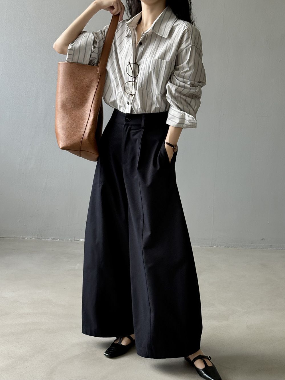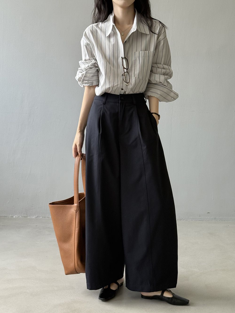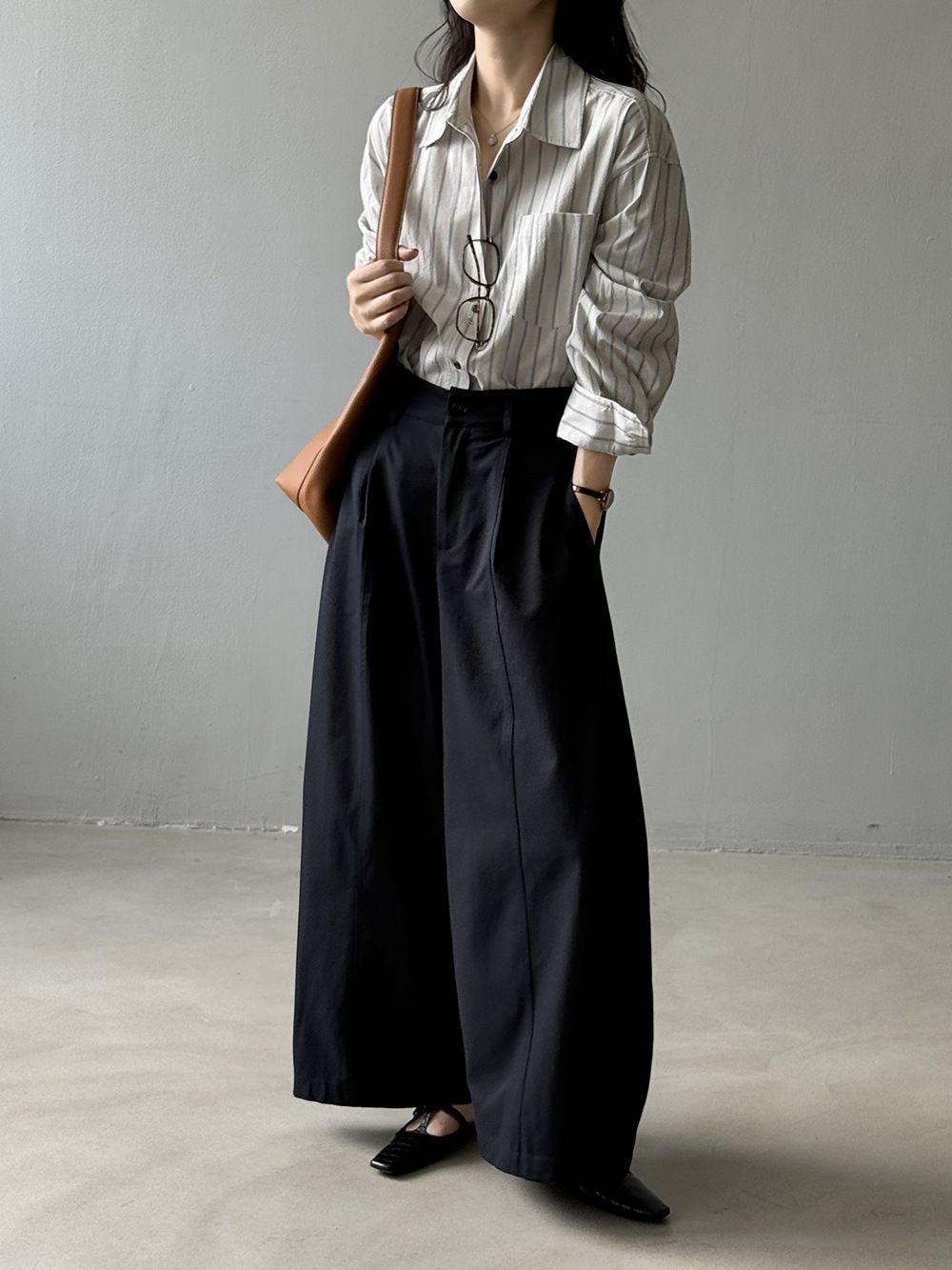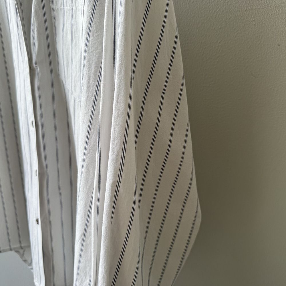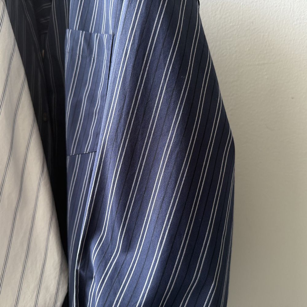 兩種尺寸/經典直條紋/開襟排釦/胸前口袋/長版襯衫/弧形下襬/前短後長 - 休閒渡假OL上班族配色條紋上衣雙線條紋襯衫上衣長袖上衣多尺寸ML深藍色象牙色