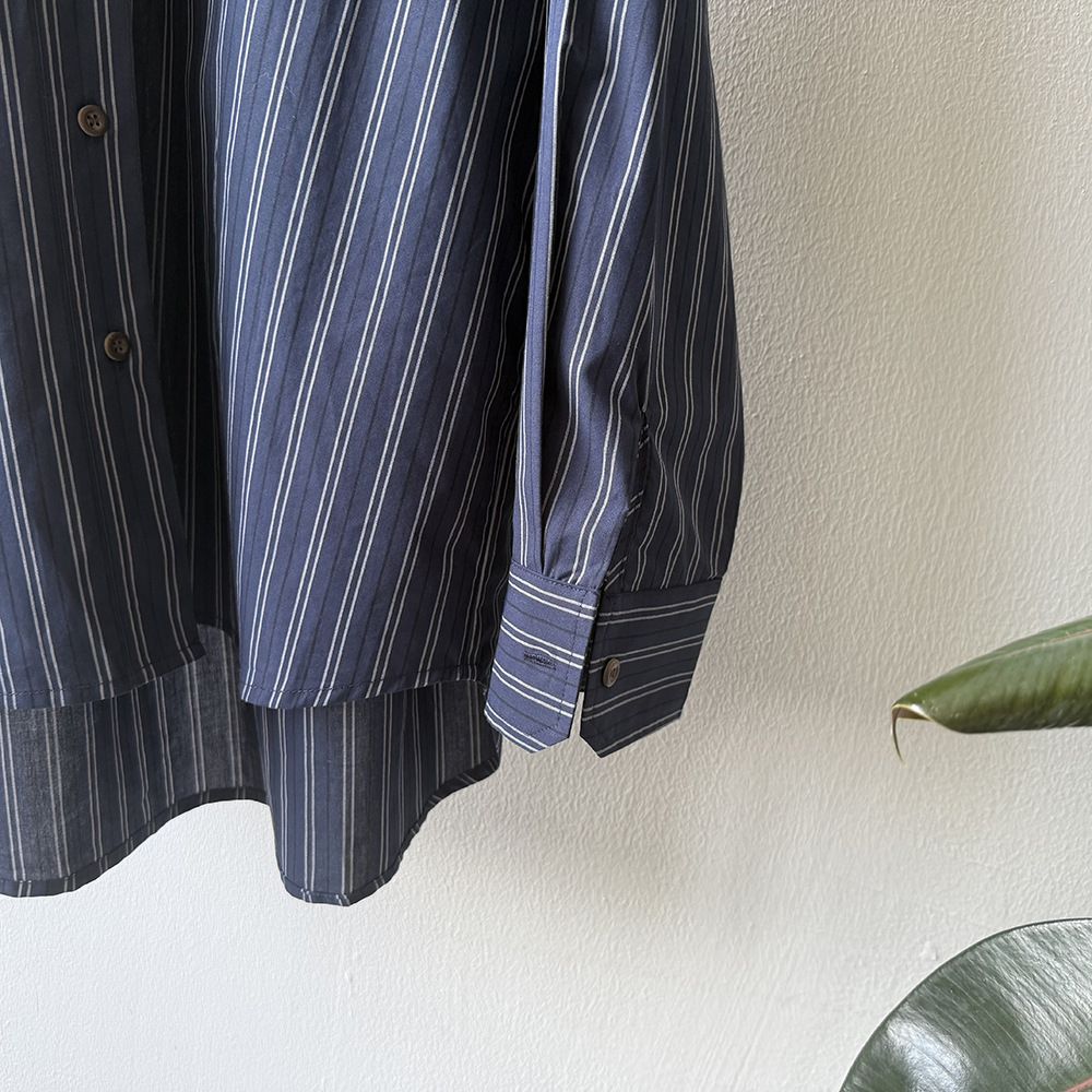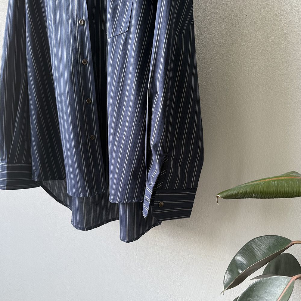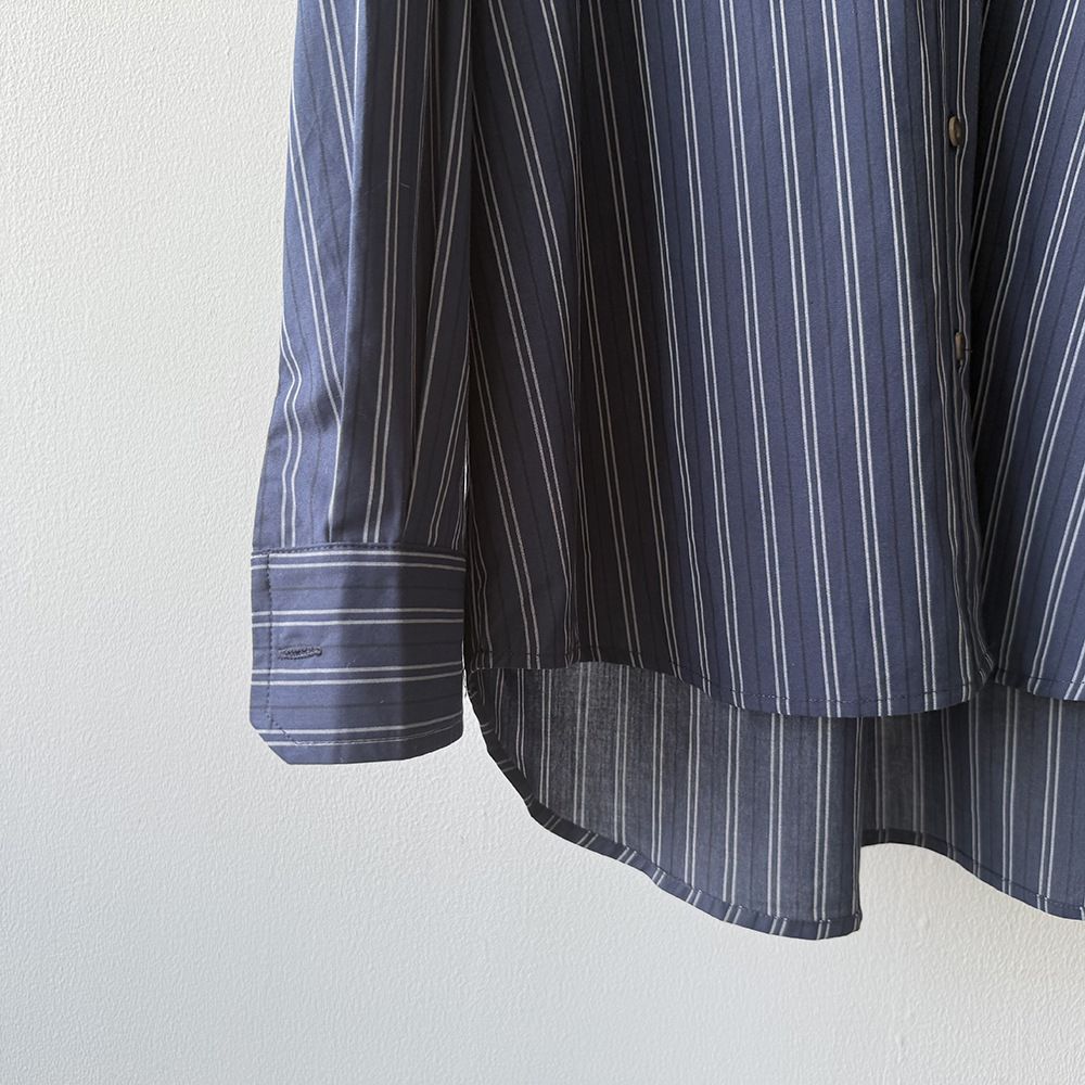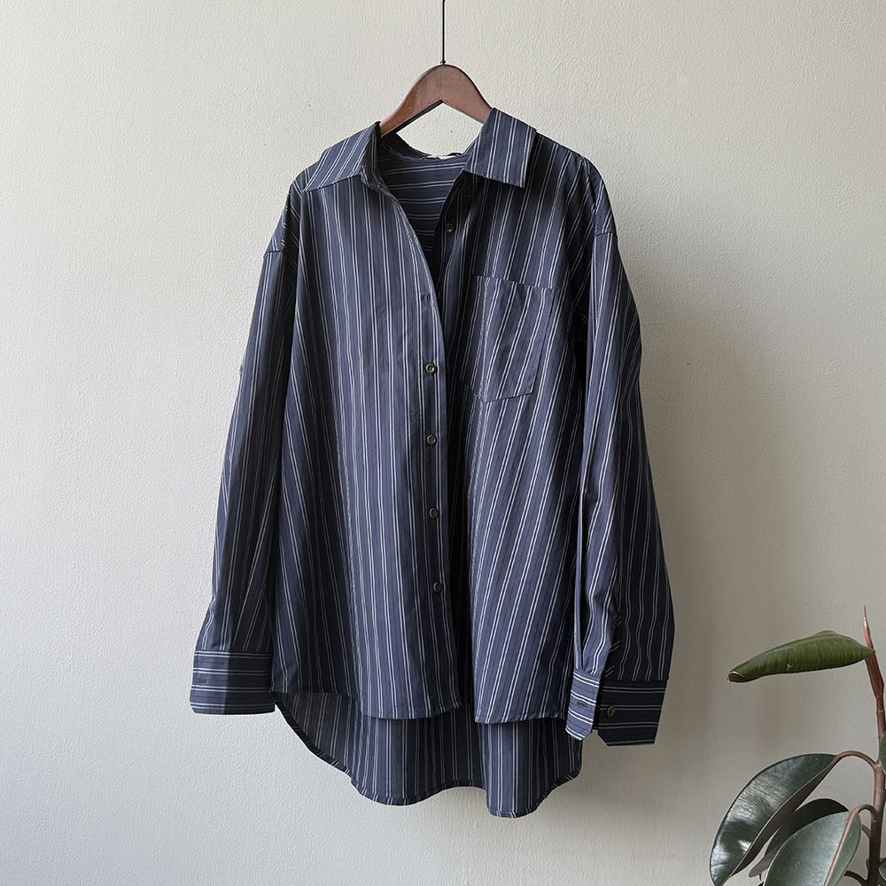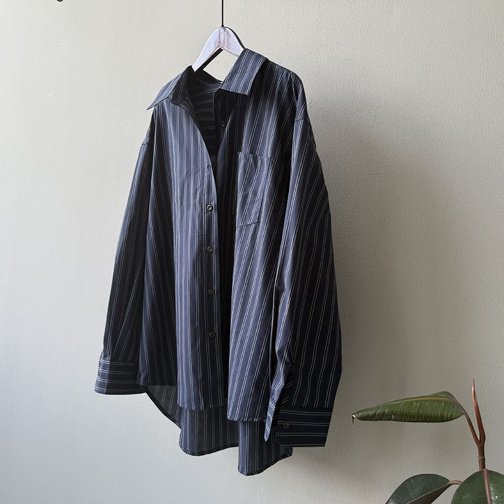 【C60002】品牌 雙線條紋襯衫-長版弧形下襬前短後長口袋長袖上衣★★