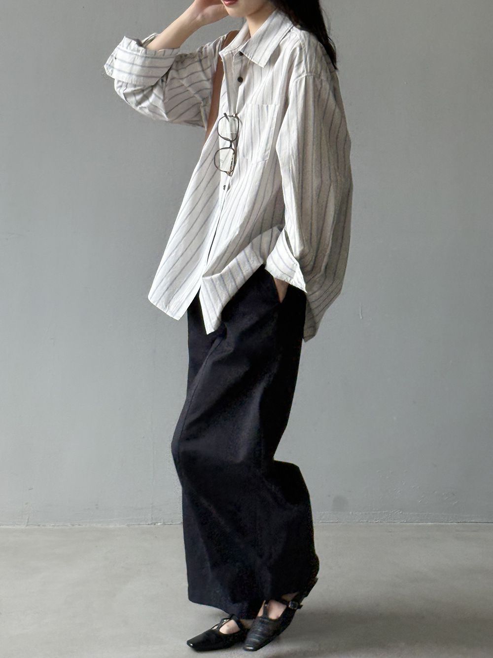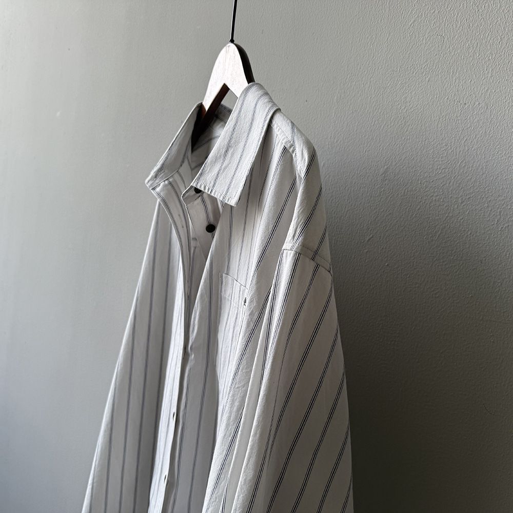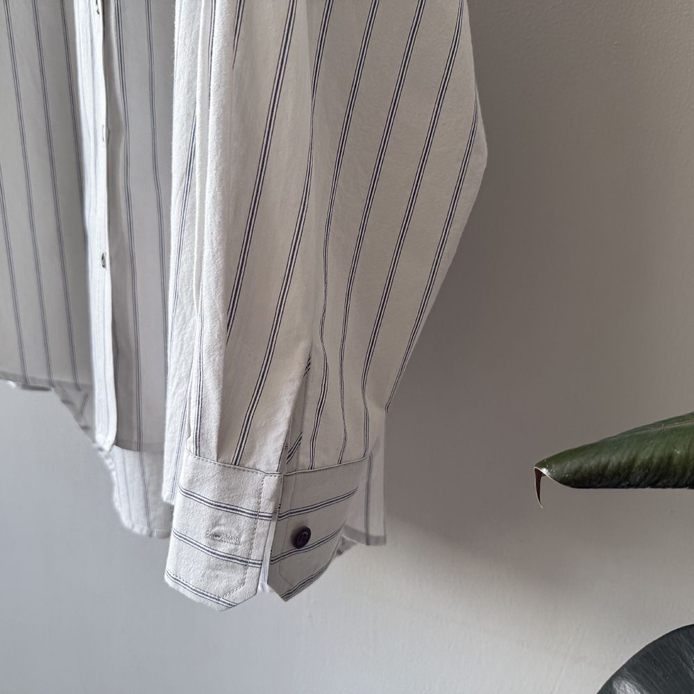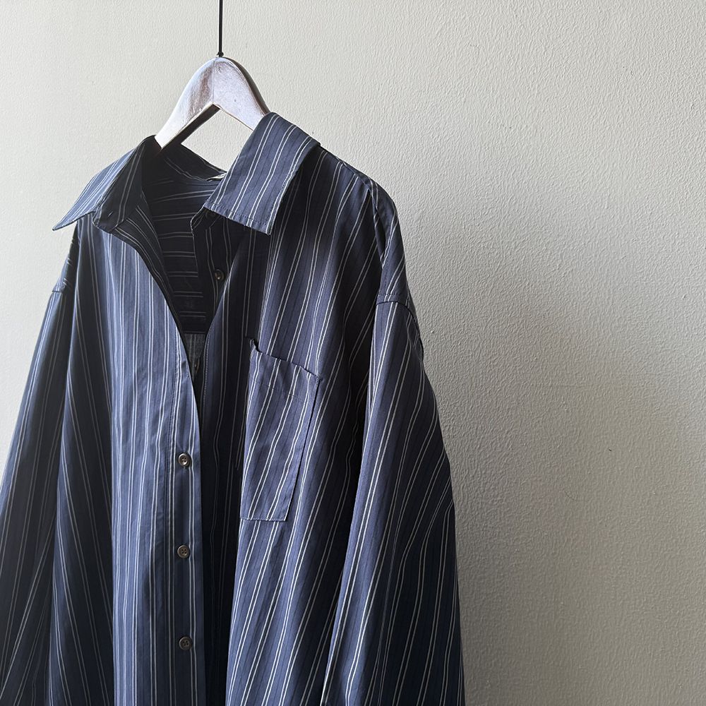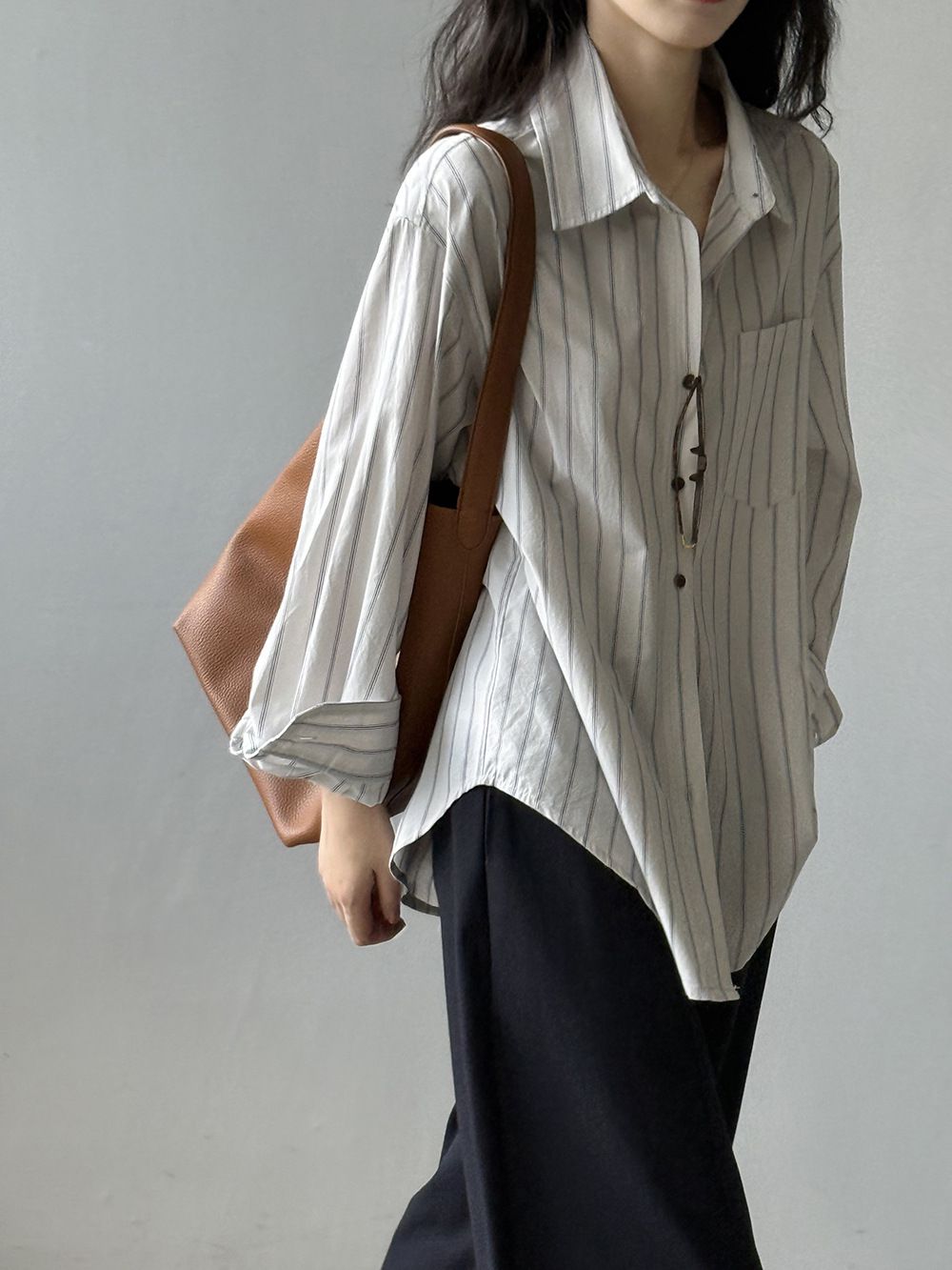 【C60002】品牌 雙線條紋襯衫-長版弧形下襬前短後長口袋長袖上衣★★