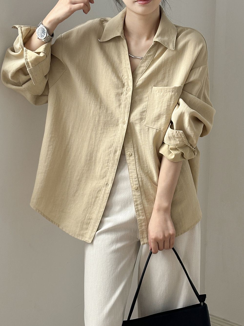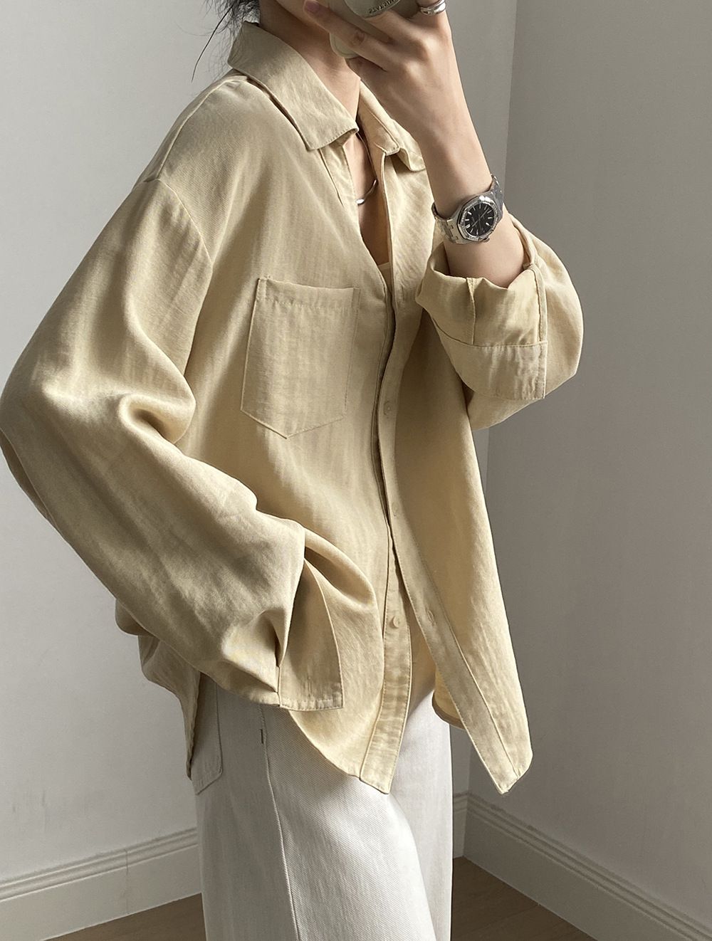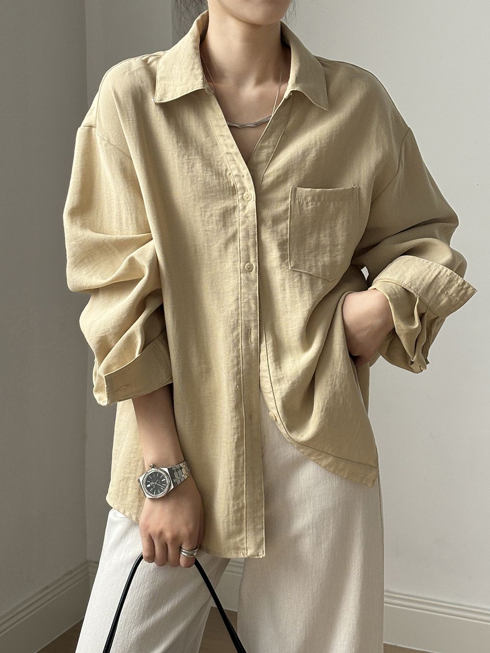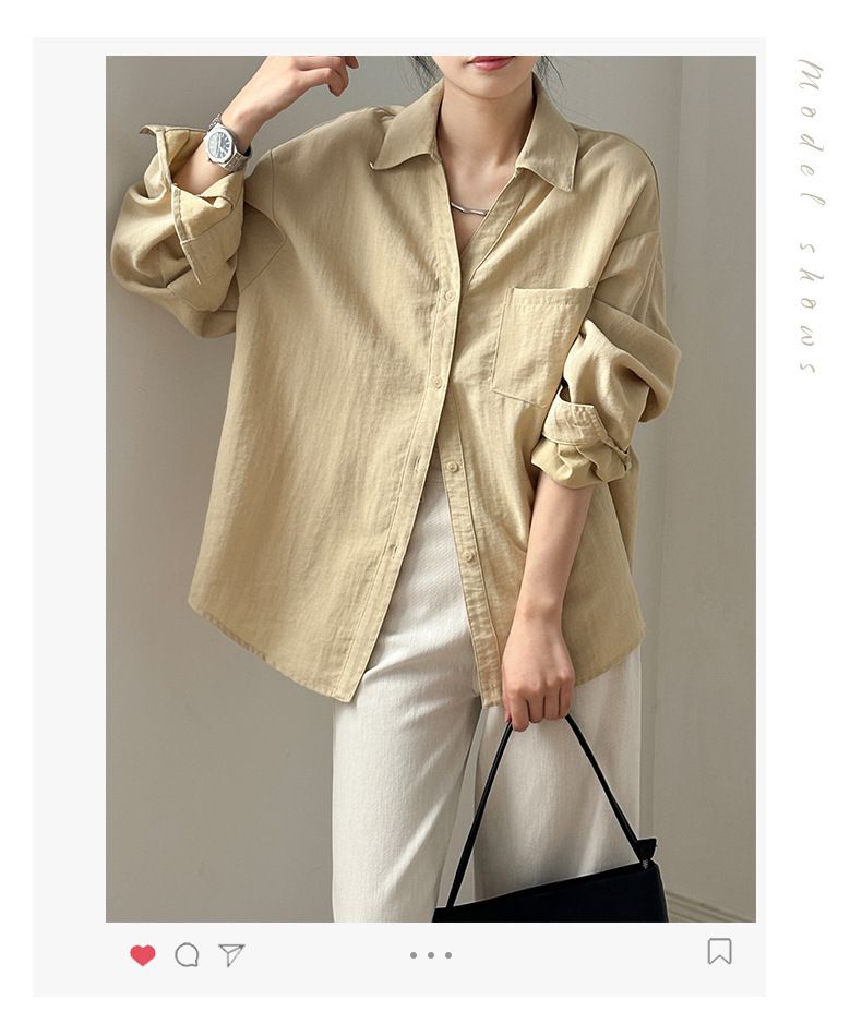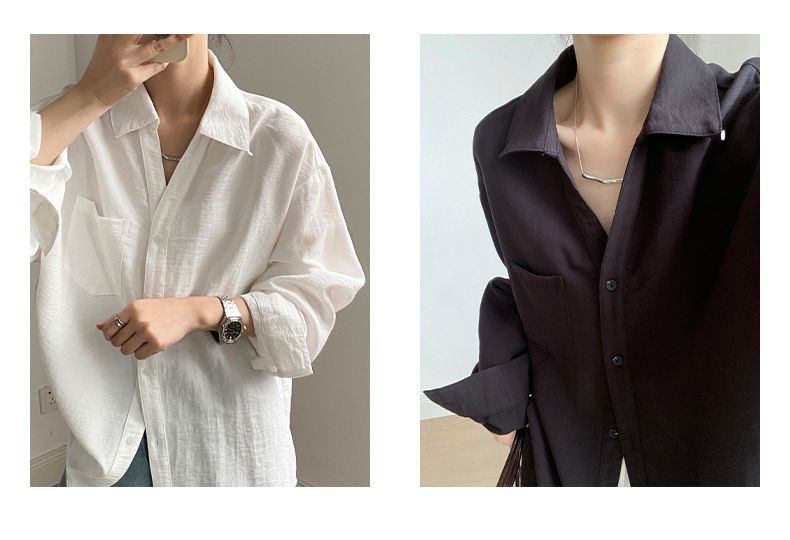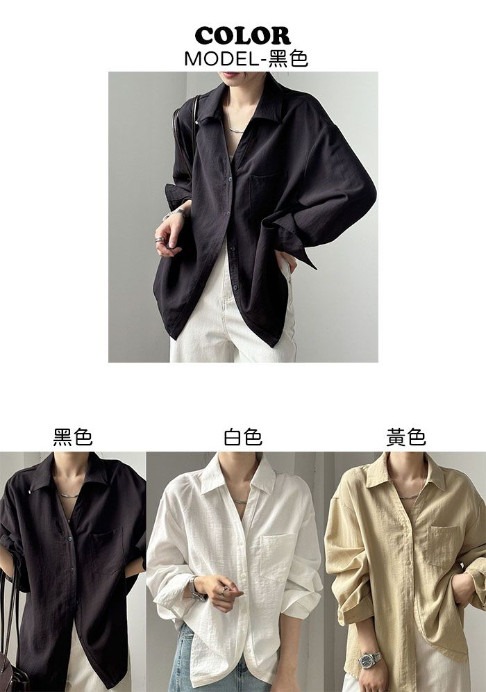 兩種尺寸/輕薄混亞麻/Y字領/V領/開襟排釦/同色系鈕釦/胸前口袋/弧形下版/前短後長/寬鬆長版 - 休閒居家OL上班族簡約百搭素面寬鬆口袋襯衫上衣長袖襯衫寬鬆大尺碼上衣長版長袖上衣多尺寸ML黑色白色黃色