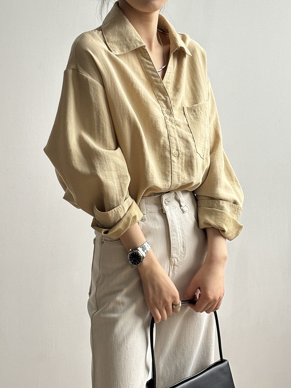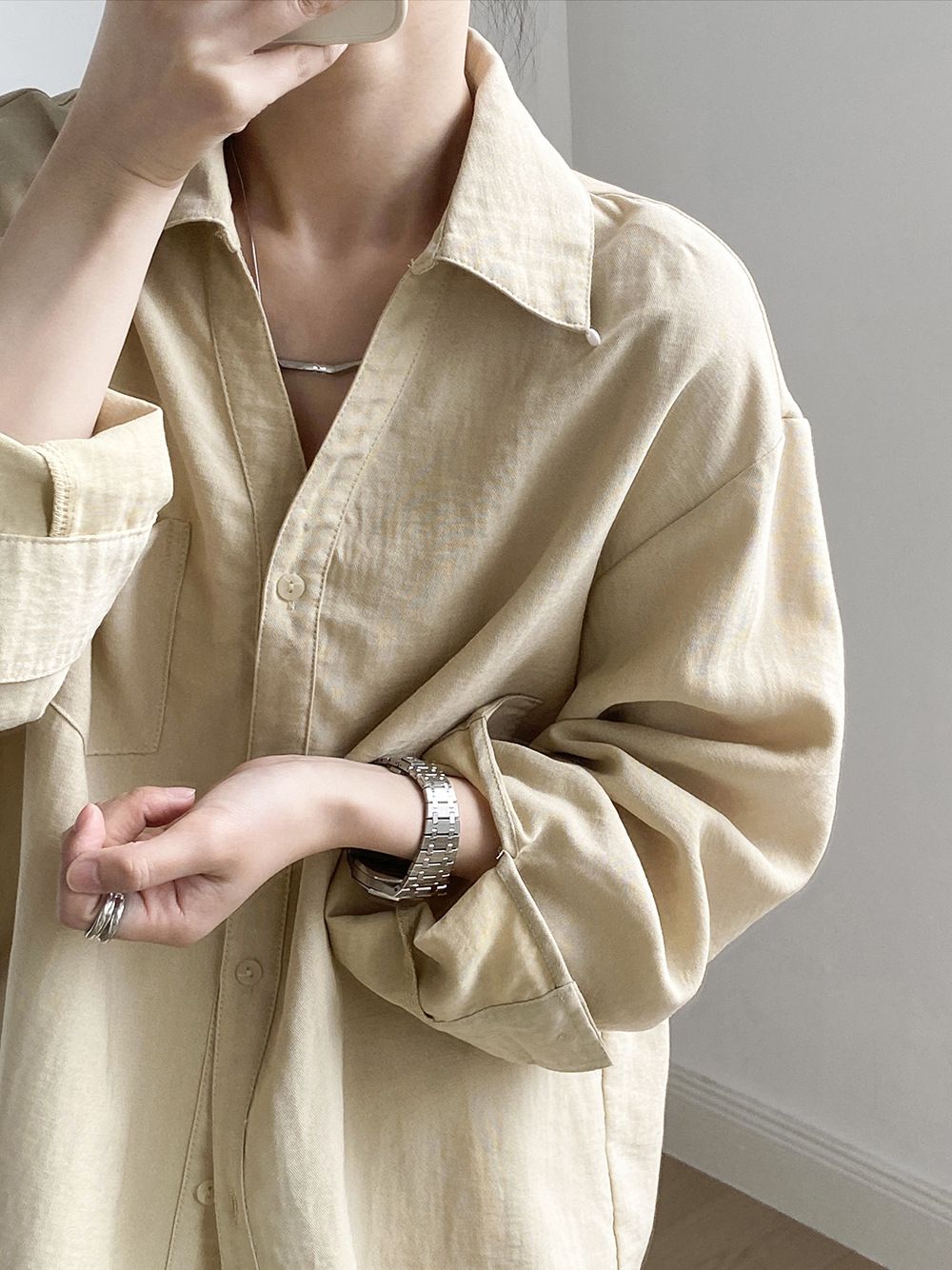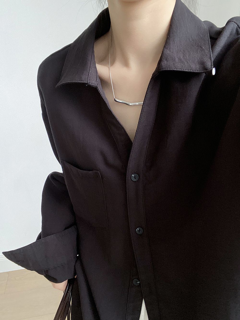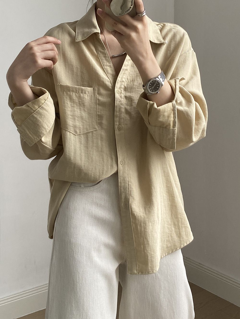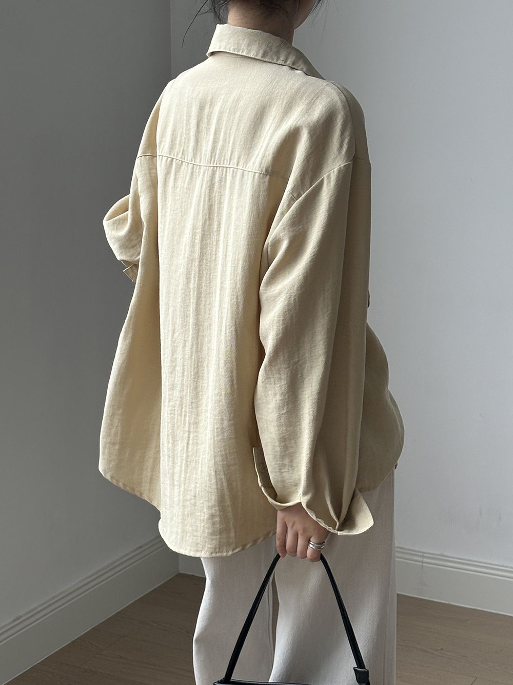 兩種尺寸/輕薄混亞麻/Y字領/V領/開襟排釦/同色系鈕釦/胸前口袋/弧形下版/前短後長/寬鬆長版 - 休閒居家OL上班族簡約百搭素面寬鬆口袋襯衫上衣長袖襯衫寬鬆大尺碼上衣長版長袖上衣多尺寸ML黑色白色黃色