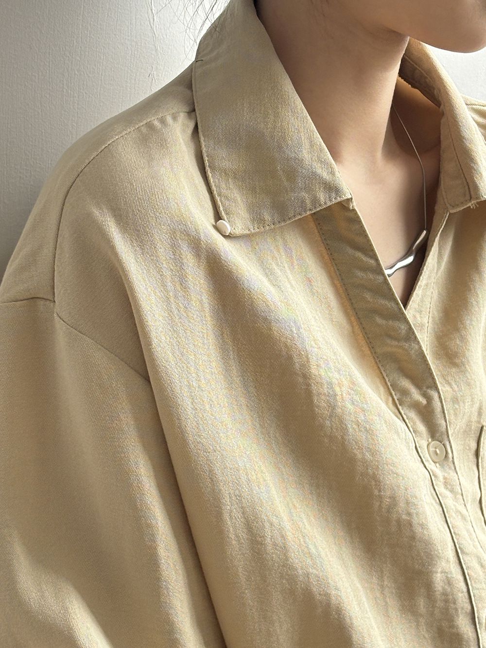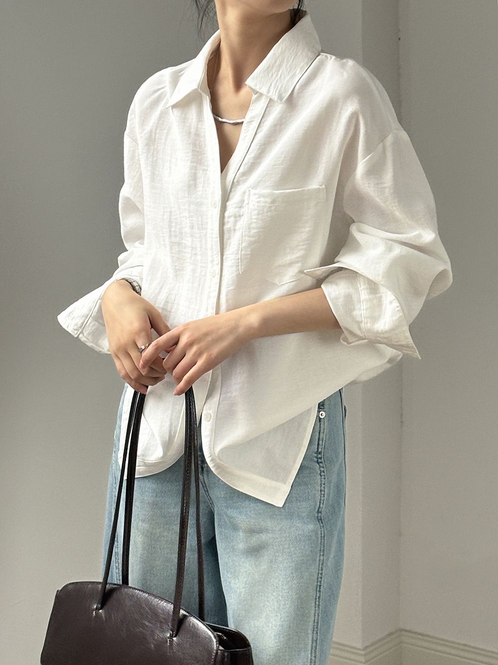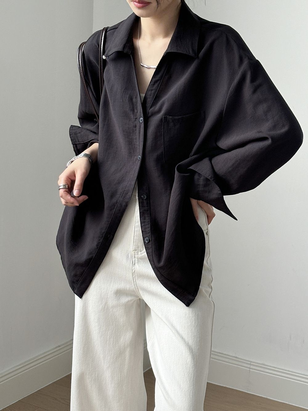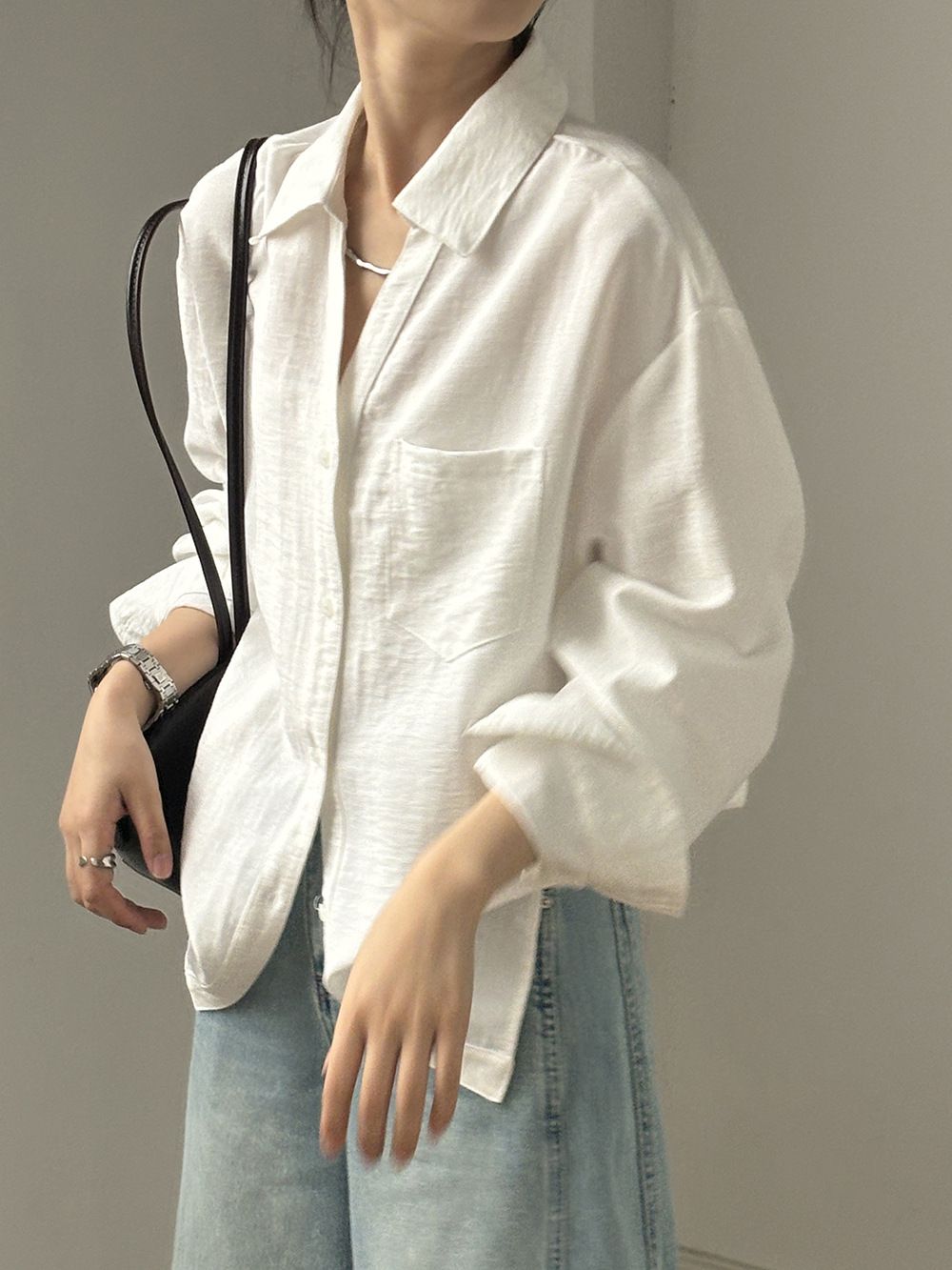 兩種尺寸/輕薄混亞麻/Y字領/V領/開襟排釦/同色系鈕釦/胸前口袋/弧形下版/前短後長/寬鬆長版 - 休閒居家OL上班族簡約百搭素面寬鬆口袋襯衫上衣長袖襯衫寬鬆大尺碼上衣長版長袖上衣多尺寸ML黑色白色黃色