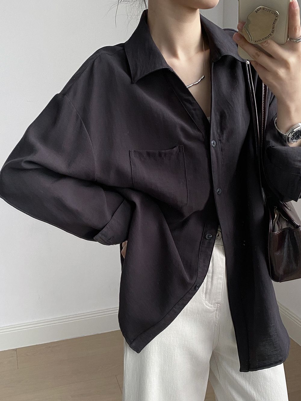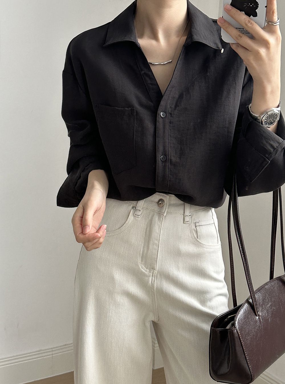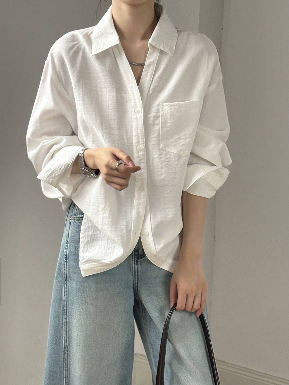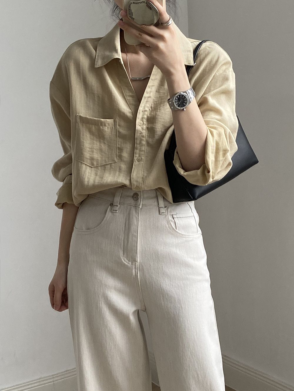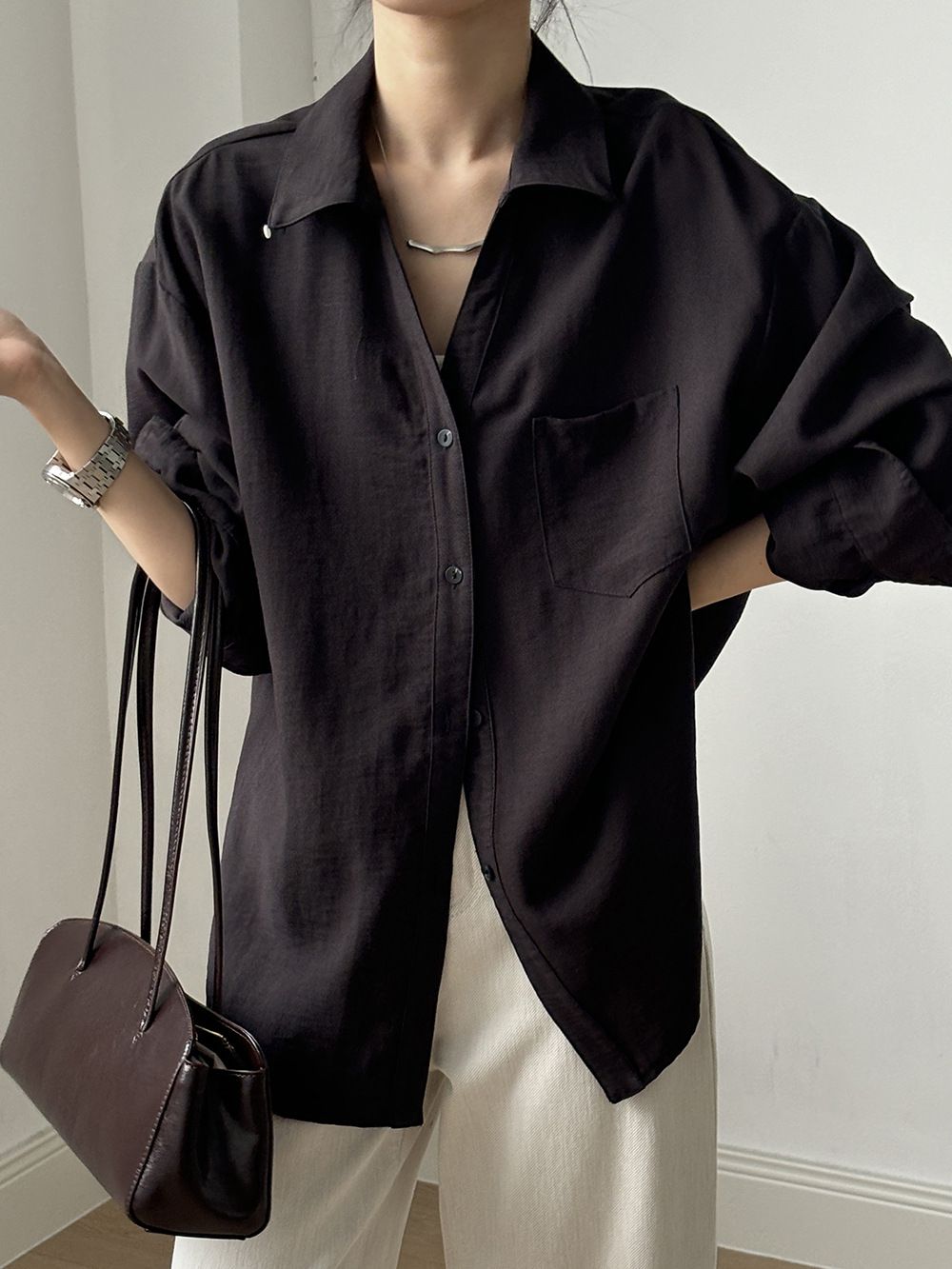 兩種尺寸/輕薄混亞麻/Y字領/V領/開襟排釦/同色系鈕釦/胸前口袋/弧形下版/前短後長/寬鬆長版 - 休閒居家OL上班族簡約百搭素面寬鬆口袋襯衫上衣長袖襯衫寬鬆大尺碼上衣長版長袖上衣多尺寸ML黑色白色黃色
