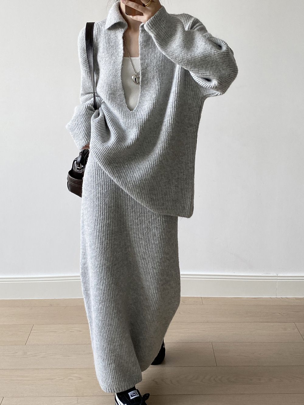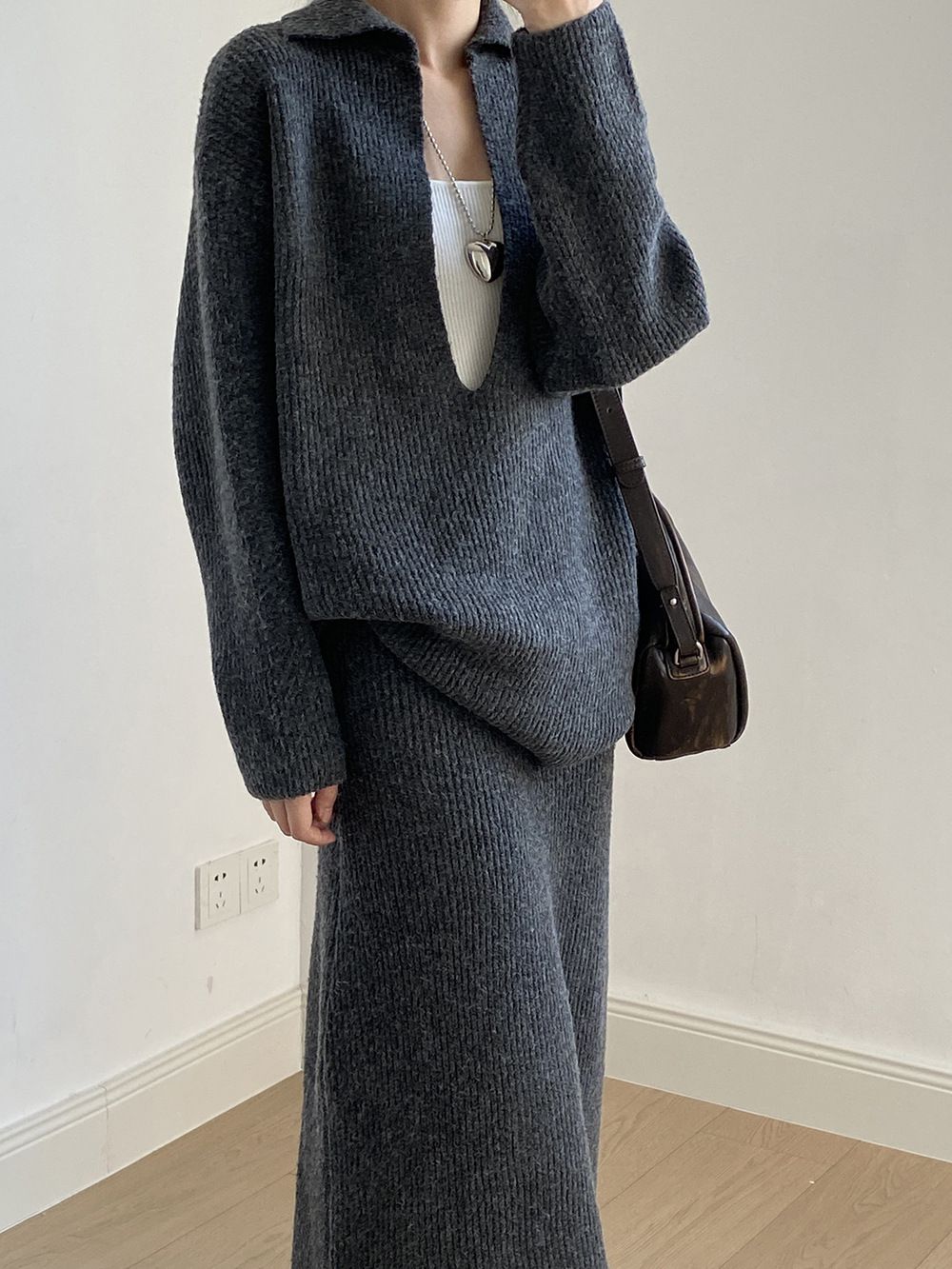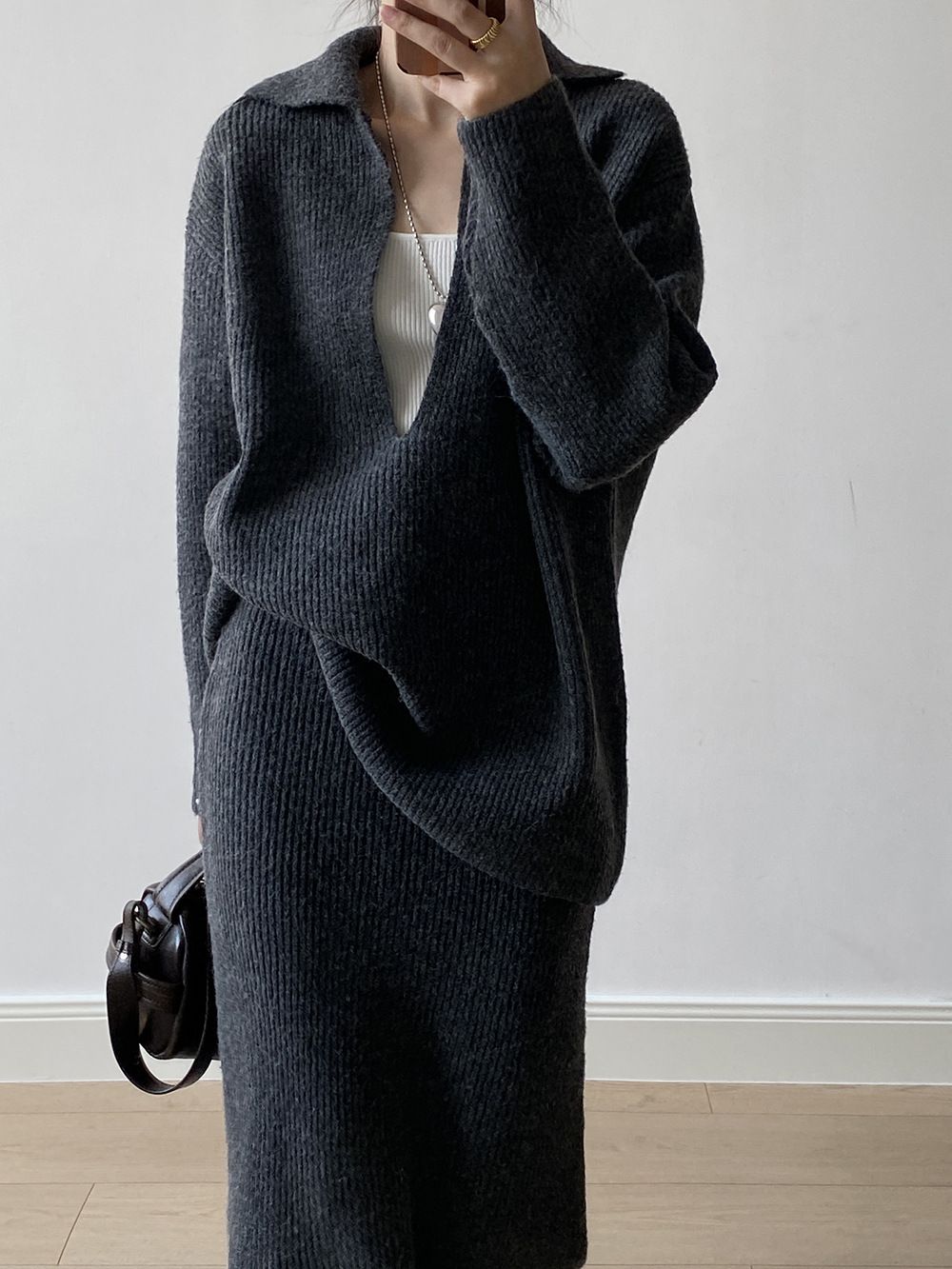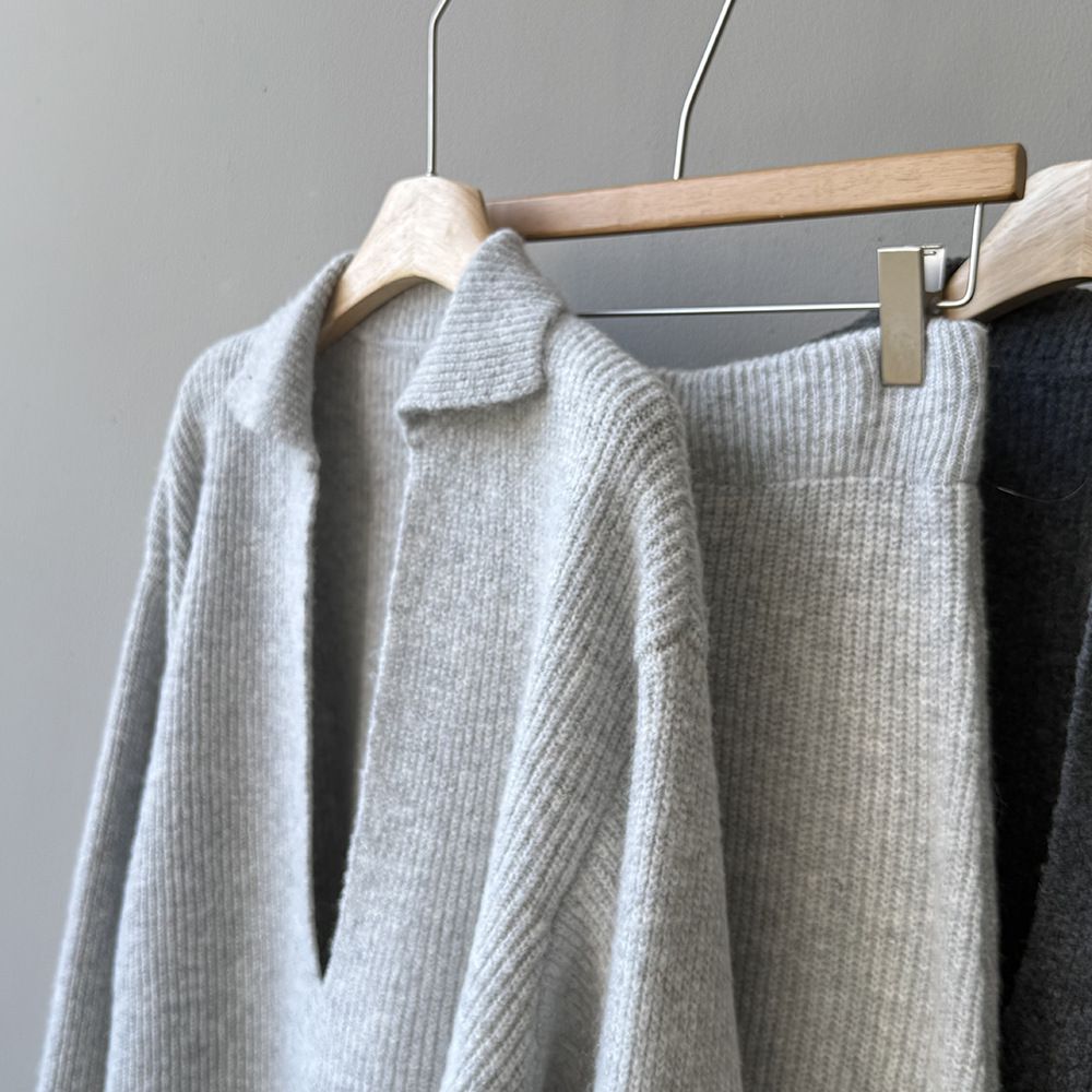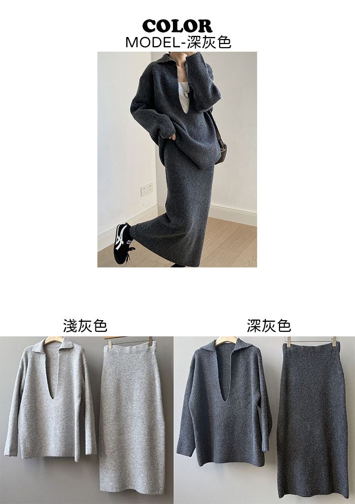 【C60014】品牌 深V領針織套裝-翻領長版長袖上衣+素面直筒長裙★★