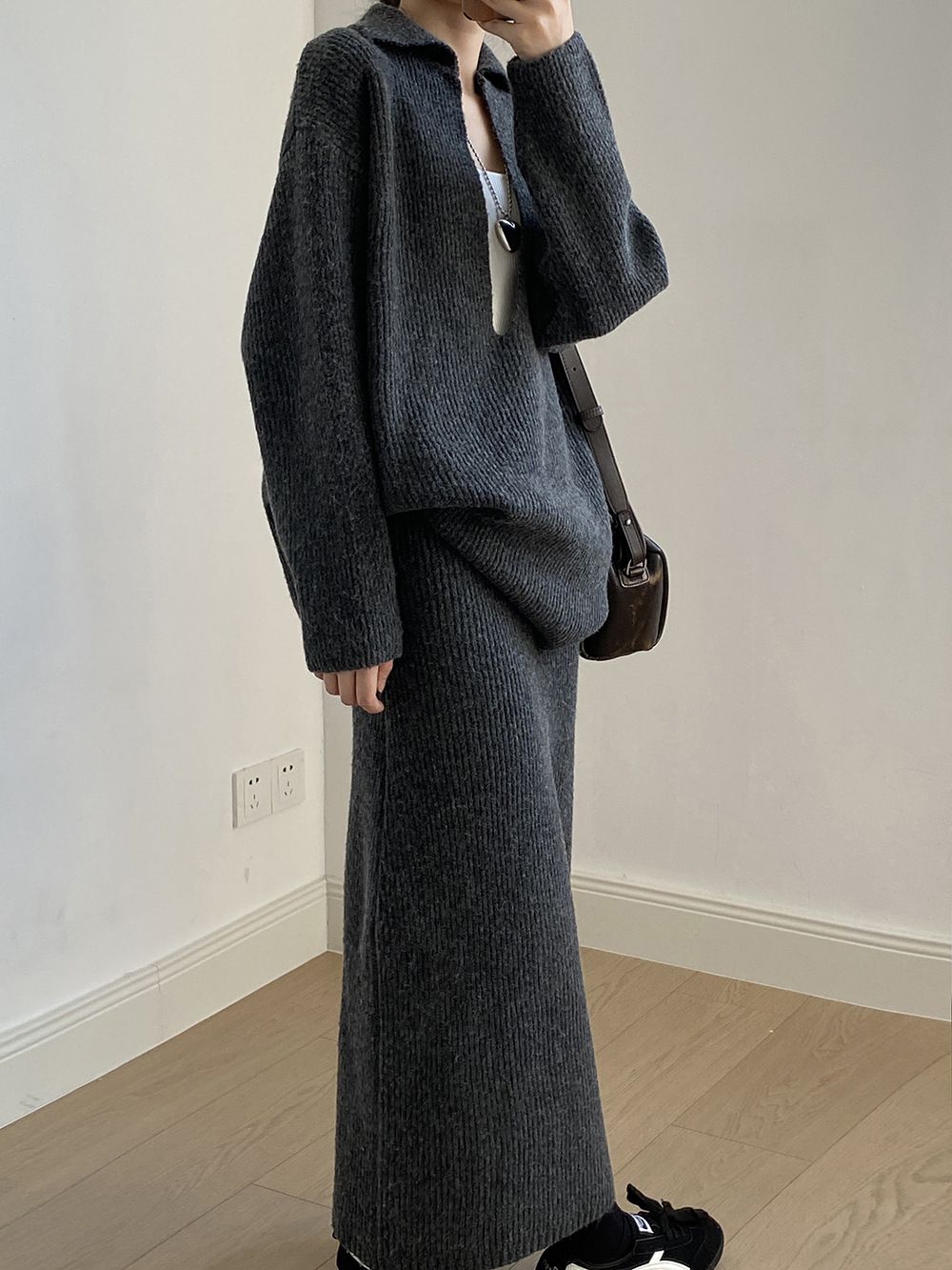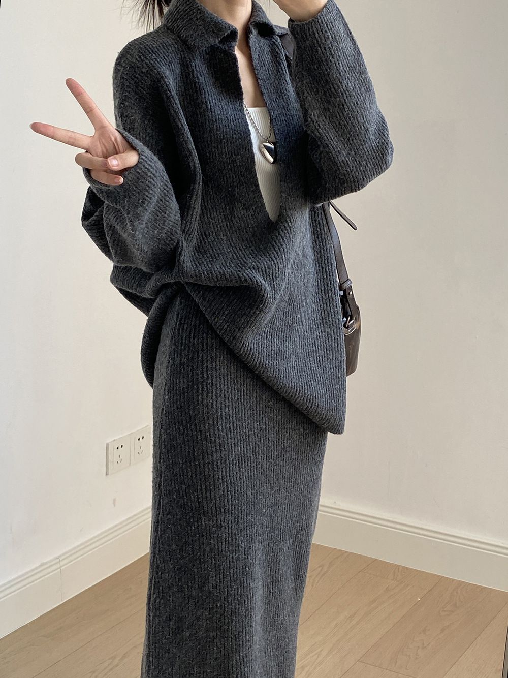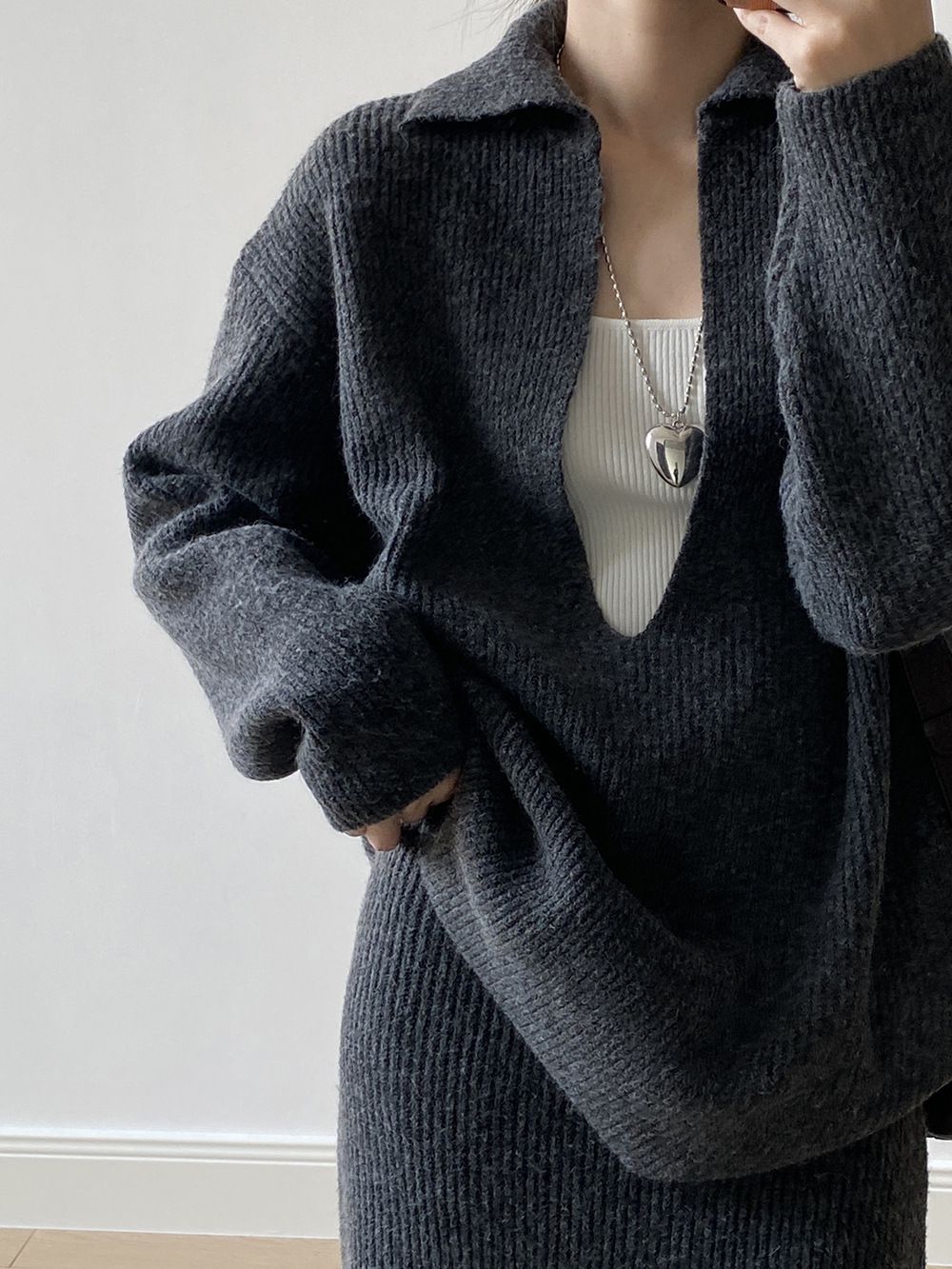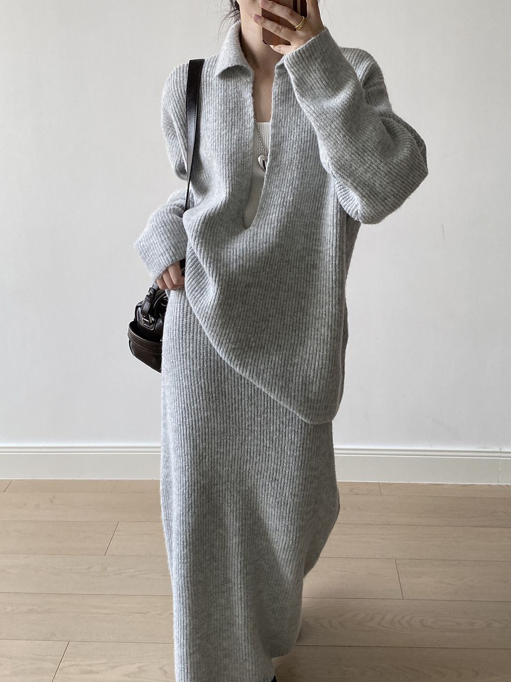 【C60014】品牌 深V領針織套裝-翻領長版長袖上衣+素面直筒長裙★★