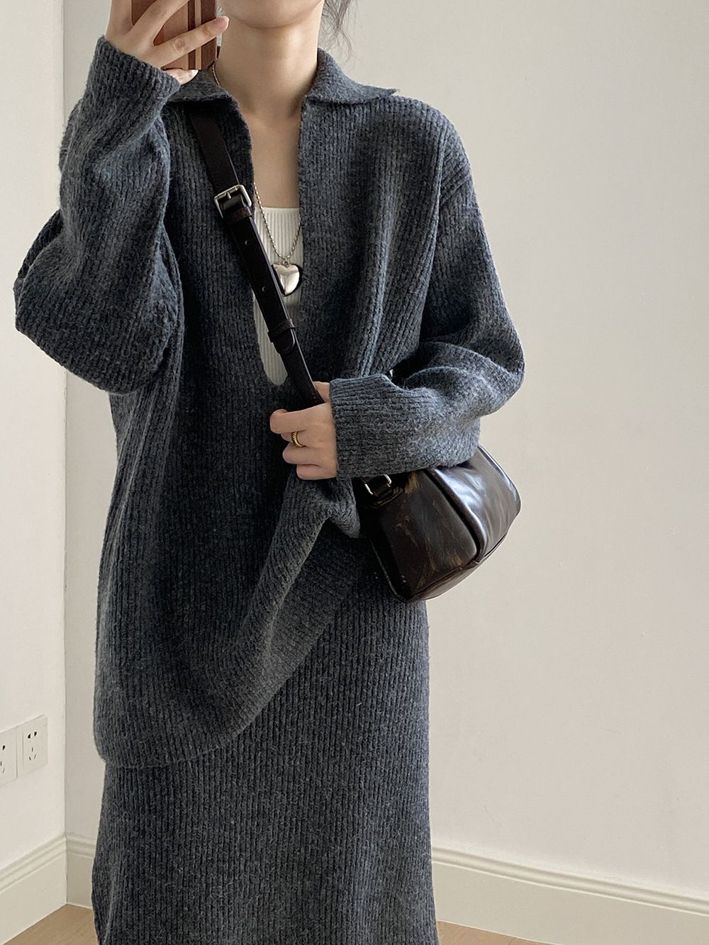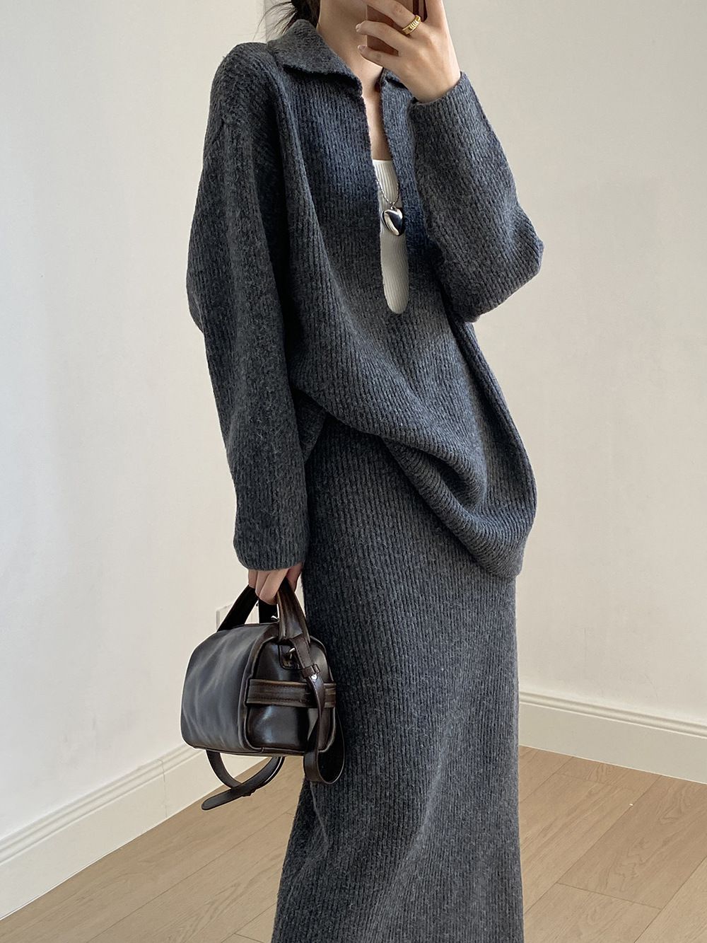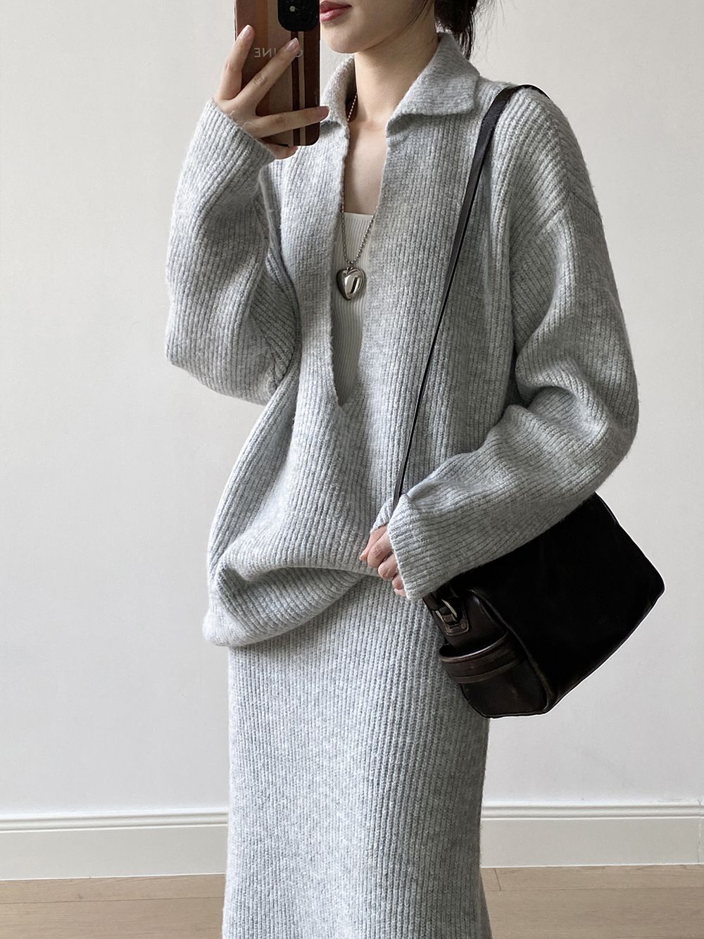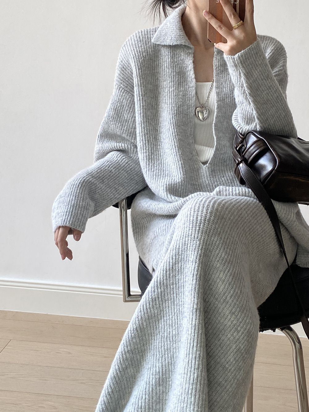 【C60014】品牌 深V領針織套裝-翻領長版長袖上衣+素面直筒長裙★★