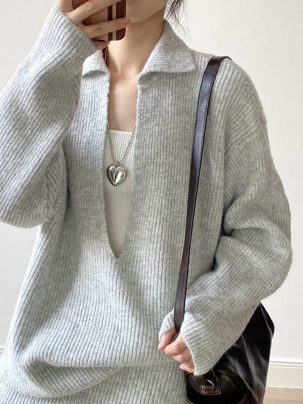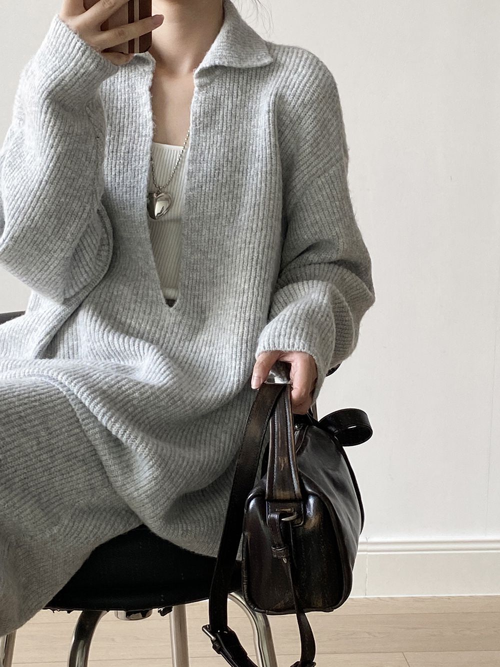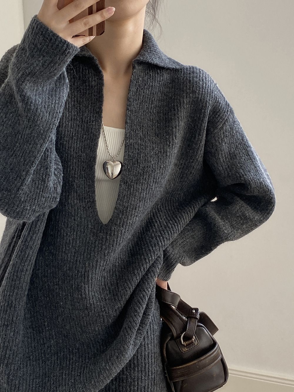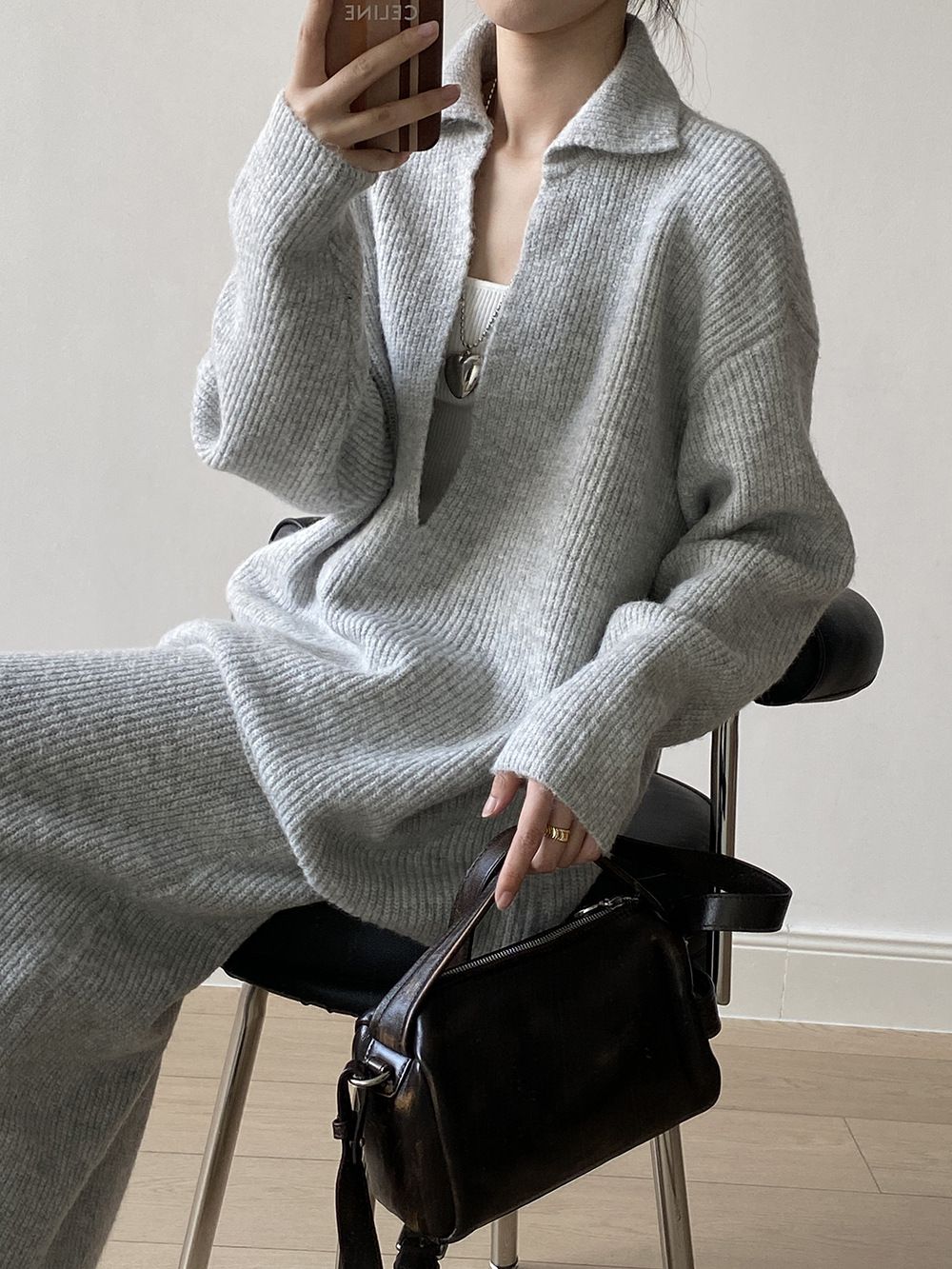 【C60014】品牌 深V領針織套裝-翻領長版長袖上衣+素面直筒長裙★★