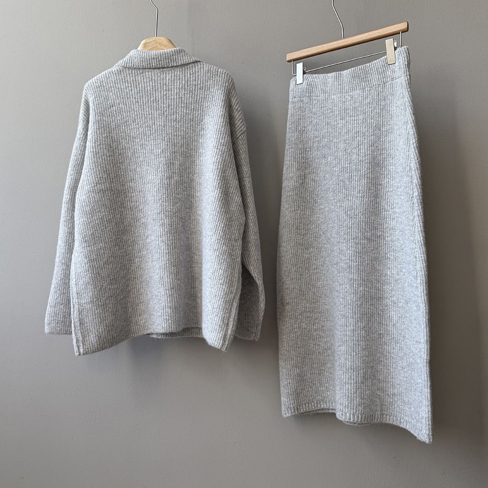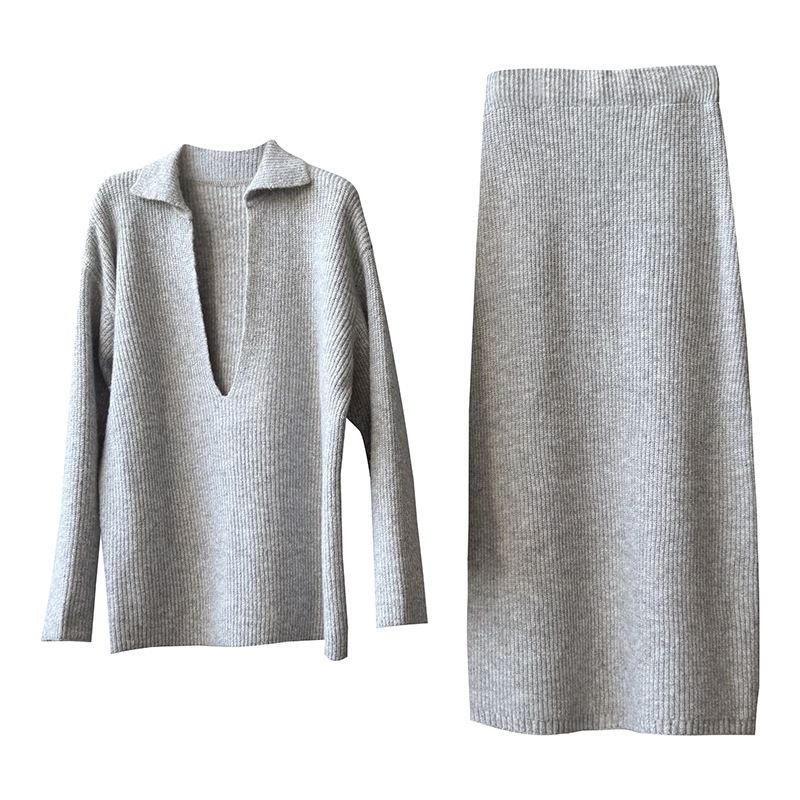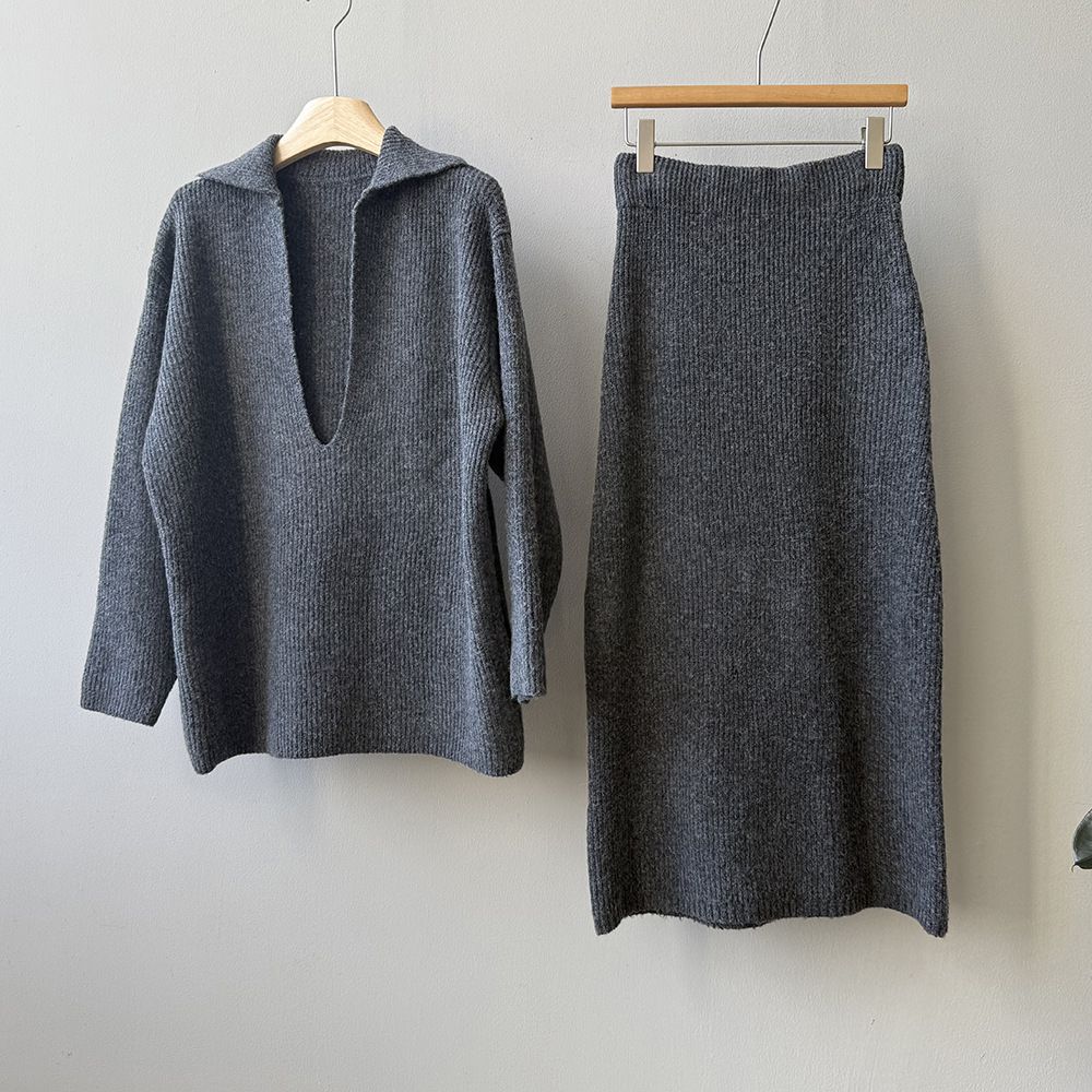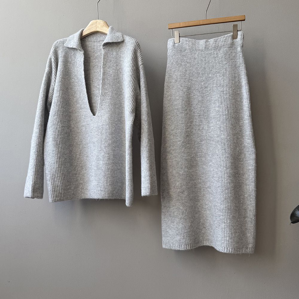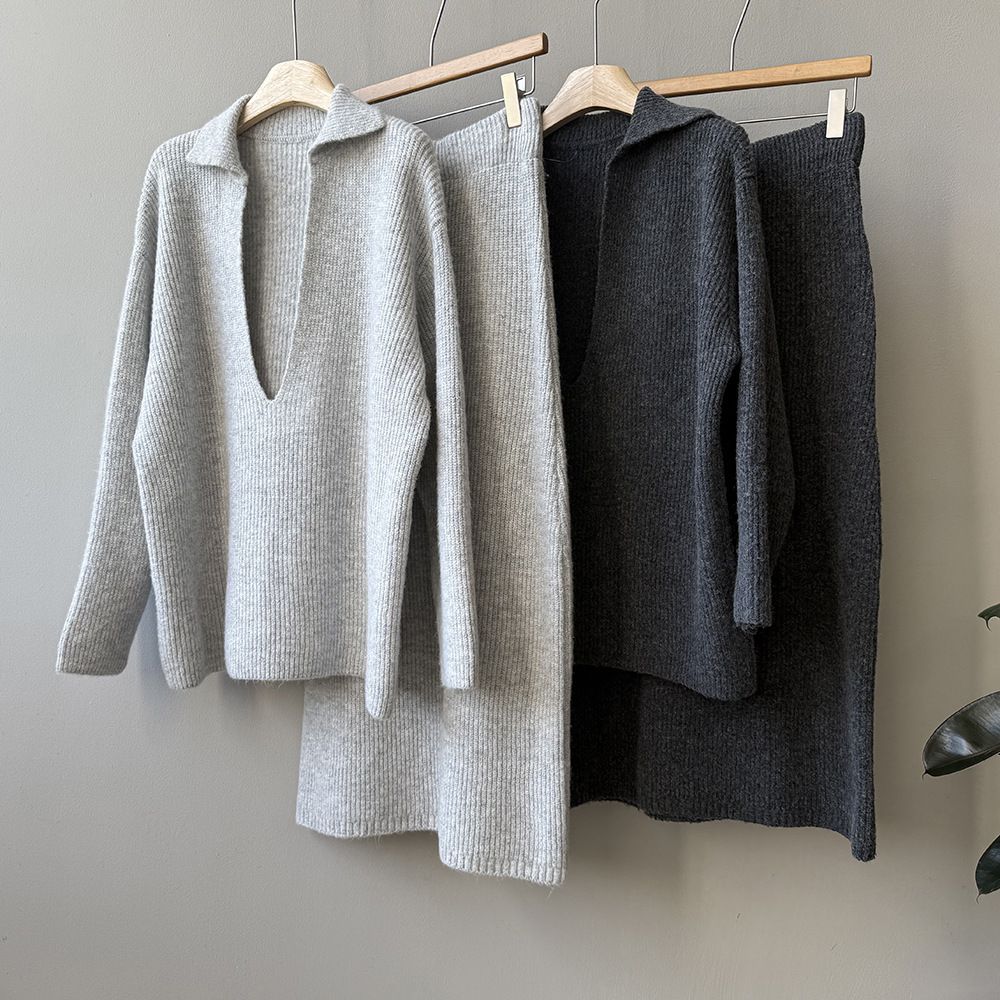 超值兩件組/保暖混羊毛/翻領.V領(無內搭)/坑條針織/落肩長袖/長版上衣/全腰鬆緊/無口袋/窄裙 - 休閒居家婚禮OL上班族簡約百搭素面兩件式套裝深V領針織套裝長袖上衣直筒裙長裙