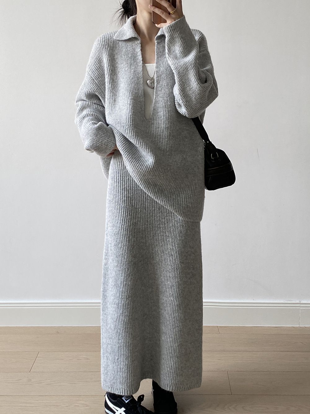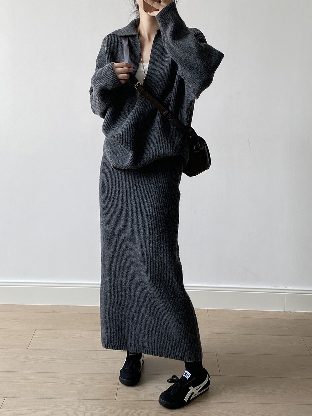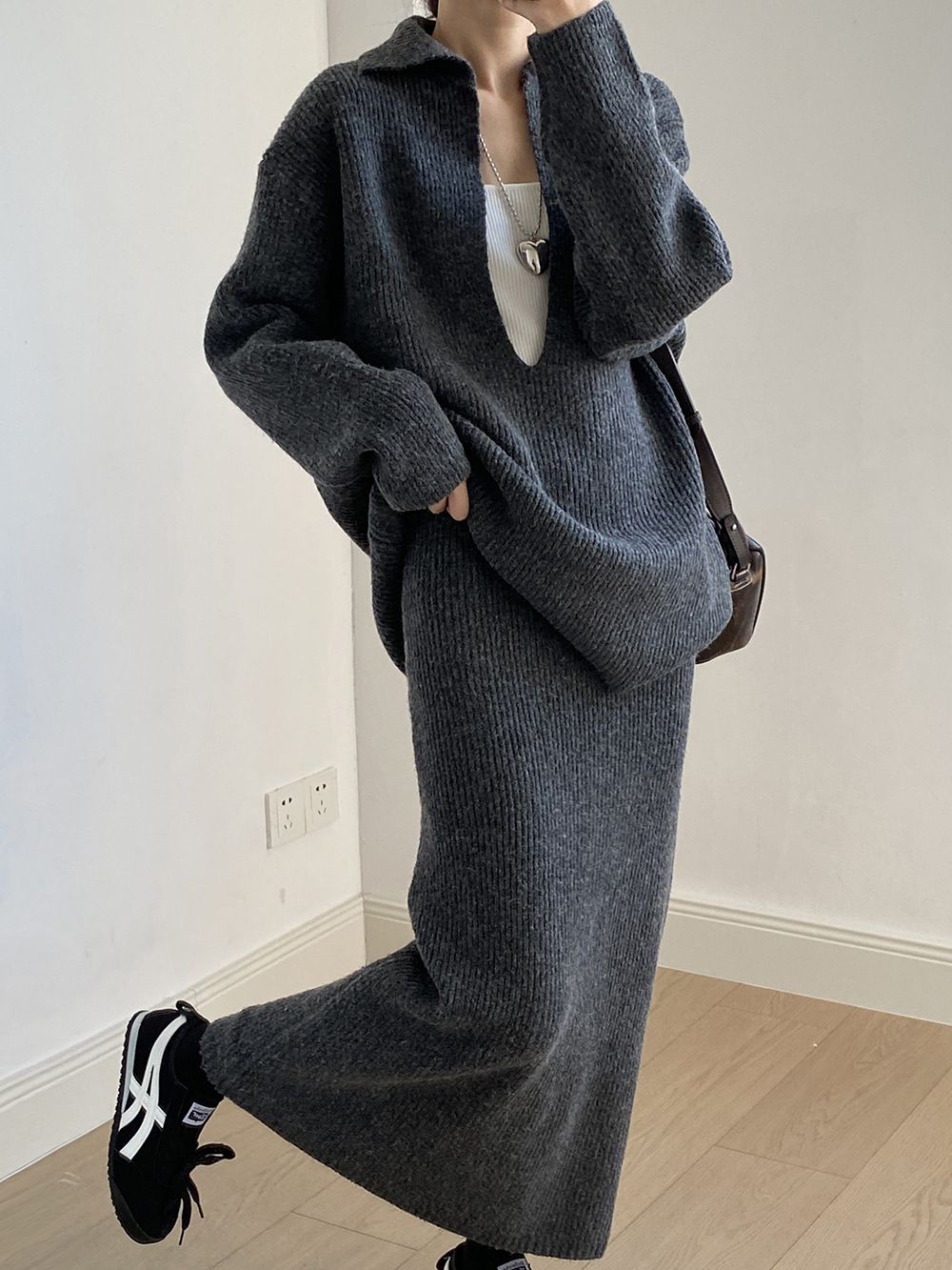 超值兩件組/保暖混羊毛/翻領.V領(無內搭)/坑條針織/落肩長袖/長版上衣/全腰鬆緊/無口袋/窄裙 - 休閒居家婚禮OL上班族簡約百搭素面兩件式套裝深V領針織套裝長袖上衣直筒裙長裙