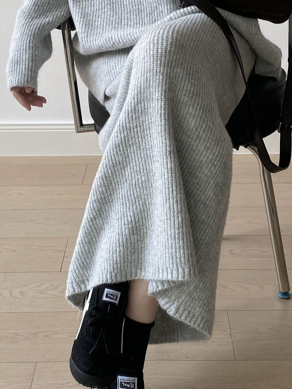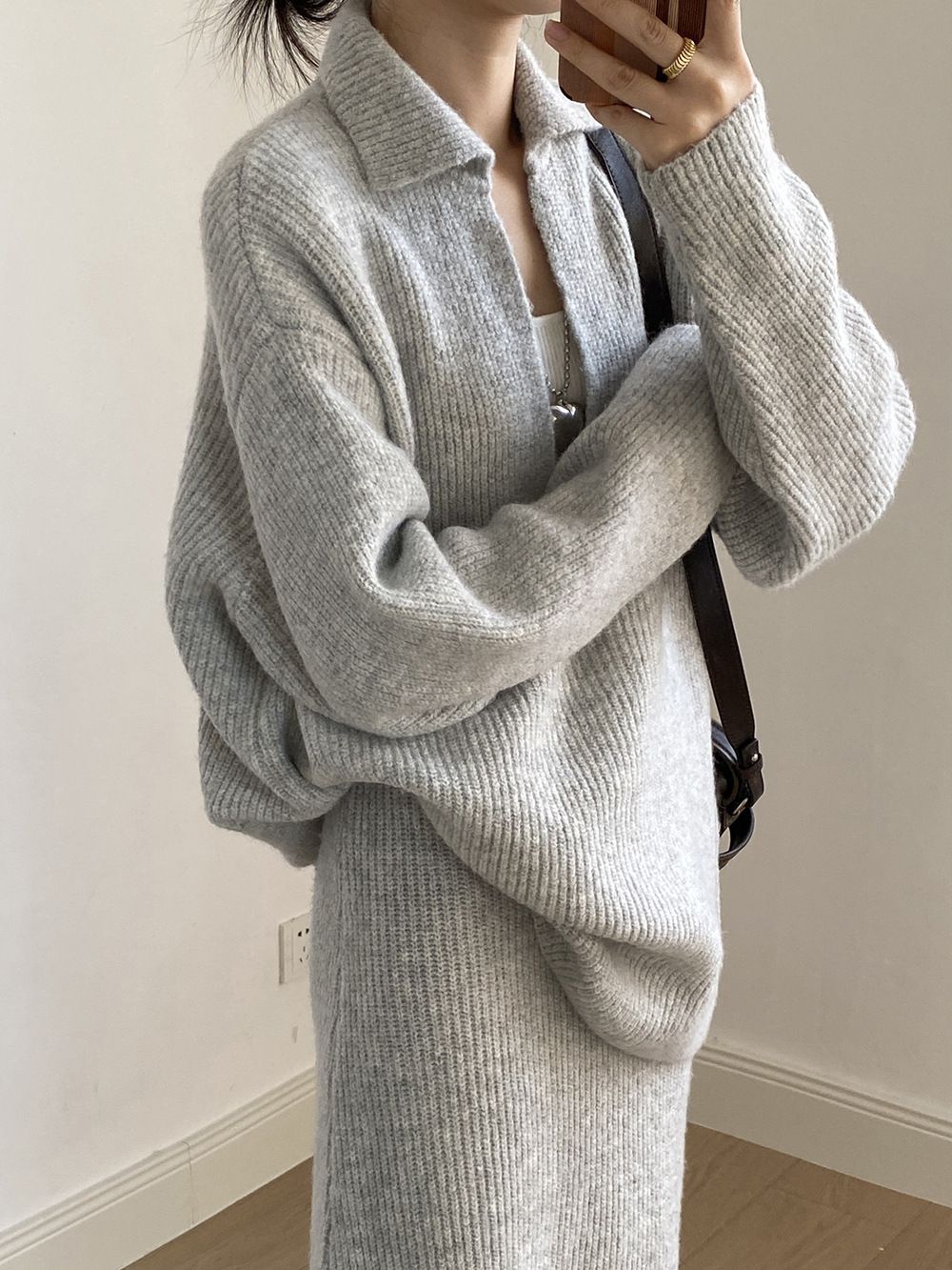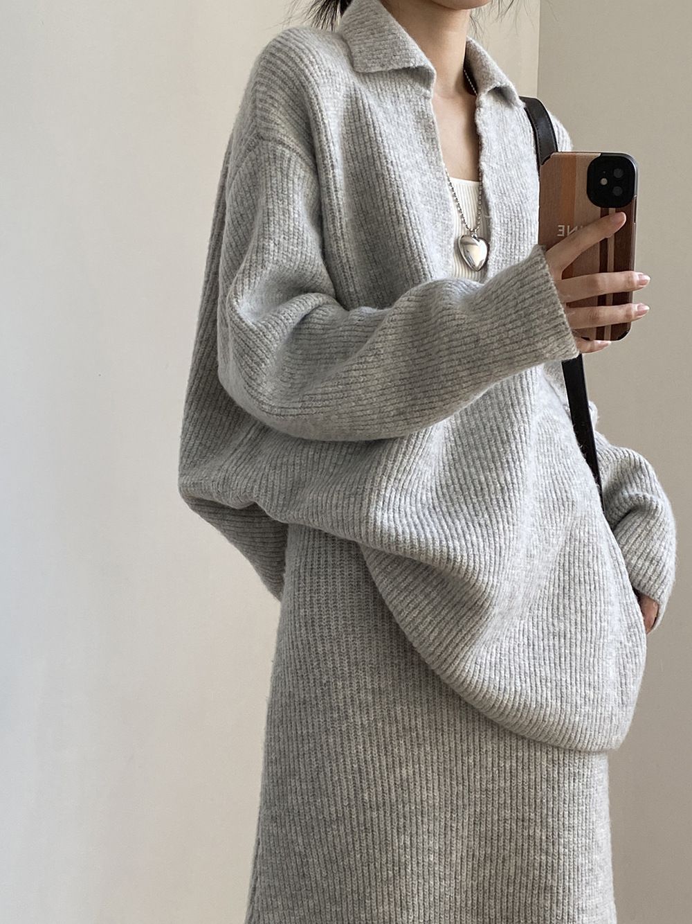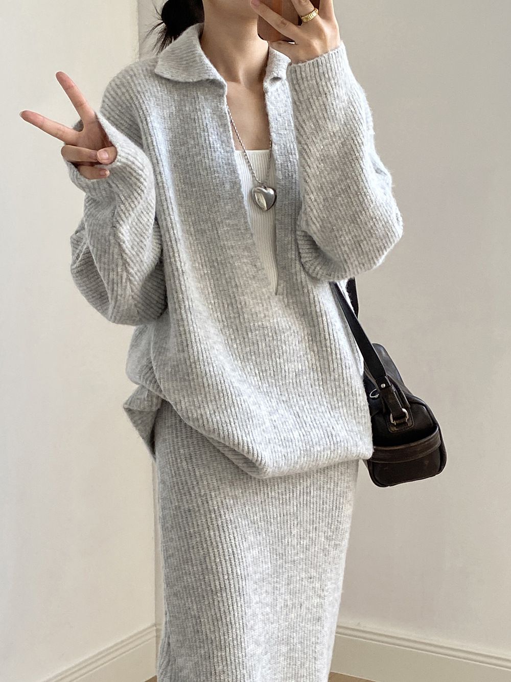 超值兩件組/保暖混羊毛/翻領.V領(無內搭)/坑條針織/落肩長袖/長版上衣/全腰鬆緊/無口袋/窄裙 - 休閒居家婚禮OL上班族簡約百搭素面兩件式套裝深V領針織套裝長袖上衣直筒裙長裙
