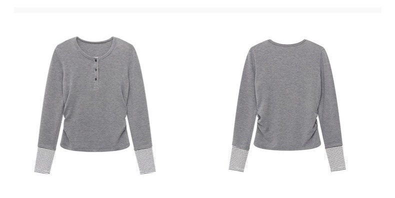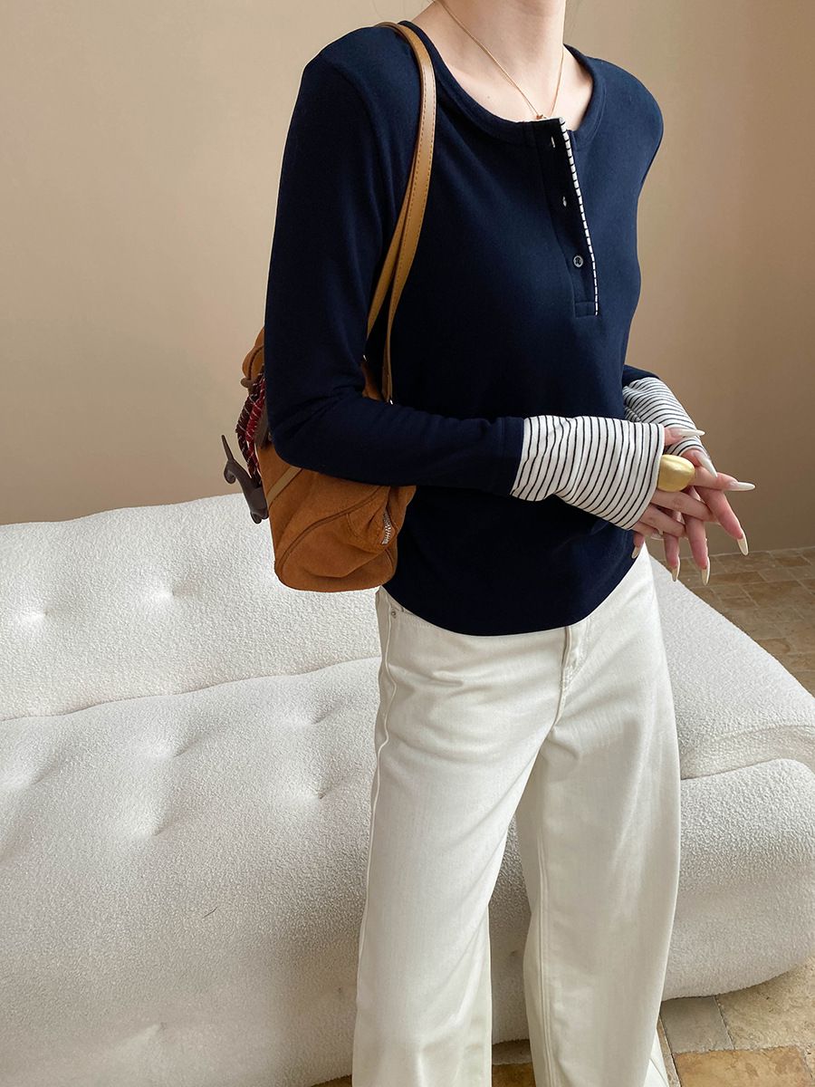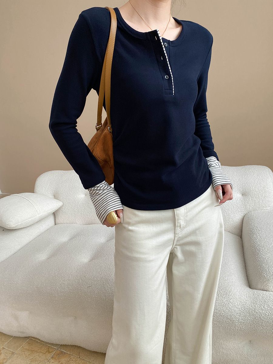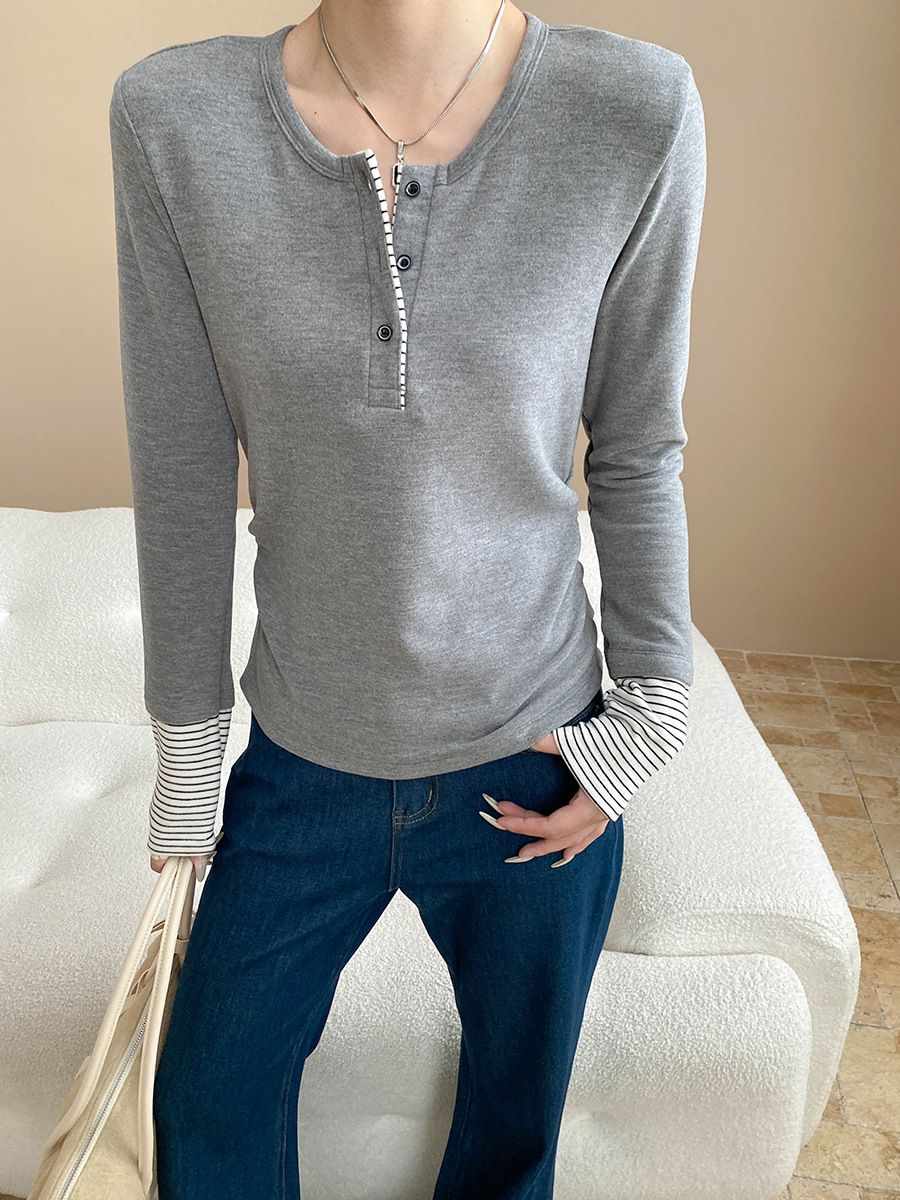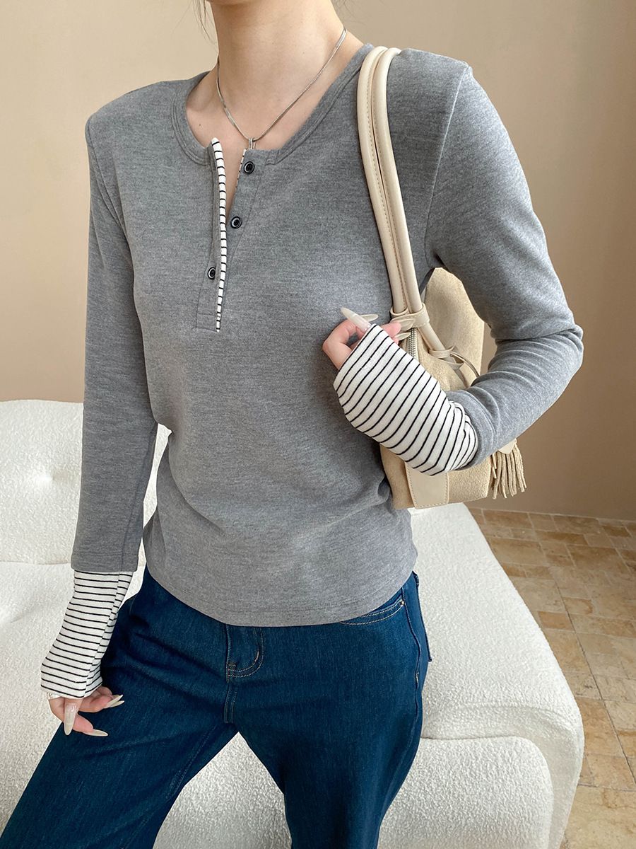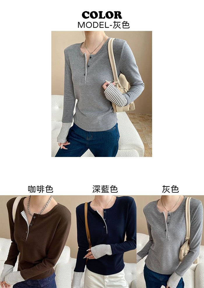 條紋拼接/假兩件拼接/半開襟排釦領/U領/貼身內搭上衣 - 休閒居家配色條紋上衣條紋T恤條紋拼接袖上衣長袖上衣T恤咖啡色深藍色灰色