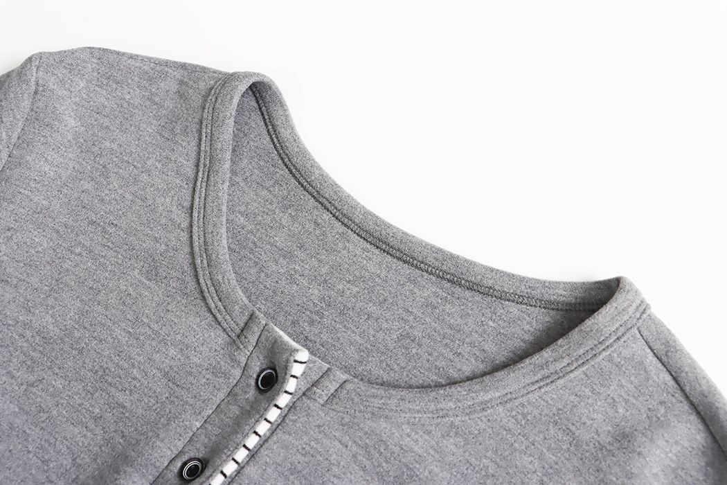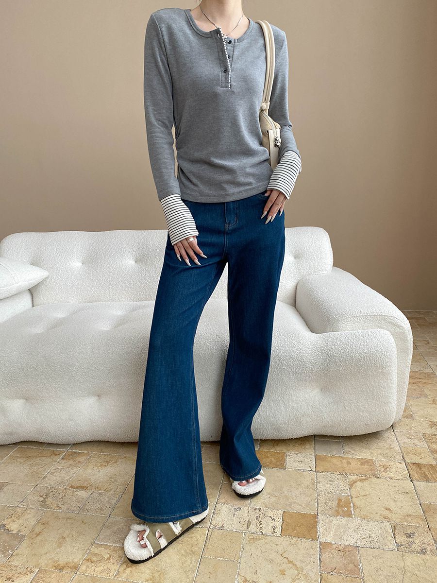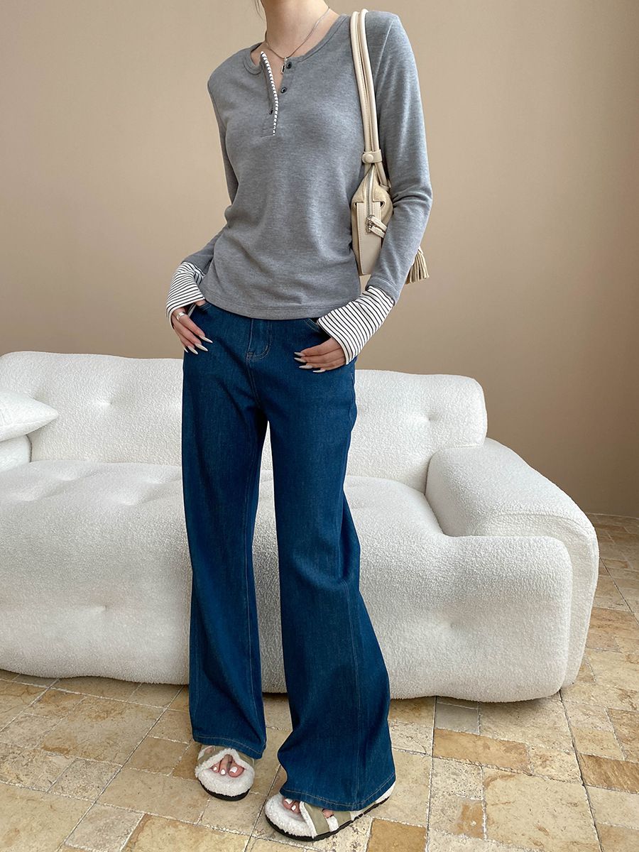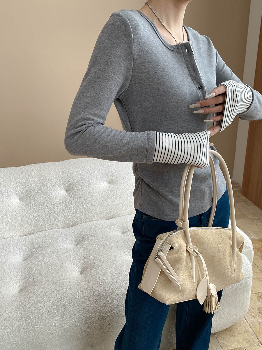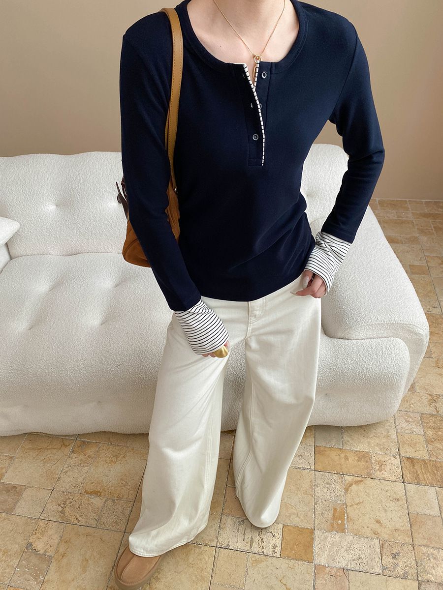 條紋拼接/假兩件拼接/半開襟排釦領/U領/貼身內搭上衣 - 休閒居家配色條紋上衣條紋T恤條紋拼接袖上衣長袖上衣T恤咖啡色深藍色灰色