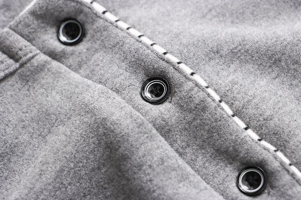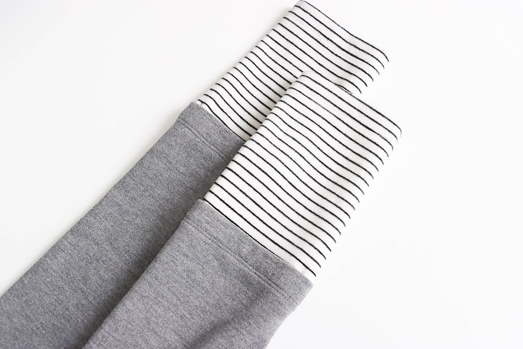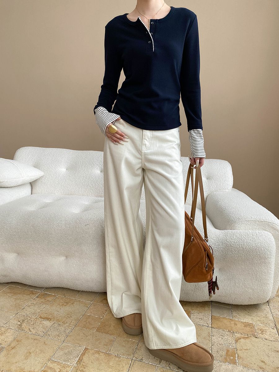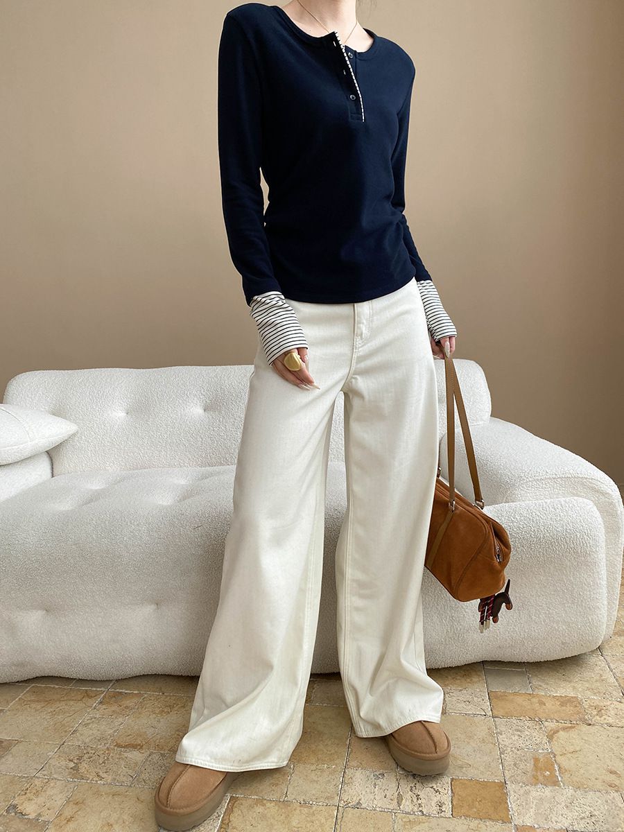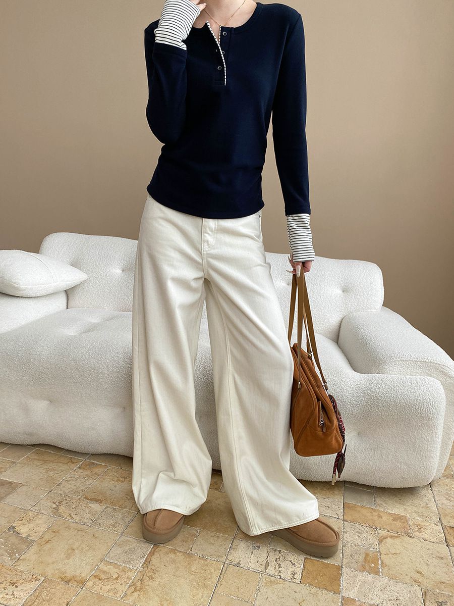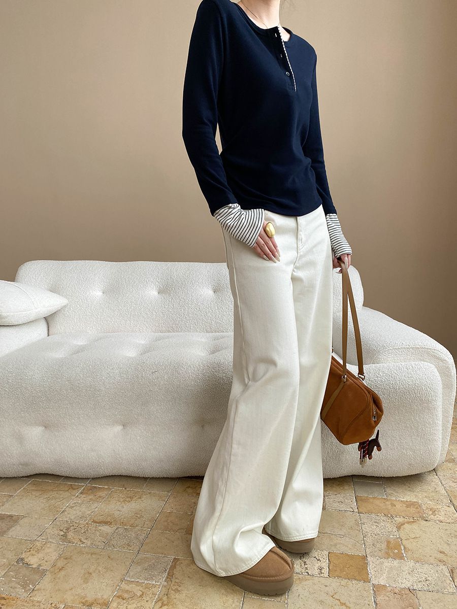 條紋拼接/假兩件拼接/半開襟排釦領/U領/貼身內搭上衣 - 休閒居家配色條紋上衣條紋T恤條紋拼接袖上衣長袖上衣T恤咖啡色深藍色灰色