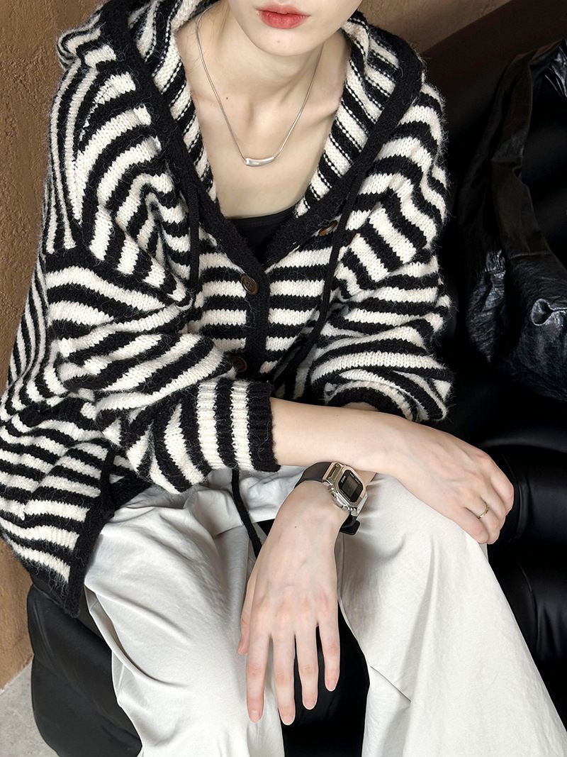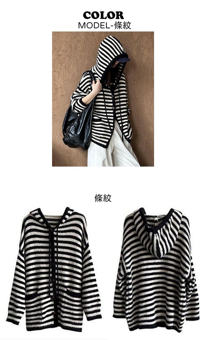 【C60032】品牌 條紋針織外套-抽繩連帽V領寬鬆長版排釦長袖★★