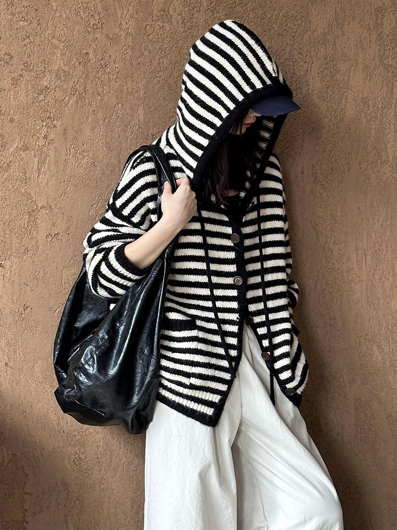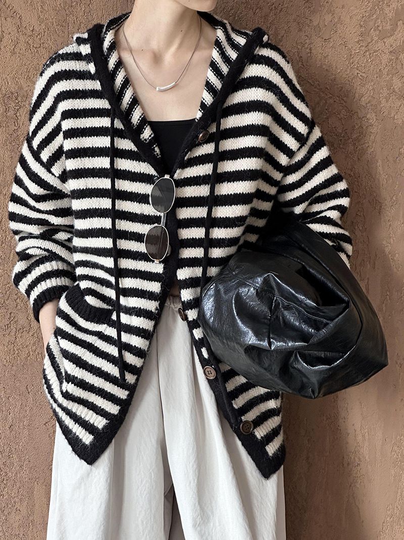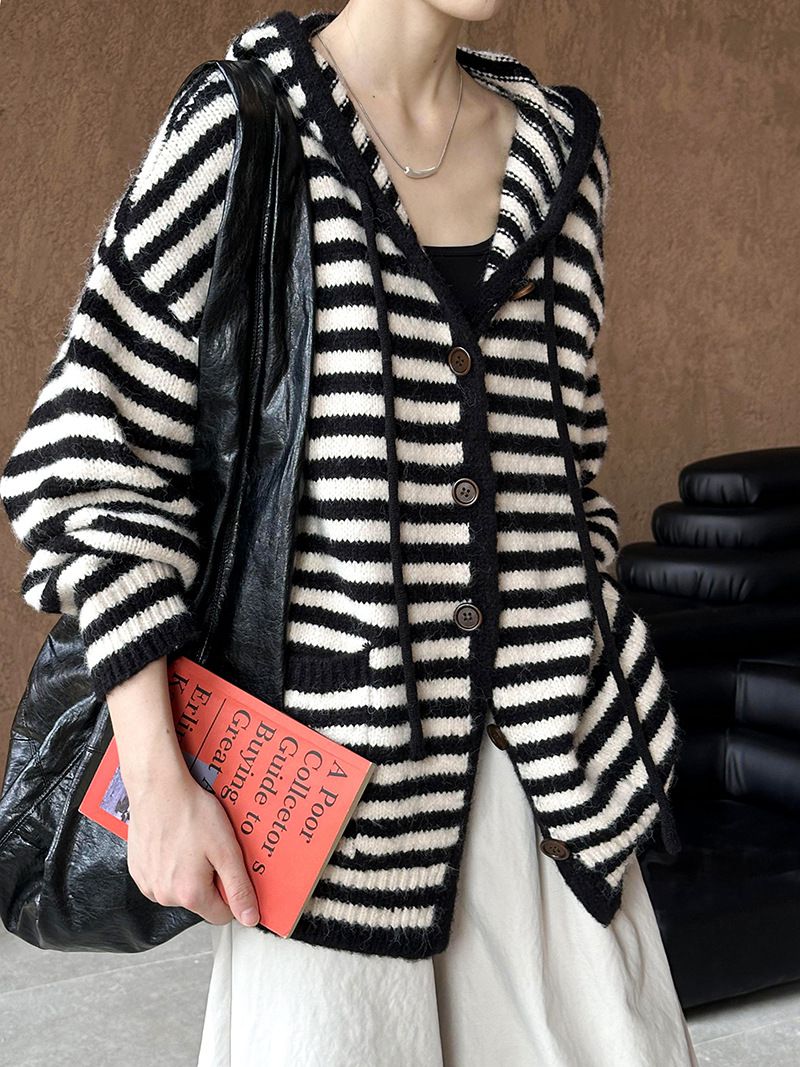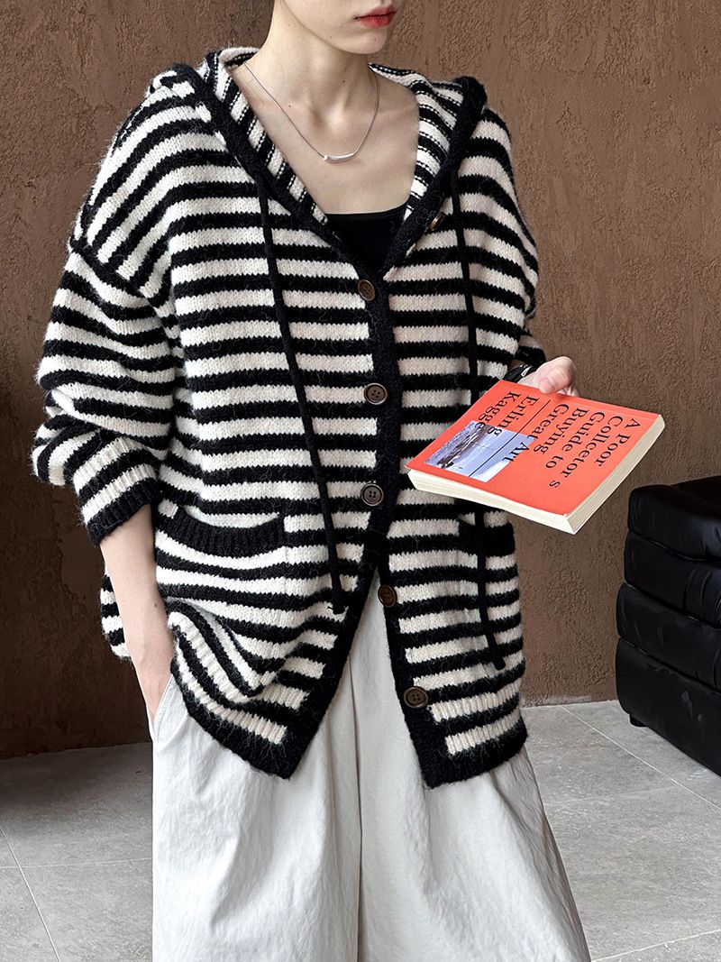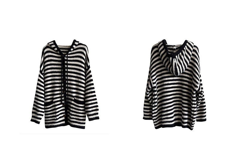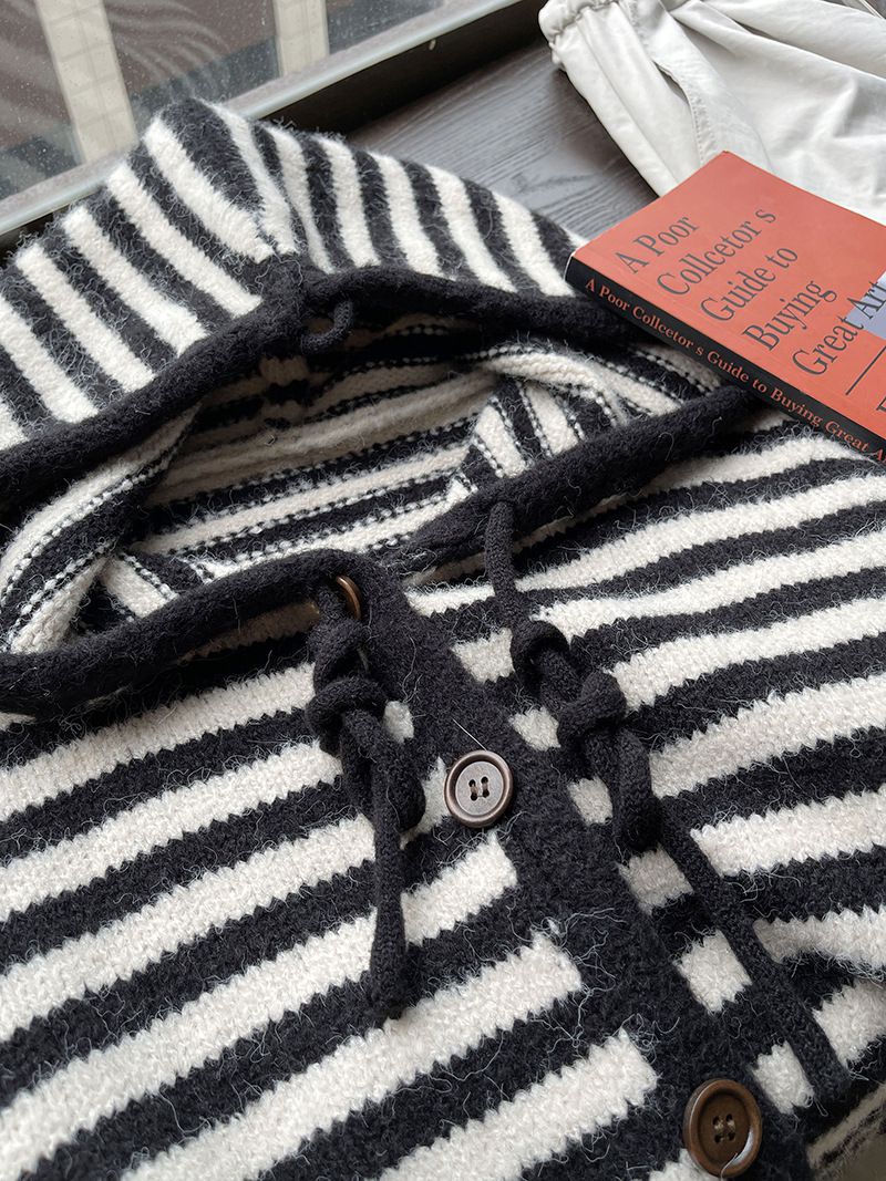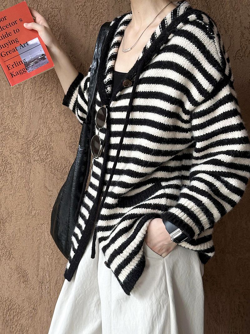 經典橫條紋/V領/開襟排釦/雙口袋/抽繩連帽/寬鬆長版 - 休閒居家渡假配色條紋外套條紋針織外套長袖外套長版外套連帽外套寬鬆大尺碼外套條紋色