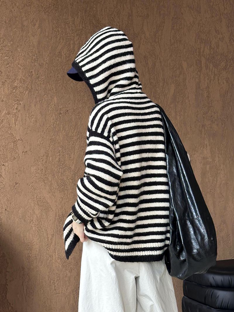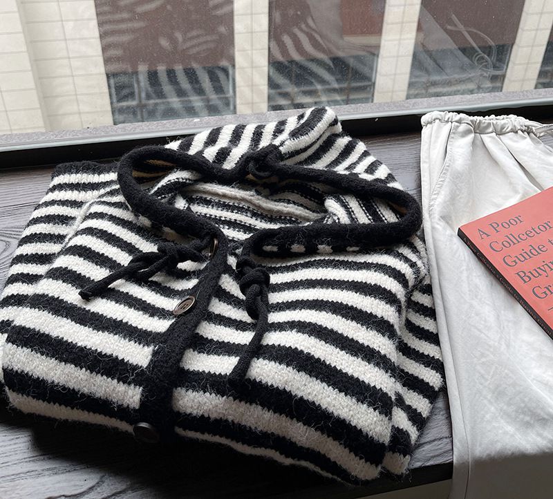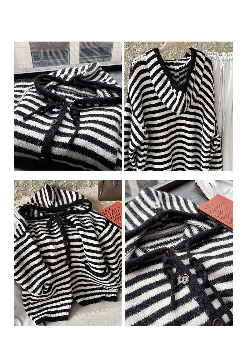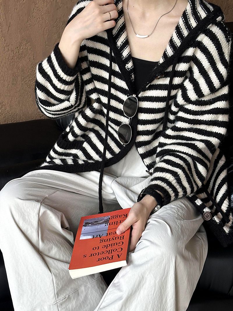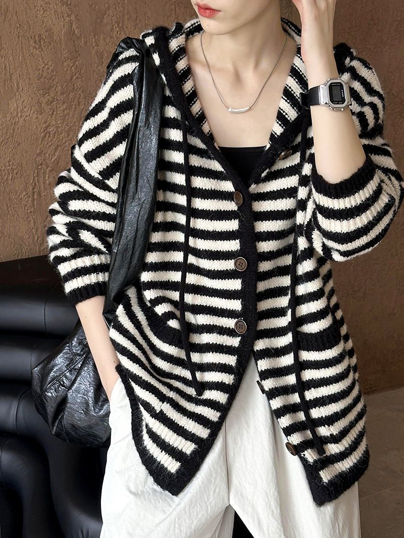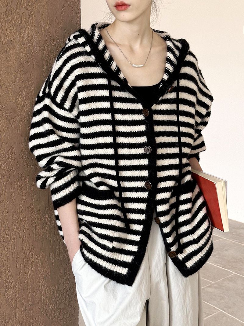 經典橫條紋/V領/開襟排釦/雙口袋/抽繩連帽/寬鬆長版 - 休閒居家渡假配色條紋外套條紋針織外套長袖外套長版外套連帽外套寬鬆大尺碼外套條紋色