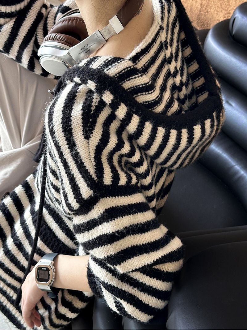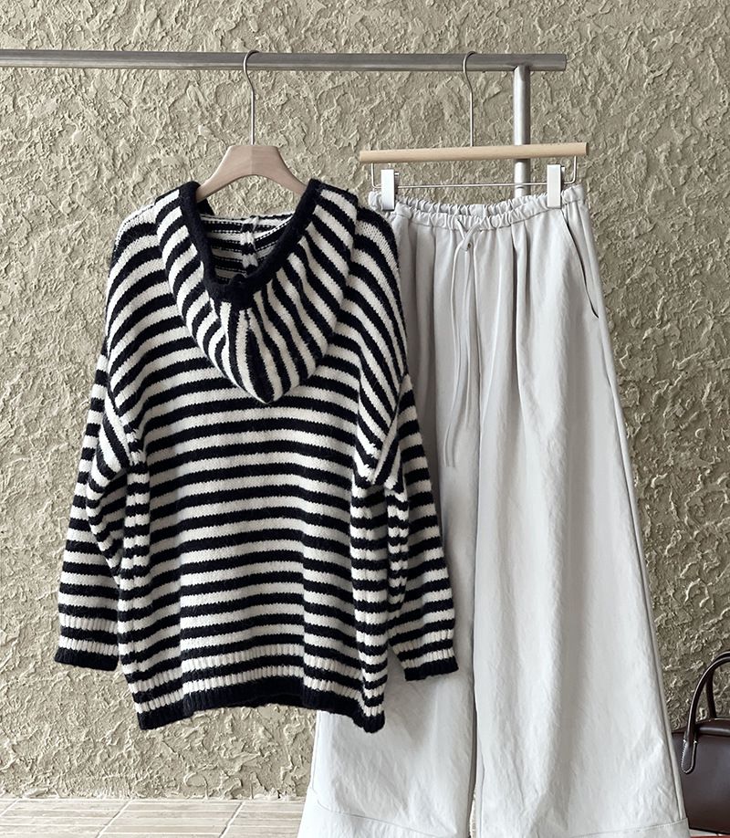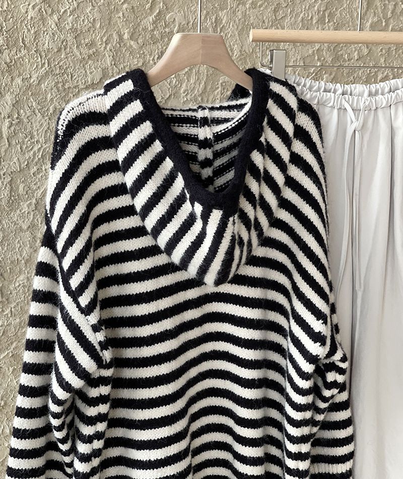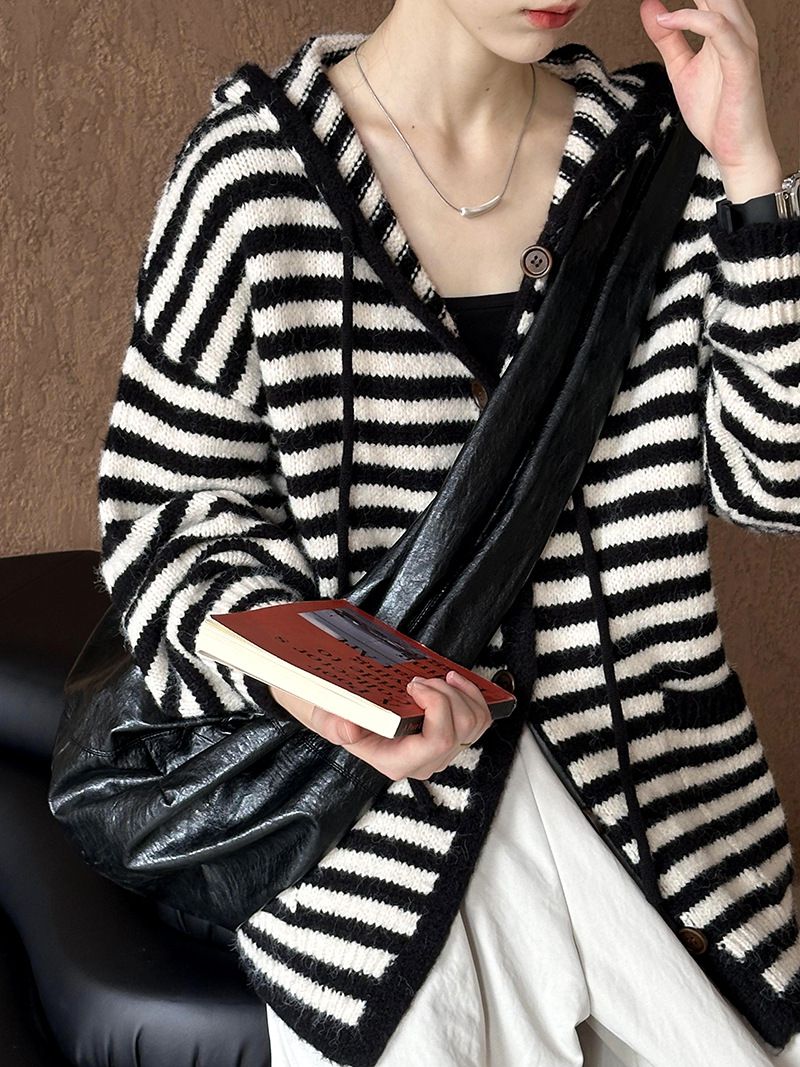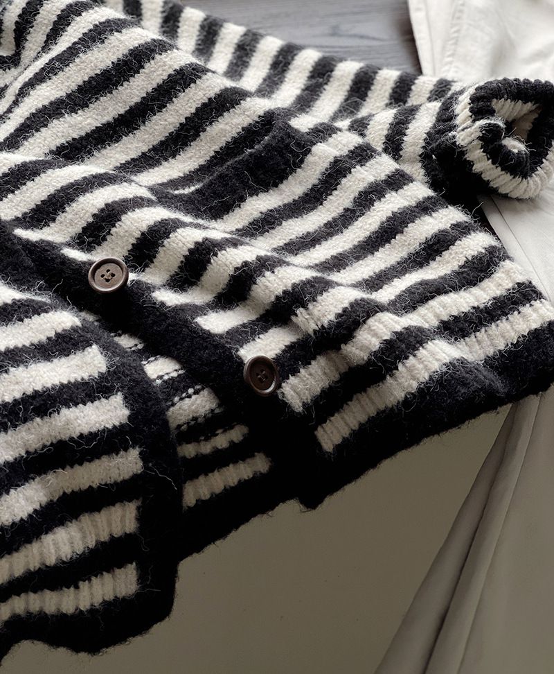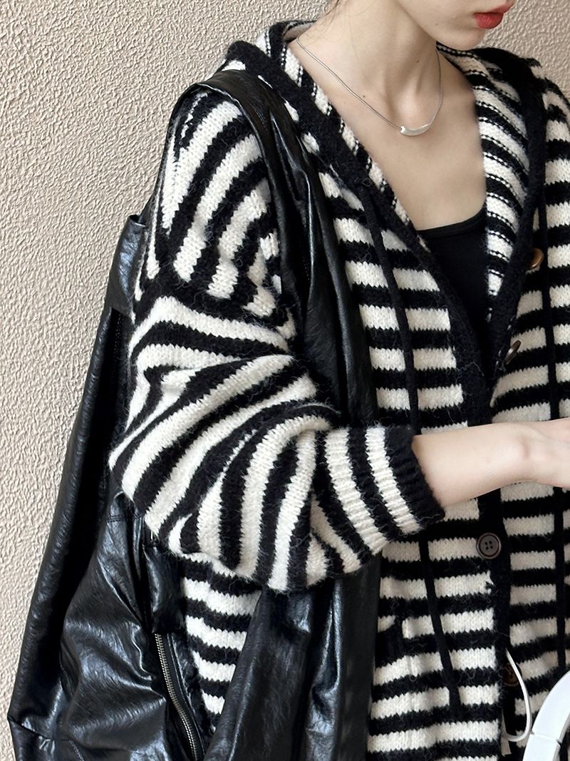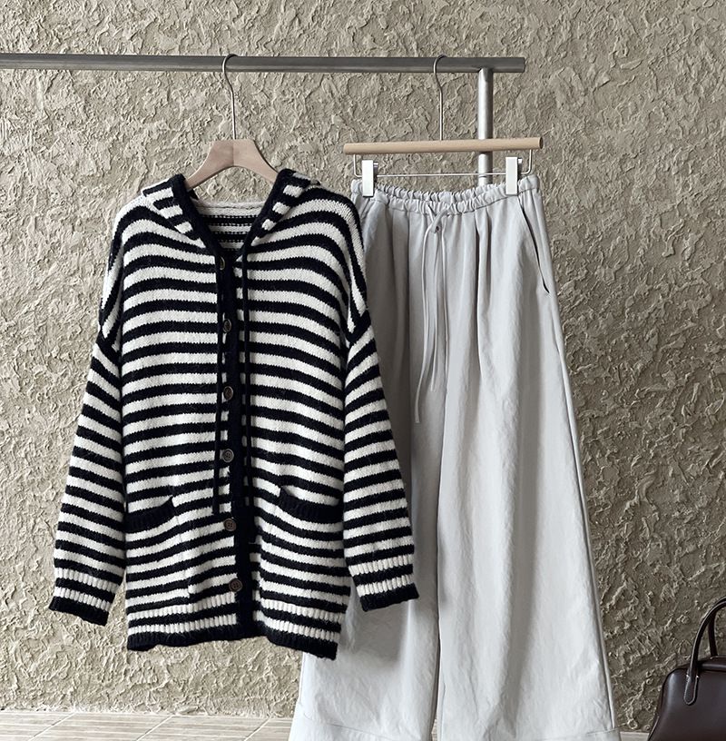 經典橫條紋/V領/開襟排釦/雙口袋/抽繩連帽/寬鬆長版 - 休閒居家渡假配色條紋外套條紋針織外套長袖外套長版外套連帽外套寬鬆大尺碼外套條紋色
