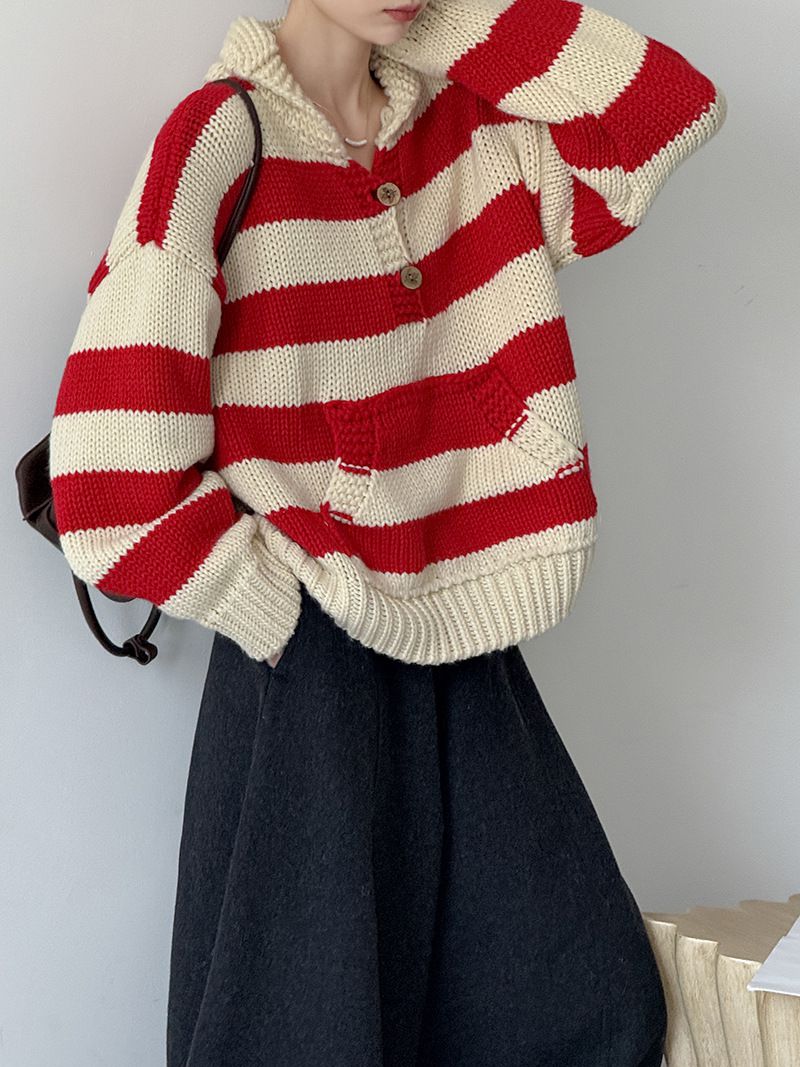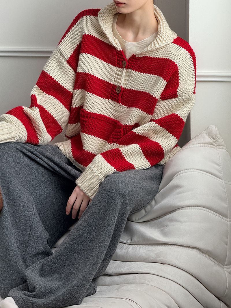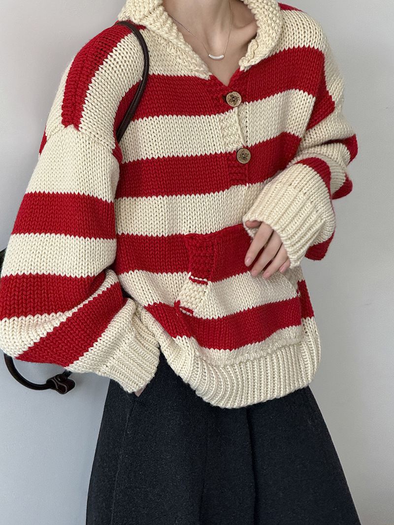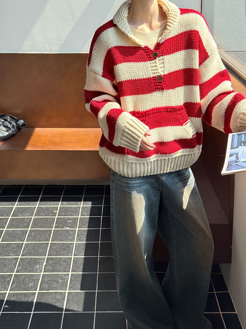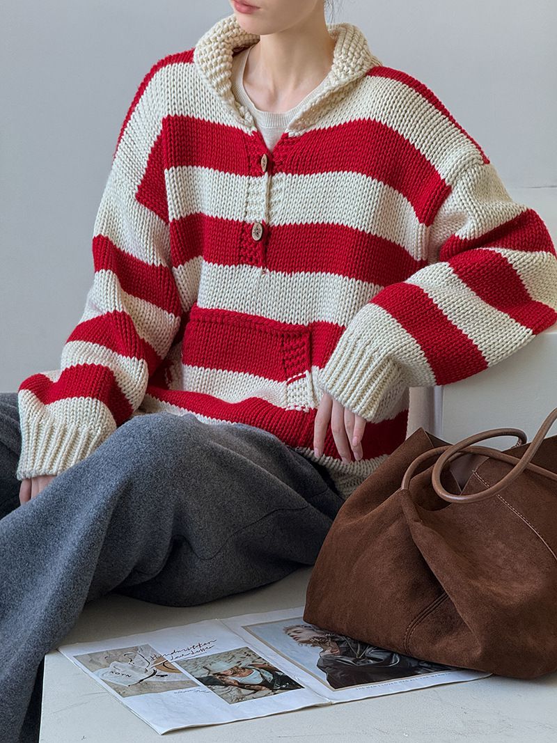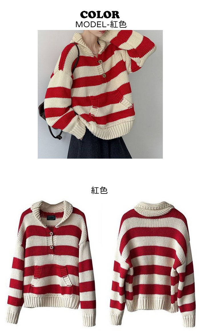 經典寬版條紋/好氣色/半開襟排釦領/木釦/翻領/大口袋/落肩長袖/寬鬆 - 休閒居家渡假配色條紋上衣條紋針織衫大口袋針織衫針織上衣寬鬆大尺碼上衣長袖上衣紅色