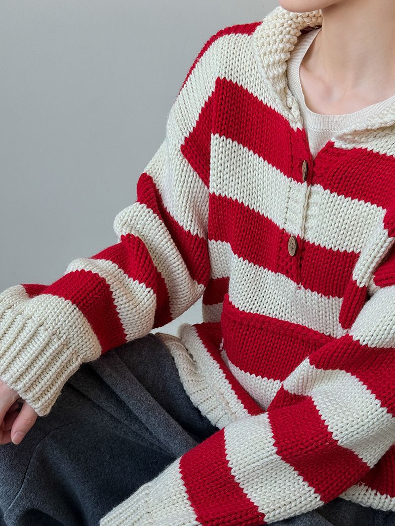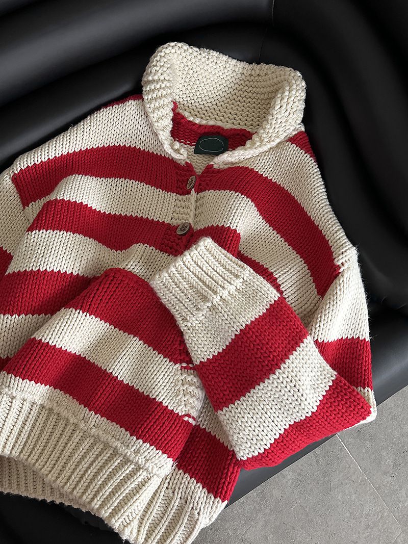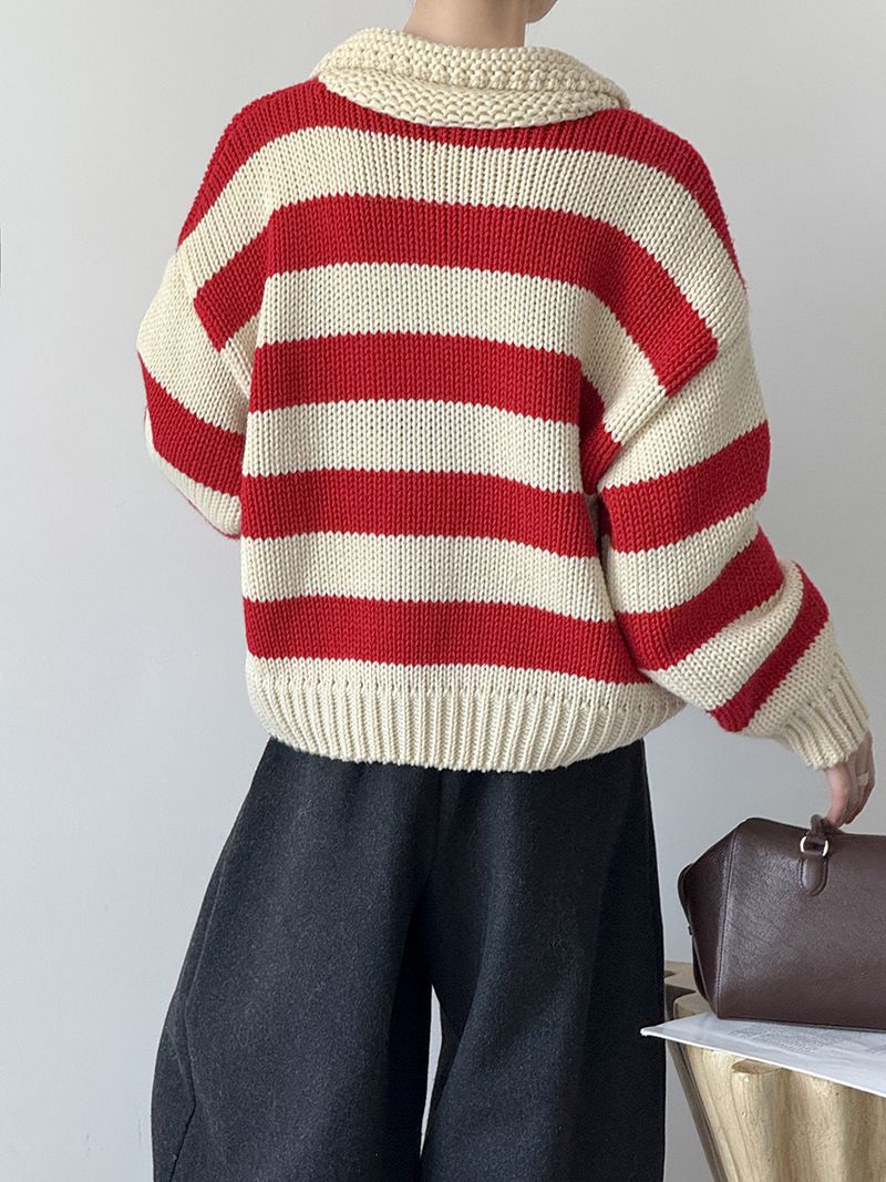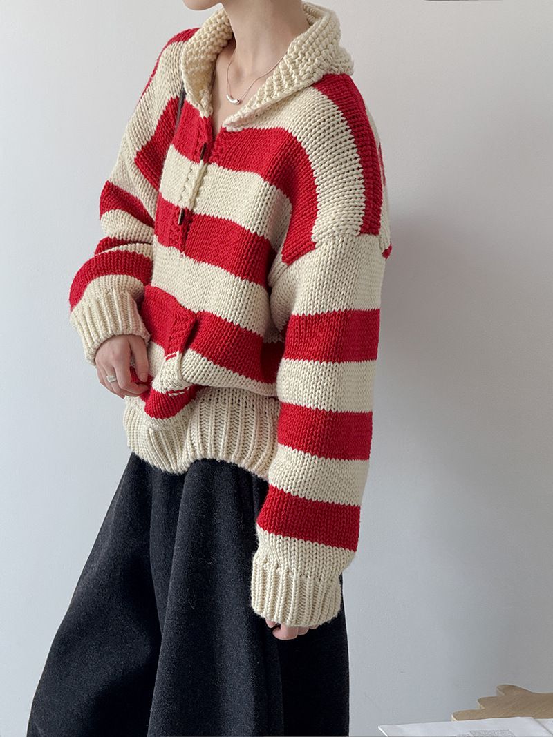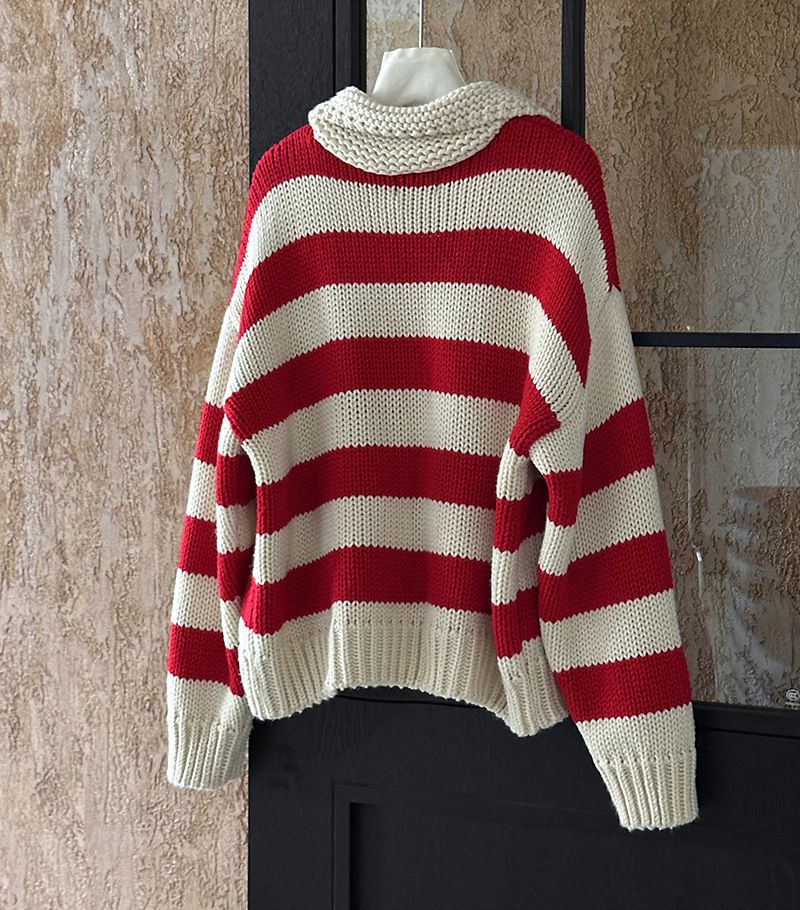 經典寬版條紋/好氣色/半開襟排釦領/木釦/翻領/大口袋/落肩長袖/寬鬆 - 休閒居家渡假配色條紋上衣條紋針織衫大口袋針織衫針織上衣寬鬆大尺碼上衣長袖上衣紅色