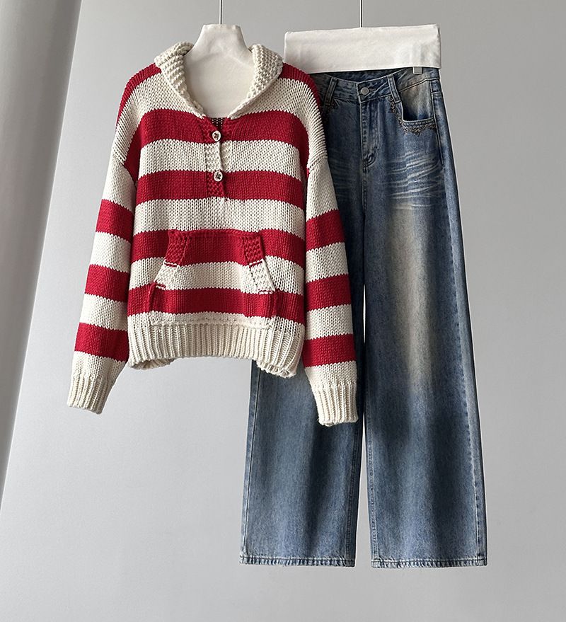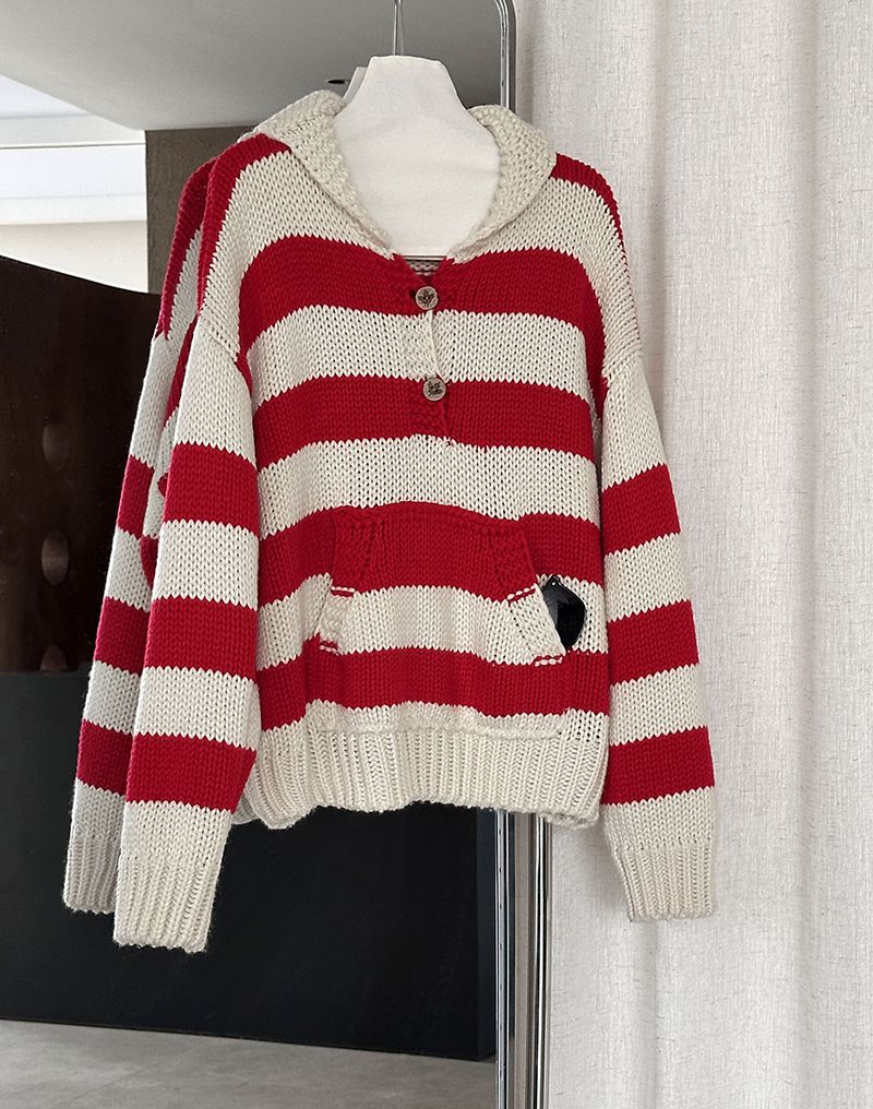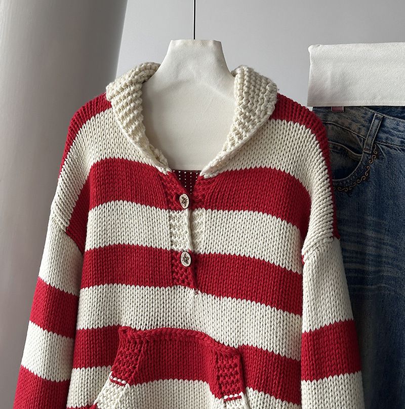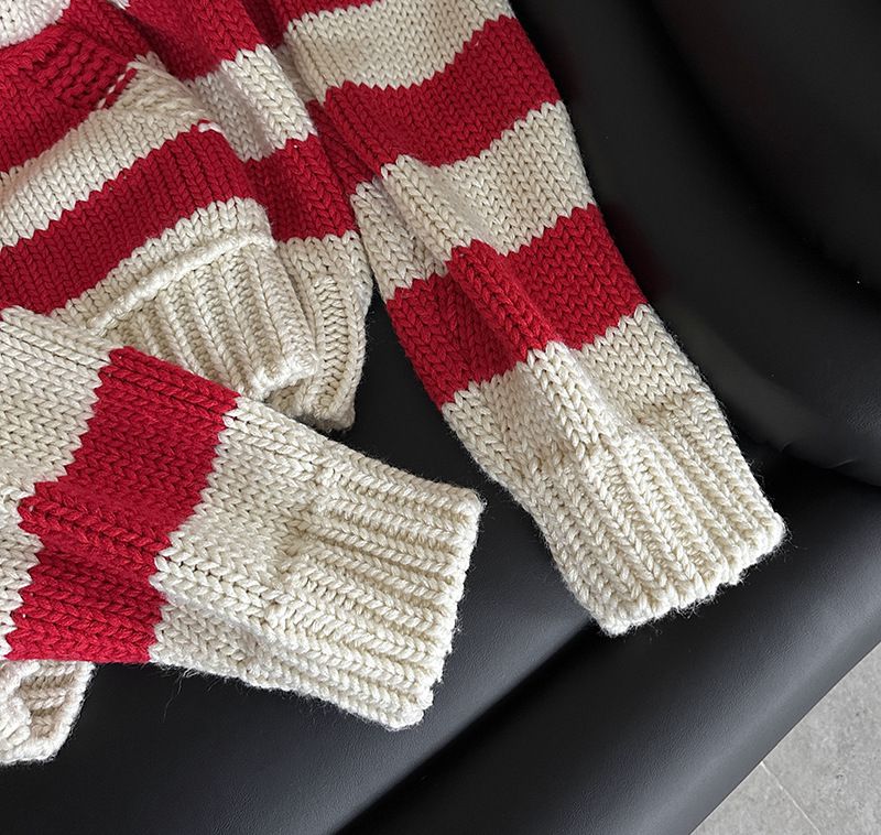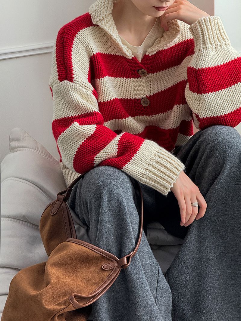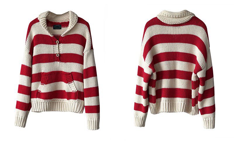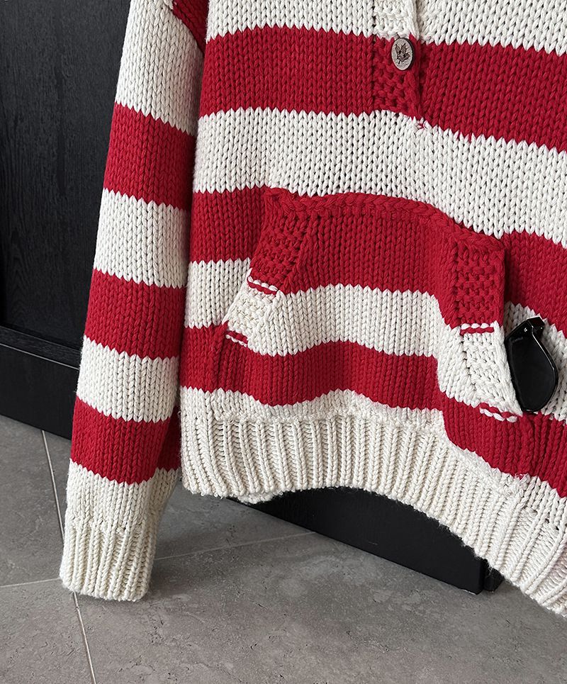 經典寬版條紋/好氣色/半開襟排釦領/木釦/翻領/大口袋/落肩長袖/寬鬆 - 休閒居家渡假配色條紋上衣條紋針織衫大口袋針織衫針織上衣寬鬆大尺碼上衣長袖上衣紅色