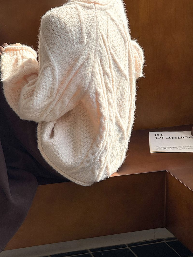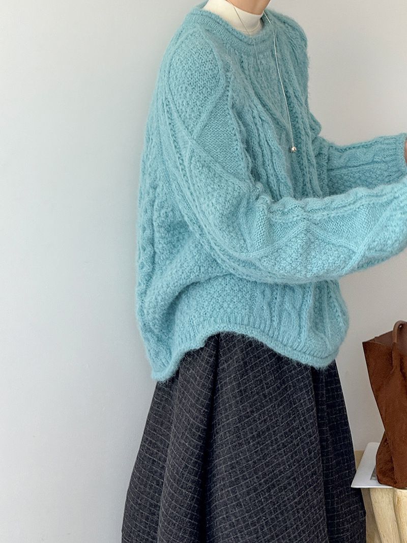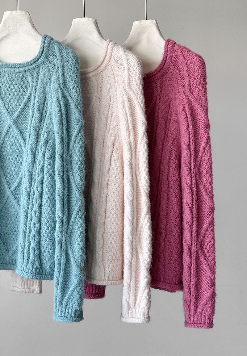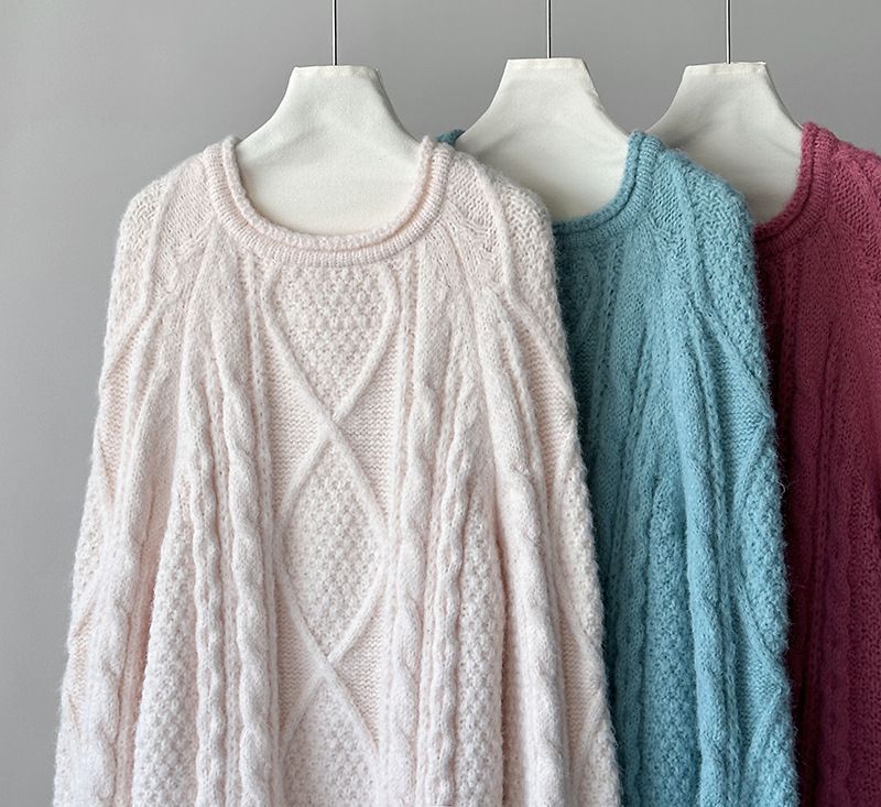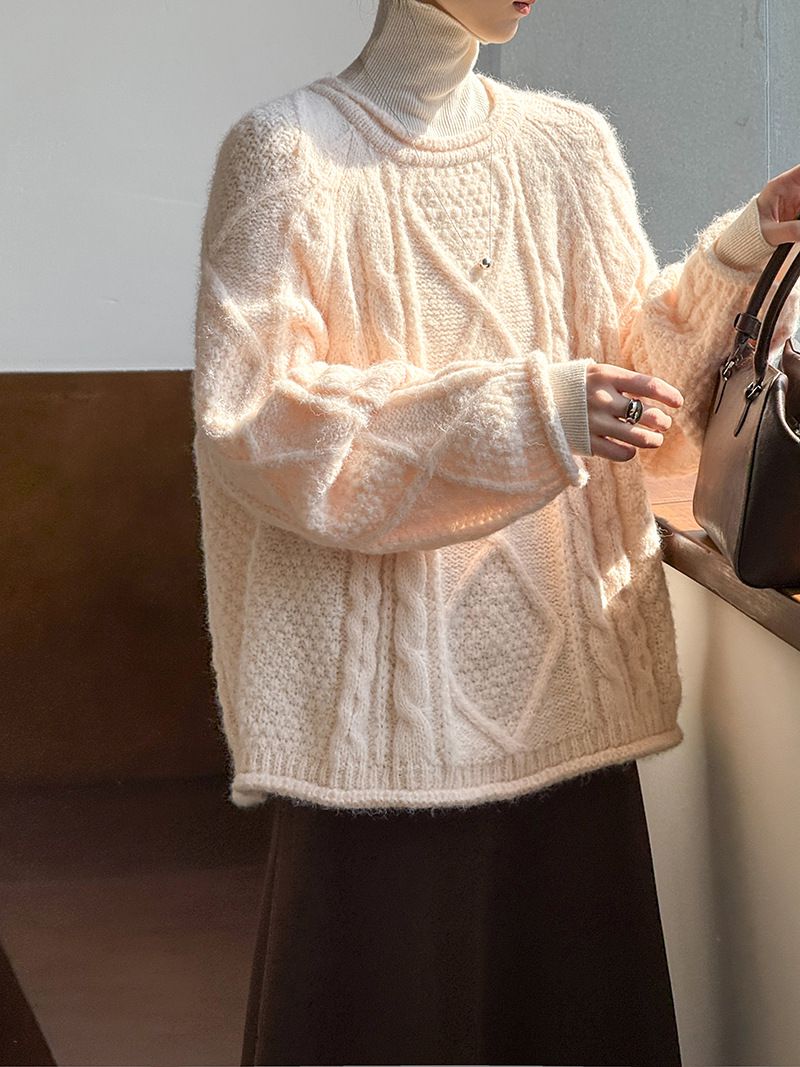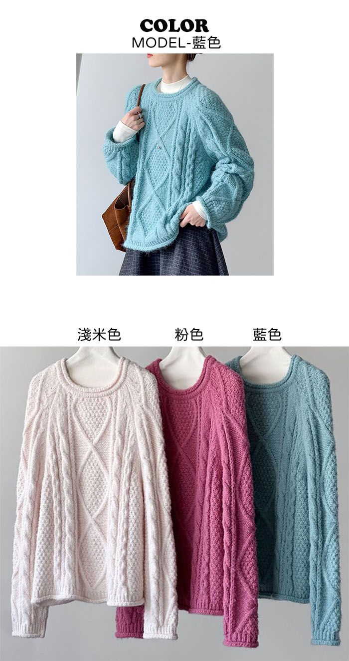 立體麻花編織紋/捲邊圓領/落肩寬袖/好氣色/寬鬆/保暖混羊毛 - 休閒居家簡約百搭素面寬鬆大尺碼上衣麻花針織衫針織上衣長袖上衣淺米色藍色粉色
