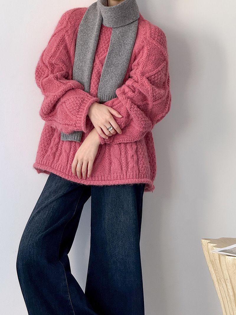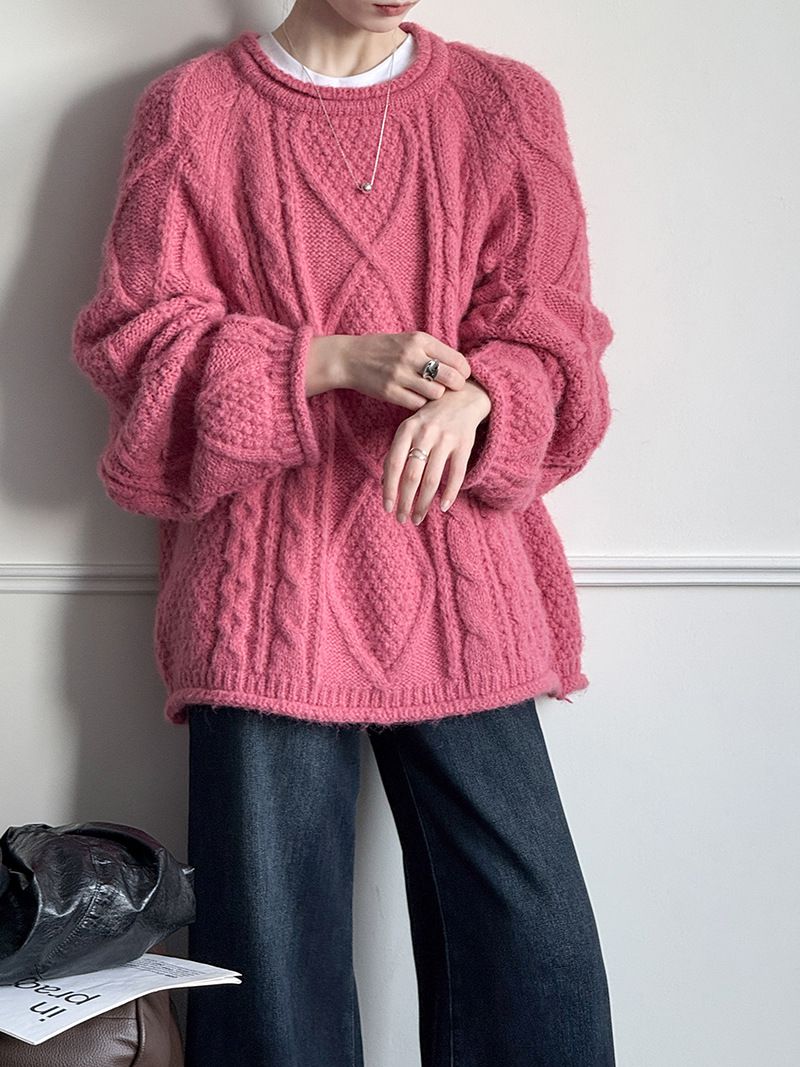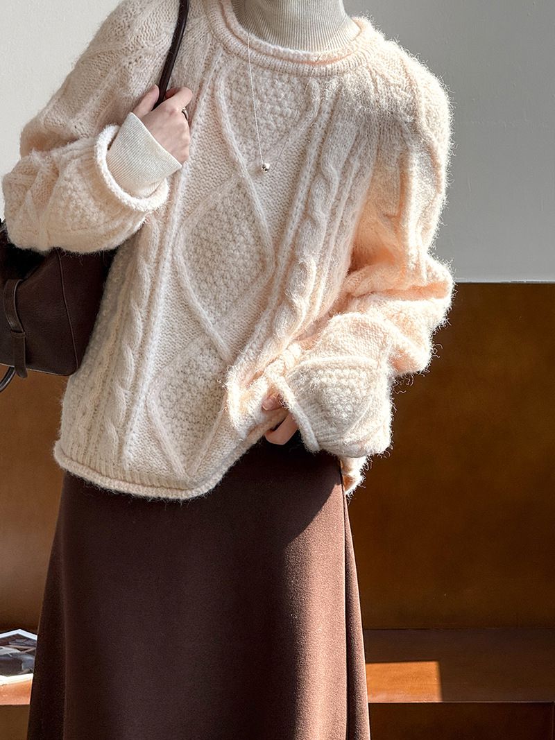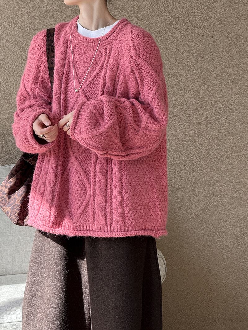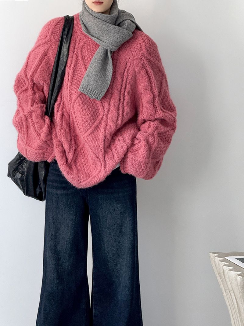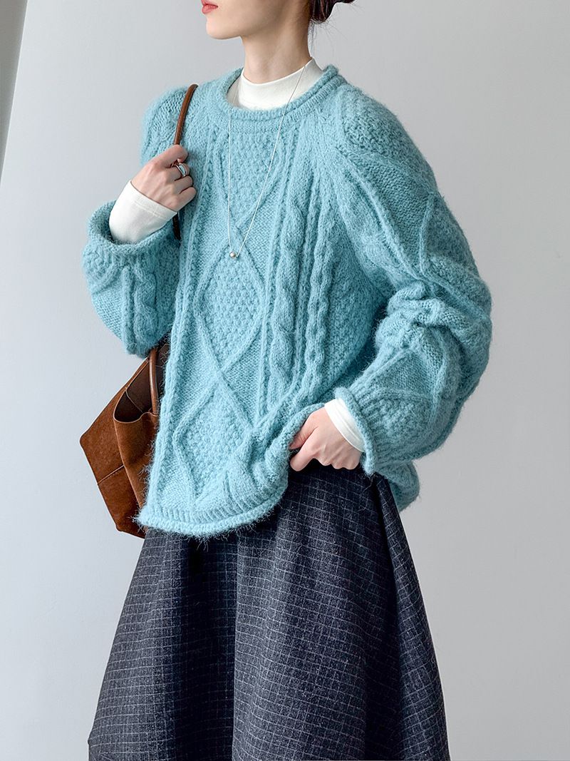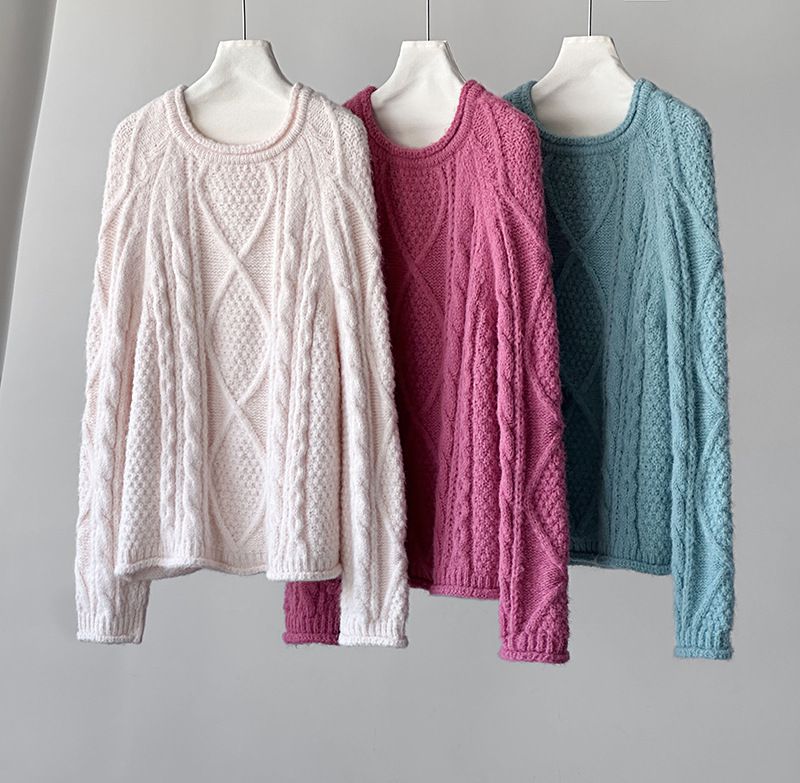 立體麻花編織紋/捲邊圓領/落肩寬袖/好氣色/寬鬆/保暖混羊毛 - 休閒居家簡約百搭素面寬鬆大尺碼上衣麻花針織衫針織上衣長袖上衣淺米色藍色粉色