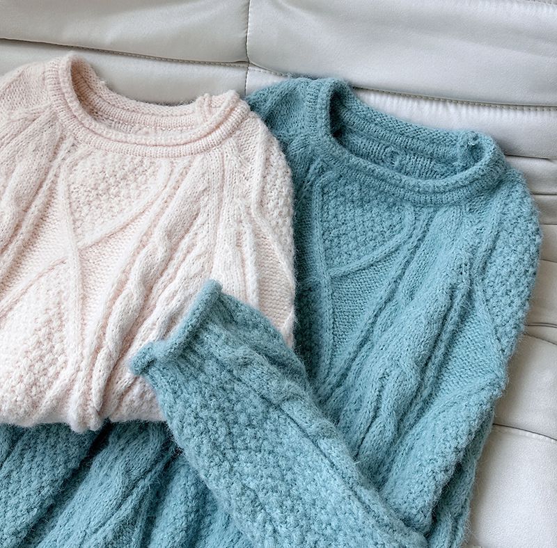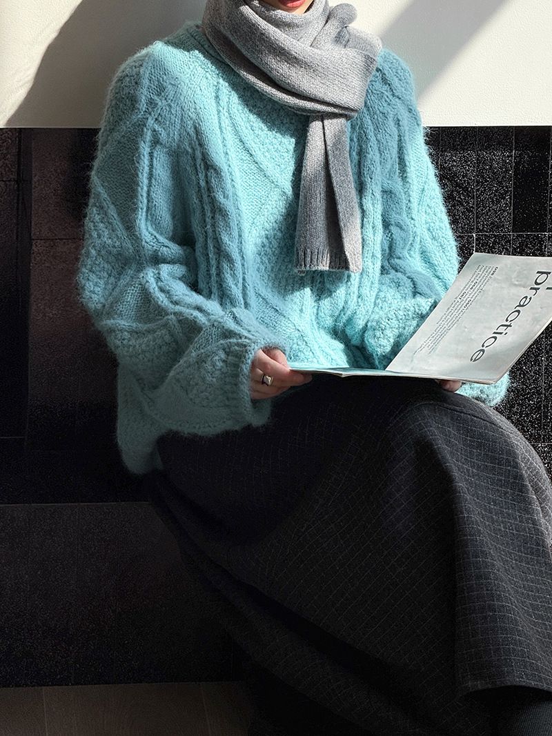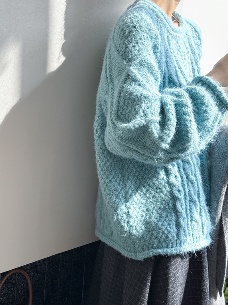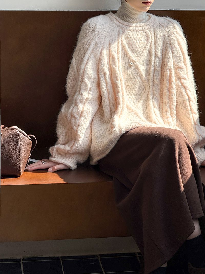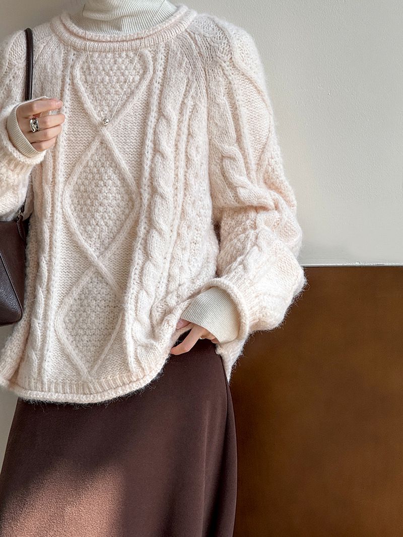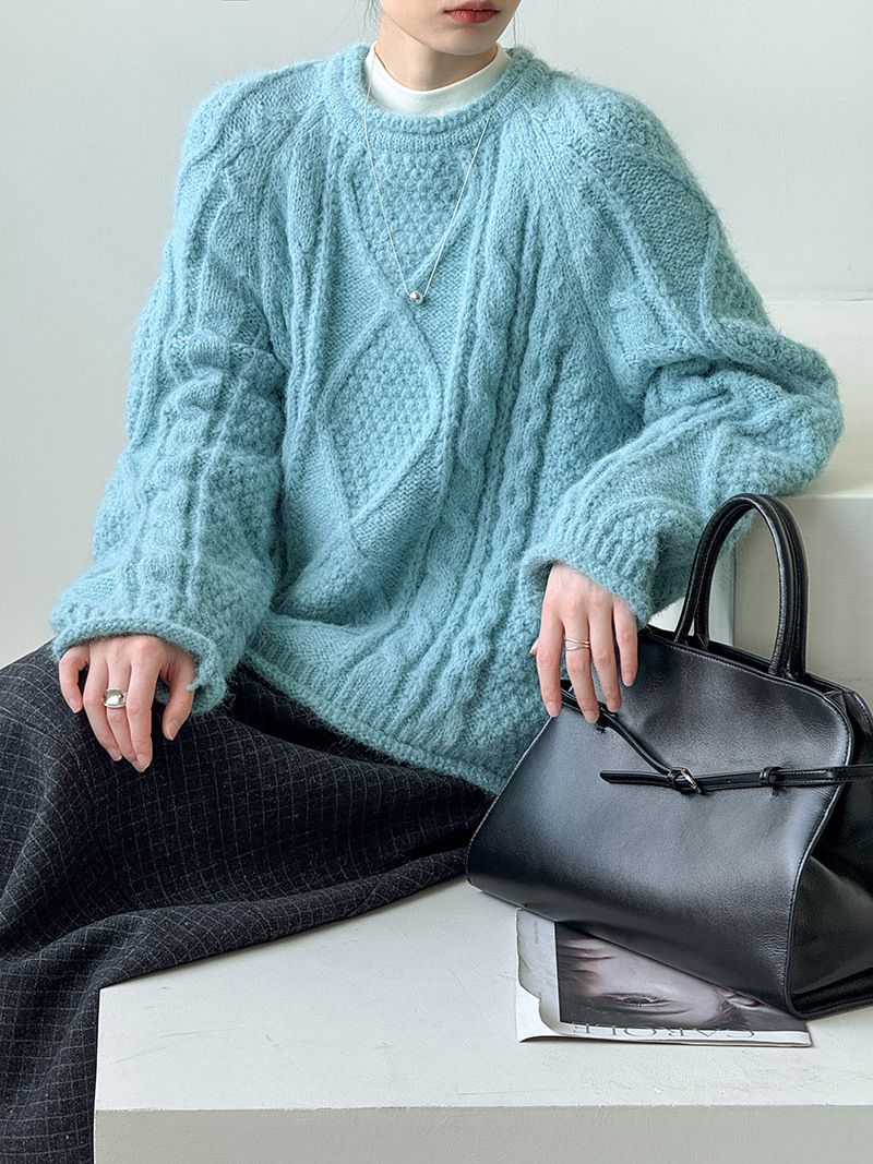 立體麻花編織紋/捲邊圓領/落肩寬袖/好氣色/寬鬆/保暖混羊毛 - 休閒居家簡約百搭素面寬鬆大尺碼上衣麻花針織衫針織上衣長袖上衣淺米色藍色粉色