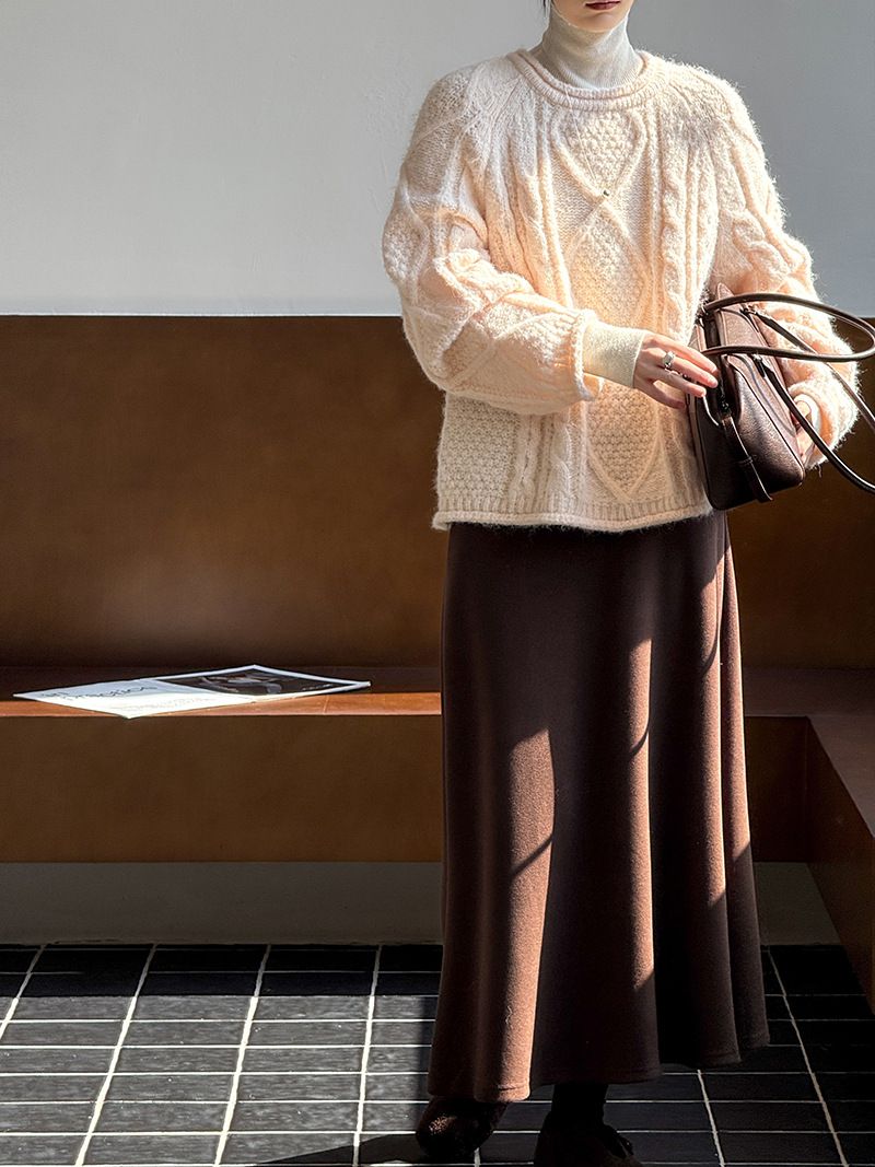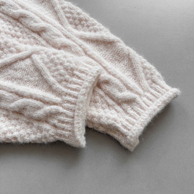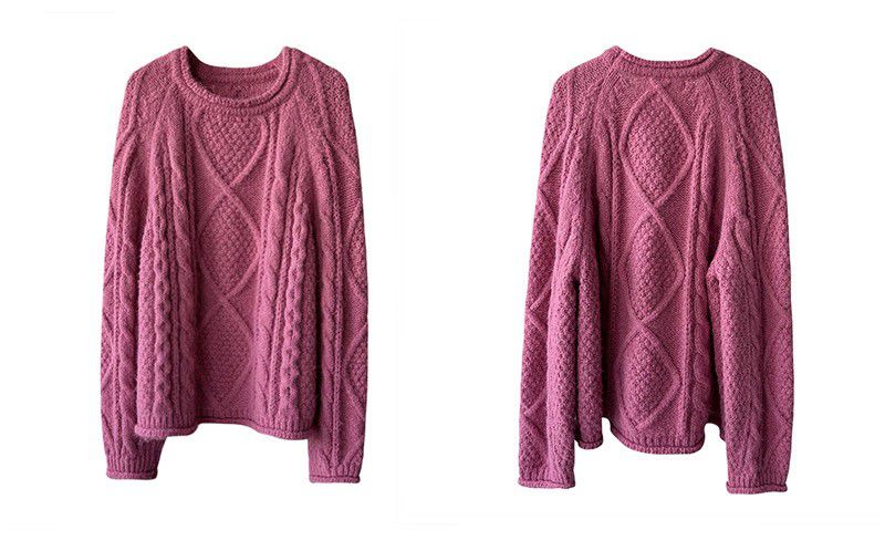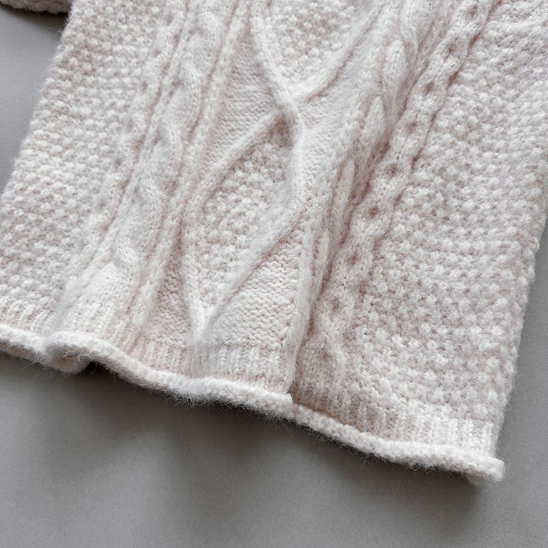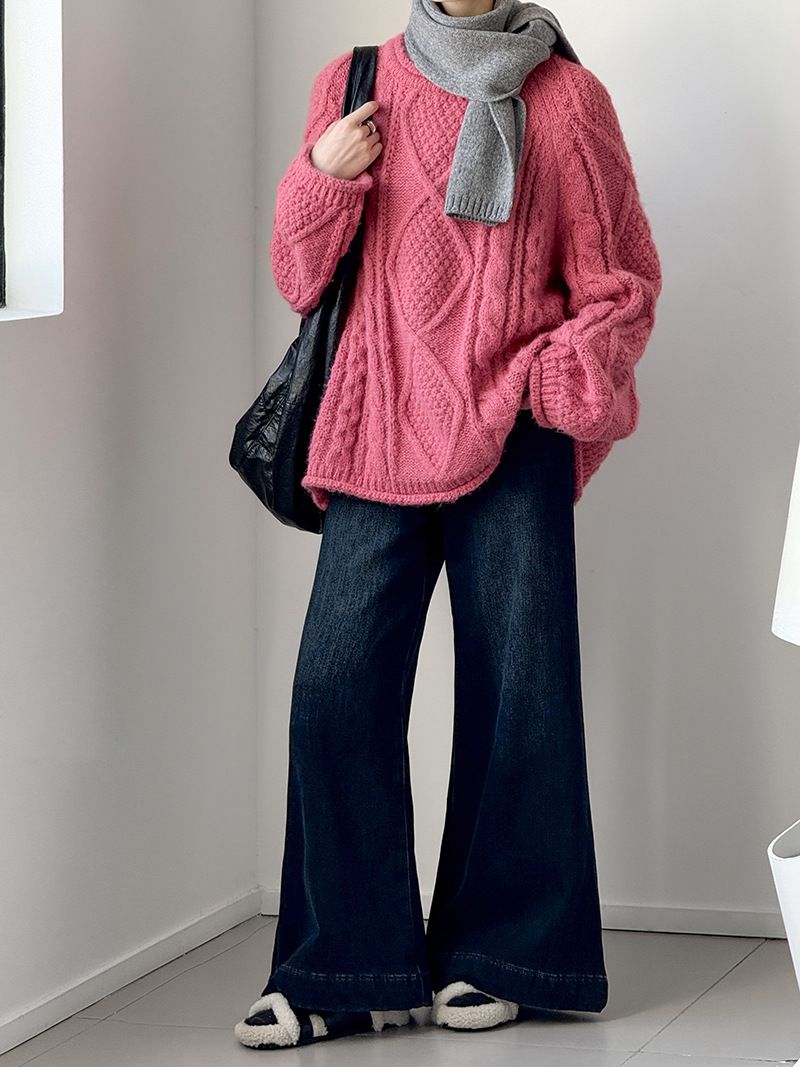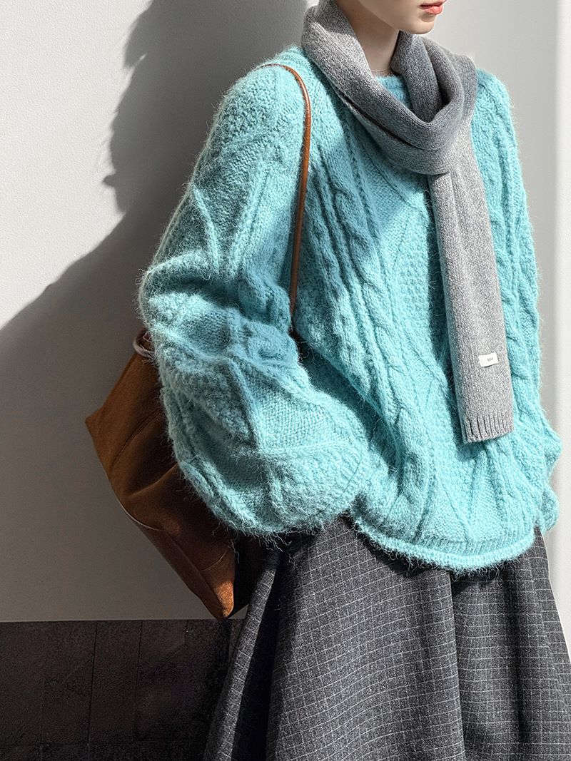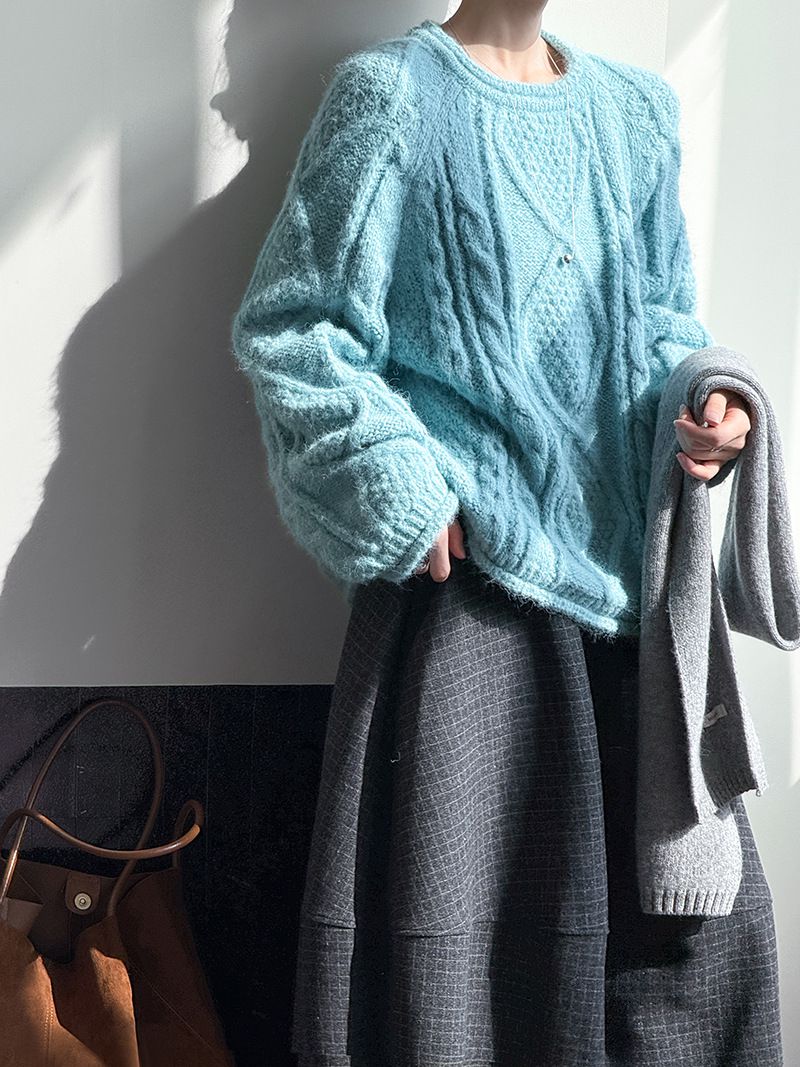 立體麻花編織紋/捲邊圓領/落肩寬袖/好氣色/寬鬆/保暖混羊毛 - 休閒居家簡約百搭素面寬鬆大尺碼上衣麻花針織衫針織上衣長袖上衣淺米色藍色粉色
