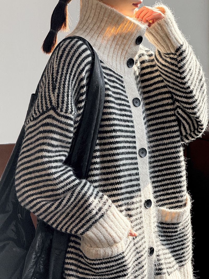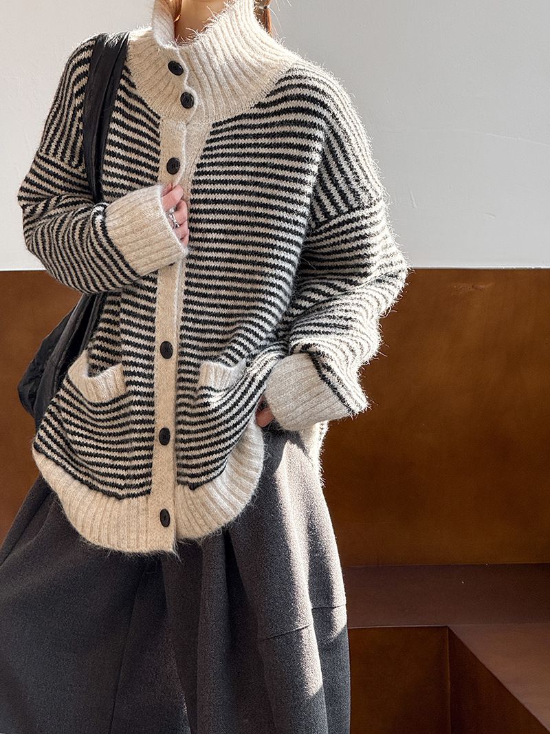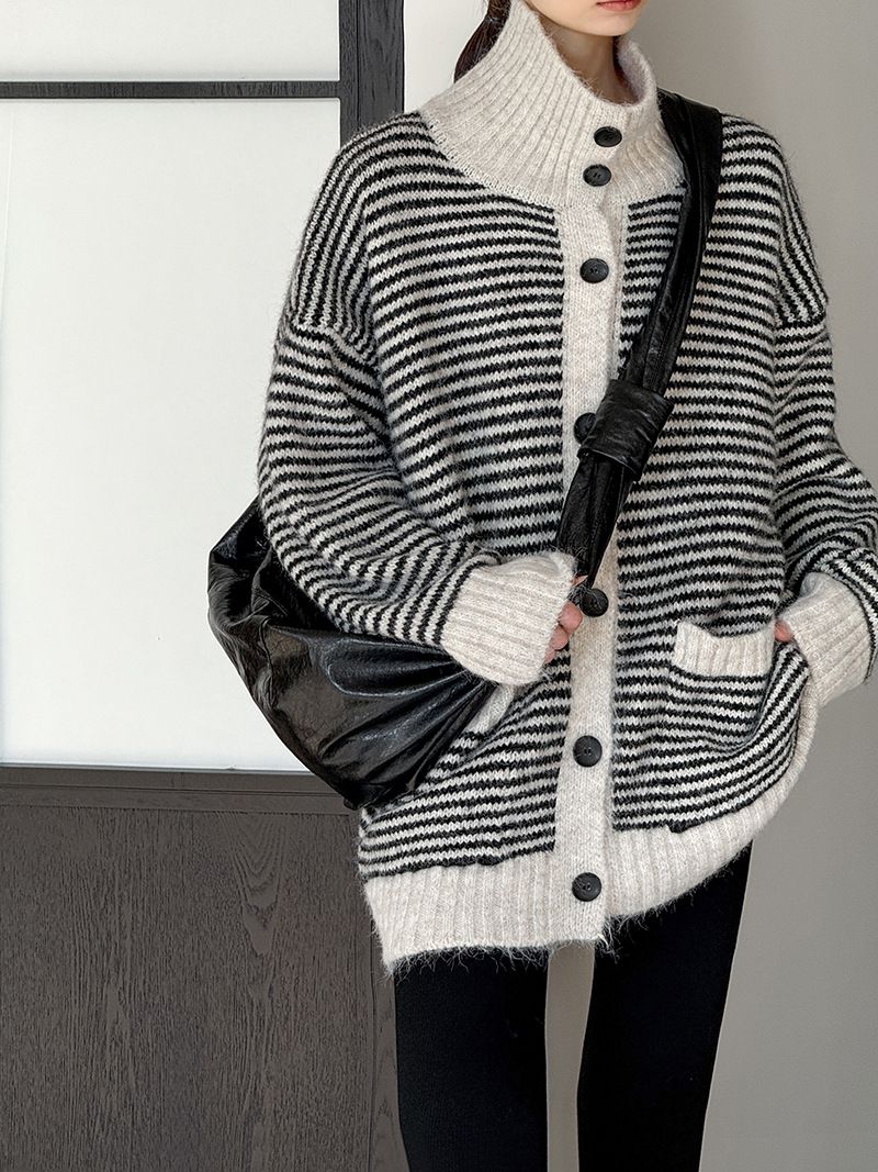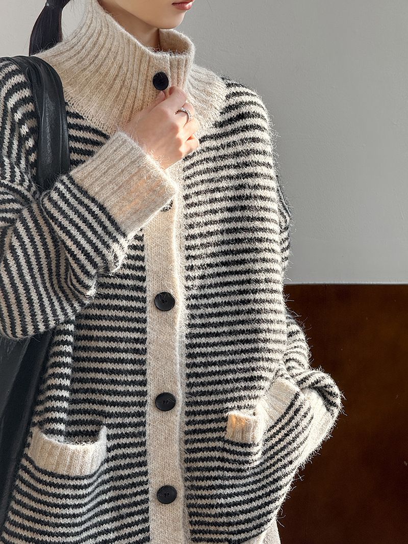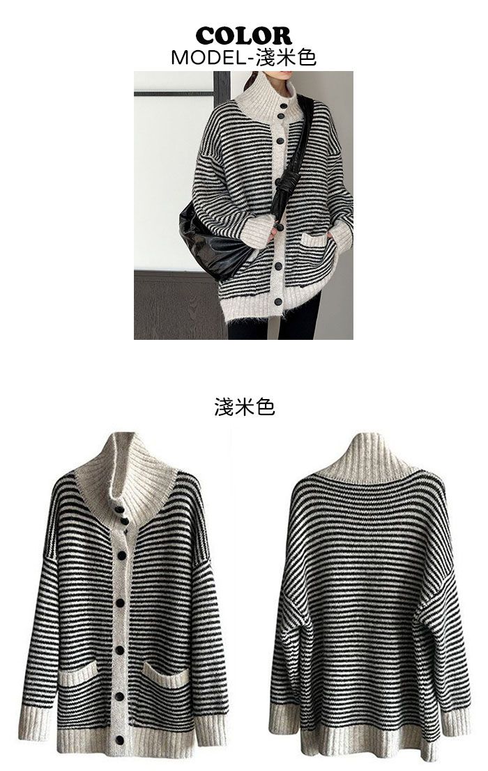 保暖混羊毛/經典條紋色/開襟排釦/立領.高領.翻領/寬鬆長版/連肩袖/雙口袋 - 休閒居家渡假配色條紋上衣混羊毛條紋外套針織衫針織外套長袖上衣針織上衣寬鬆大尺碼外套長版外套淺米色