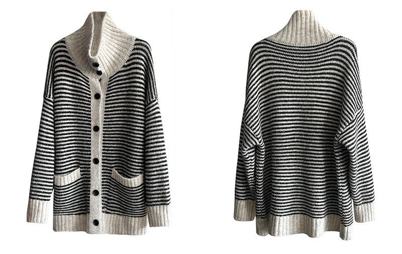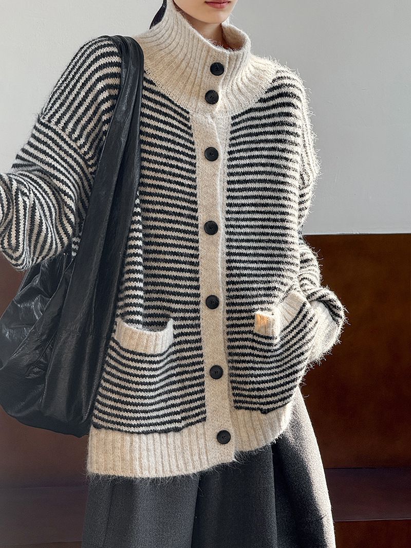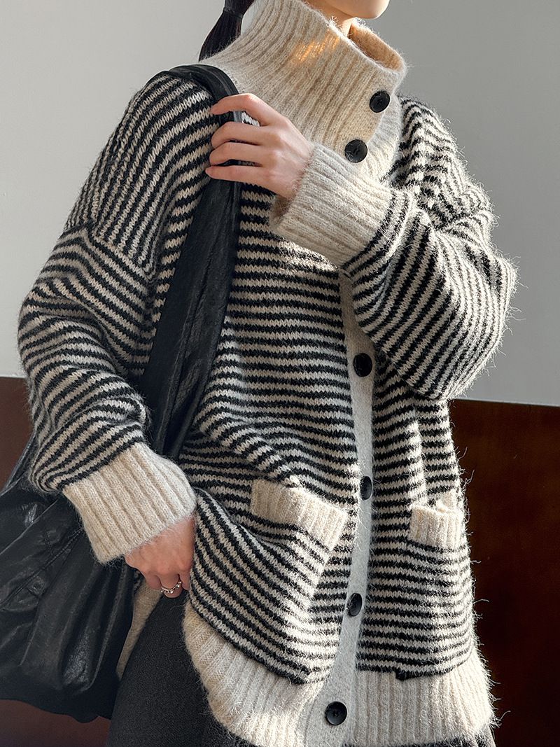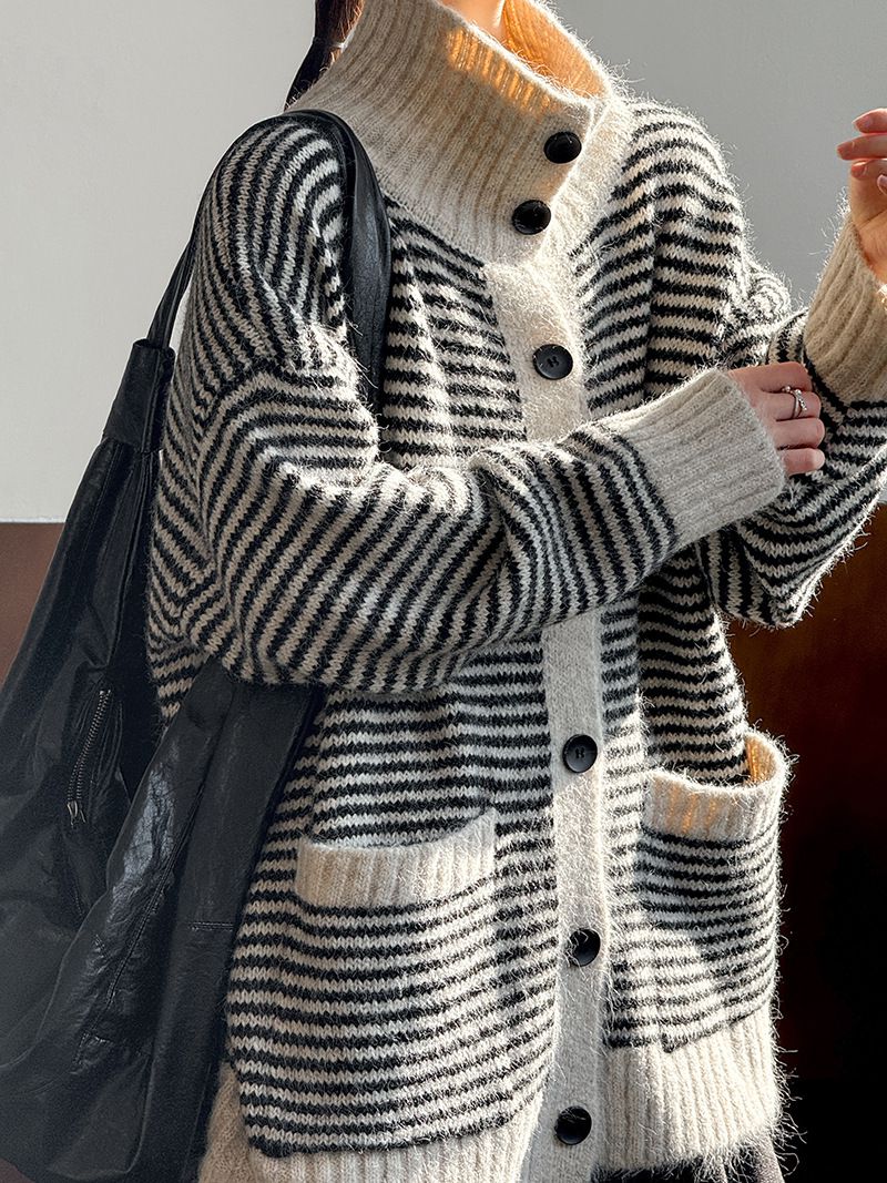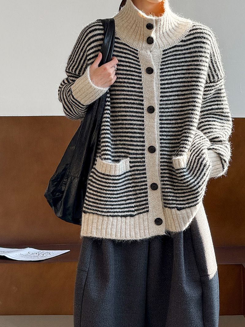 保暖混羊毛/經典條紋色/開襟排釦/立領.高領.翻領/寬鬆長版/連肩袖/雙口袋 - 休閒居家渡假配色條紋上衣混羊毛條紋外套針織衫針織外套長袖上衣針織上衣寬鬆大尺碼外套長版外套淺米色