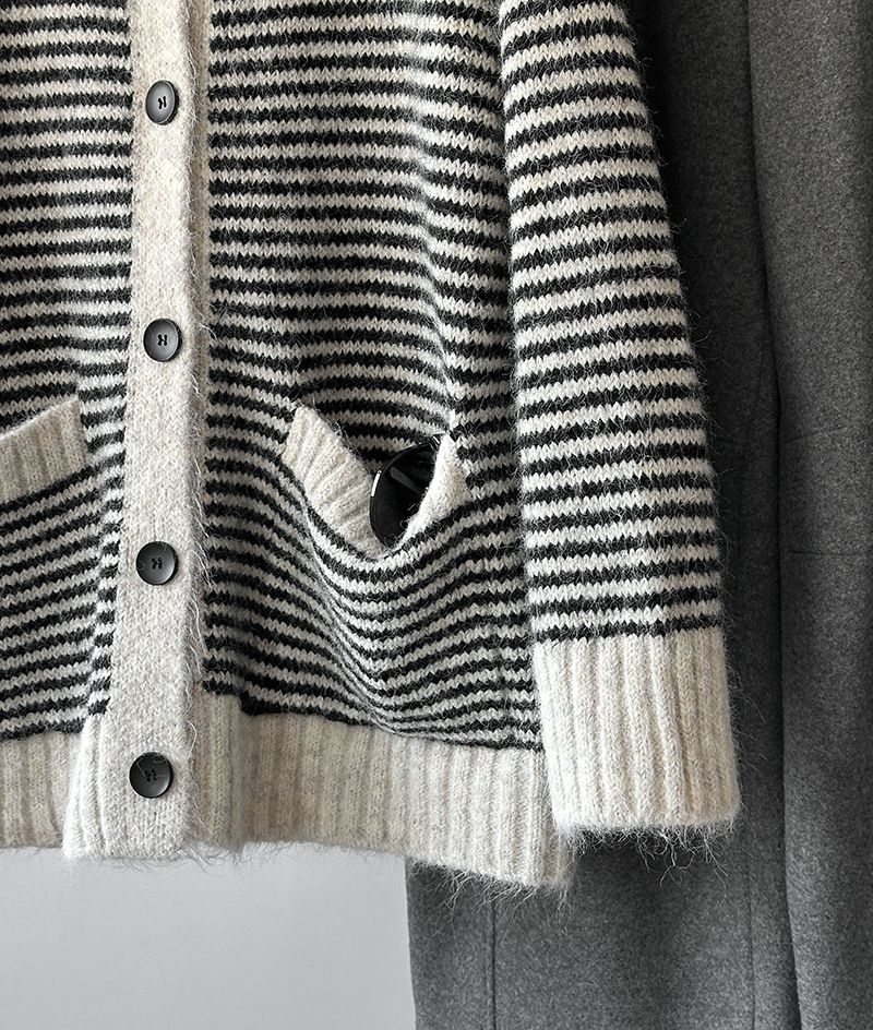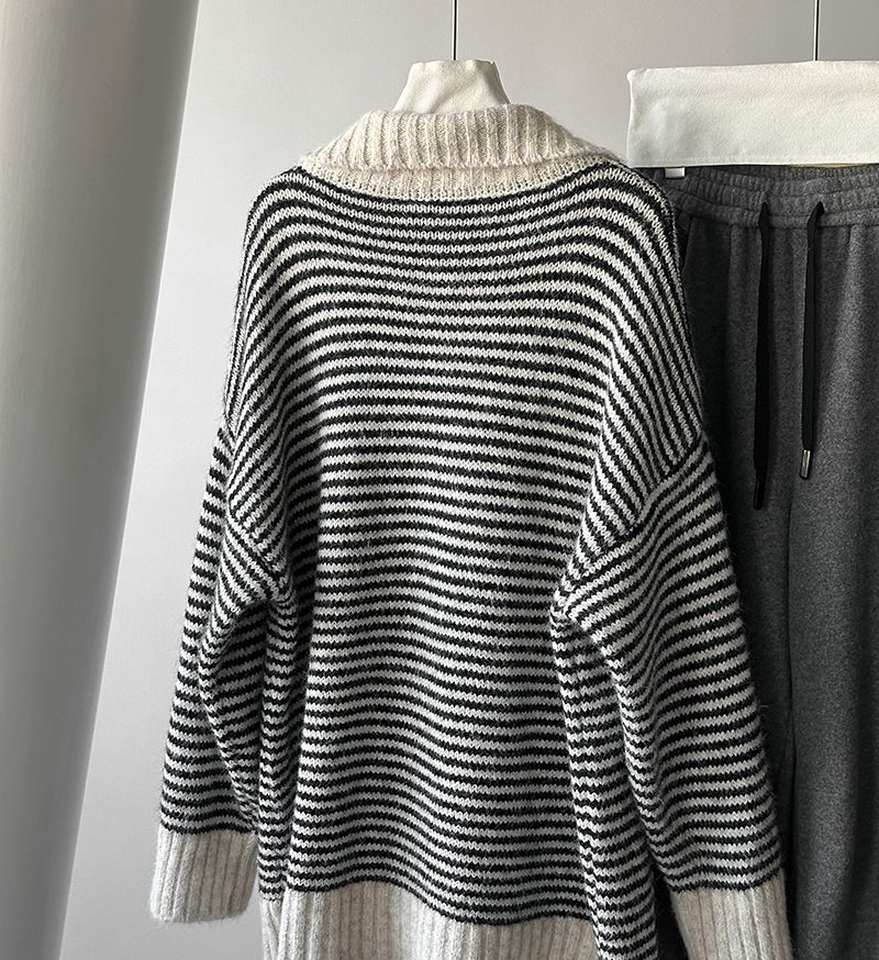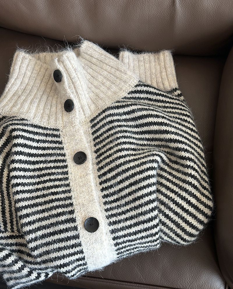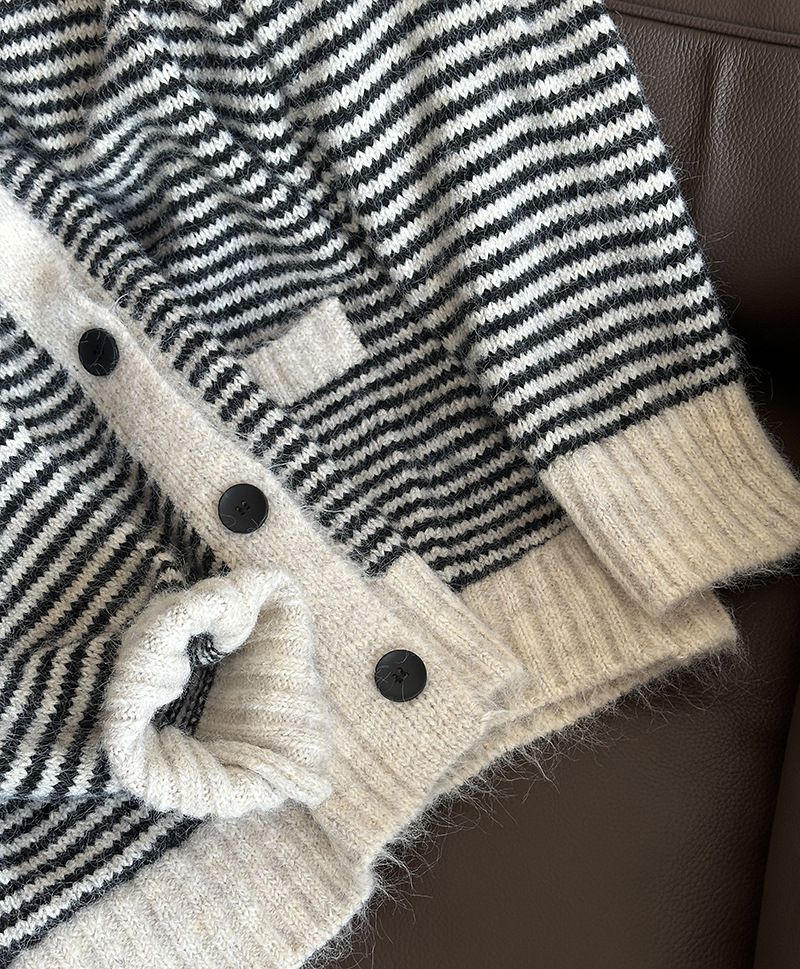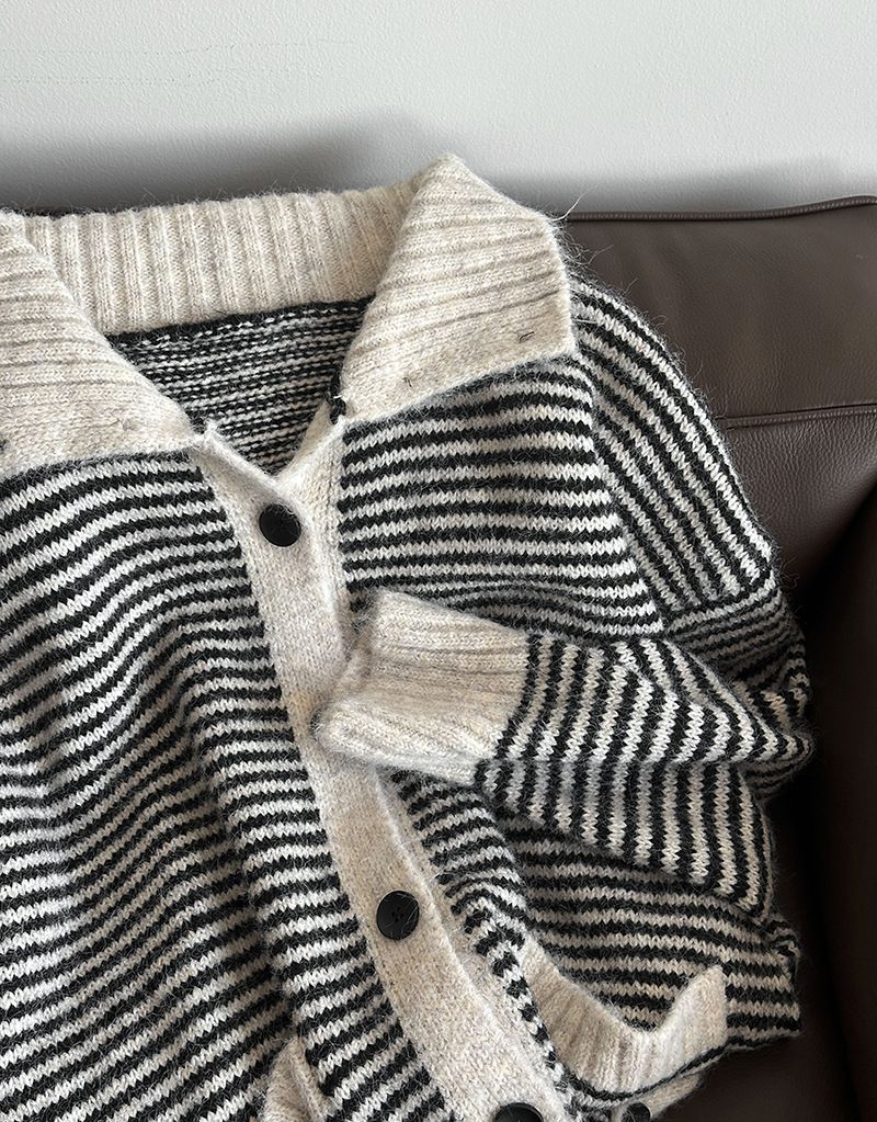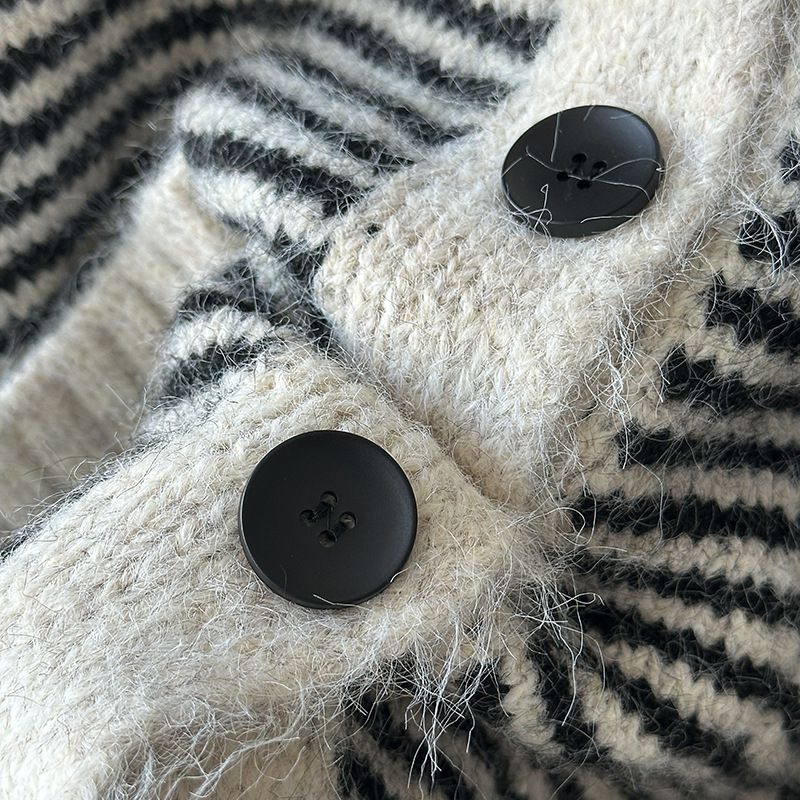 保暖混羊毛/經典條紋色/開襟排釦/立領.高領.翻領/寬鬆長版/連肩袖/雙口袋 - 休閒居家渡假配色條紋上衣混羊毛條紋外套針織衫針織外套長袖上衣針織上衣寬鬆大尺碼外套長版外套淺米色