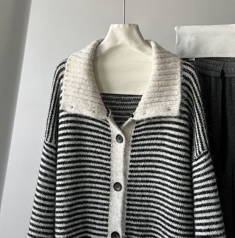 【C60040】品牌 混羊毛條紋外套-排釦立領寬鬆長版長袖針織上衣★★