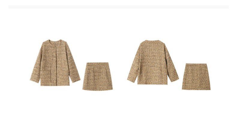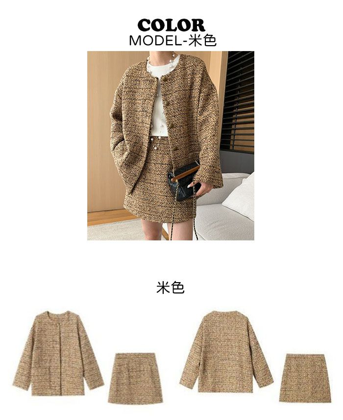 三種尺寸/超值兩件組/格紋毛呢套裝/圓領/開襟排釦/長版外套/雙口袋/後拉鍊短裙(無口袋) - 休閒婚禮OL上班族超值兩件組小香風套裝長袖外套長版外套拉鍊短裙子多尺寸SML米色